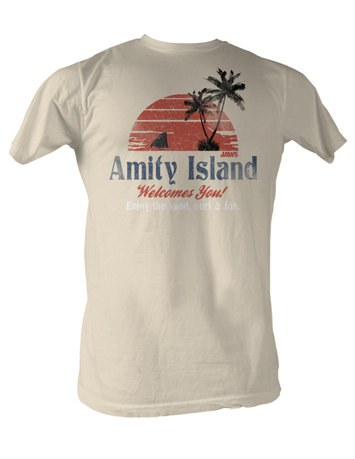 | | Jaws T-shirt Amity Island Adult Dirty White Tee ShirtThis Jaws T-shirt features a slogan that reads “Amity Island Welcomes You! Enjoy the Sand, Surf and Fun.” Our Jaws T-shirt is an awesome 100% preshrunk cotton t-shirt for any Jaws fan. Jaws is a great 1975 American Horror Film. Available in Small, Medium, Large, XL & 2XL! Officially Licensed! |