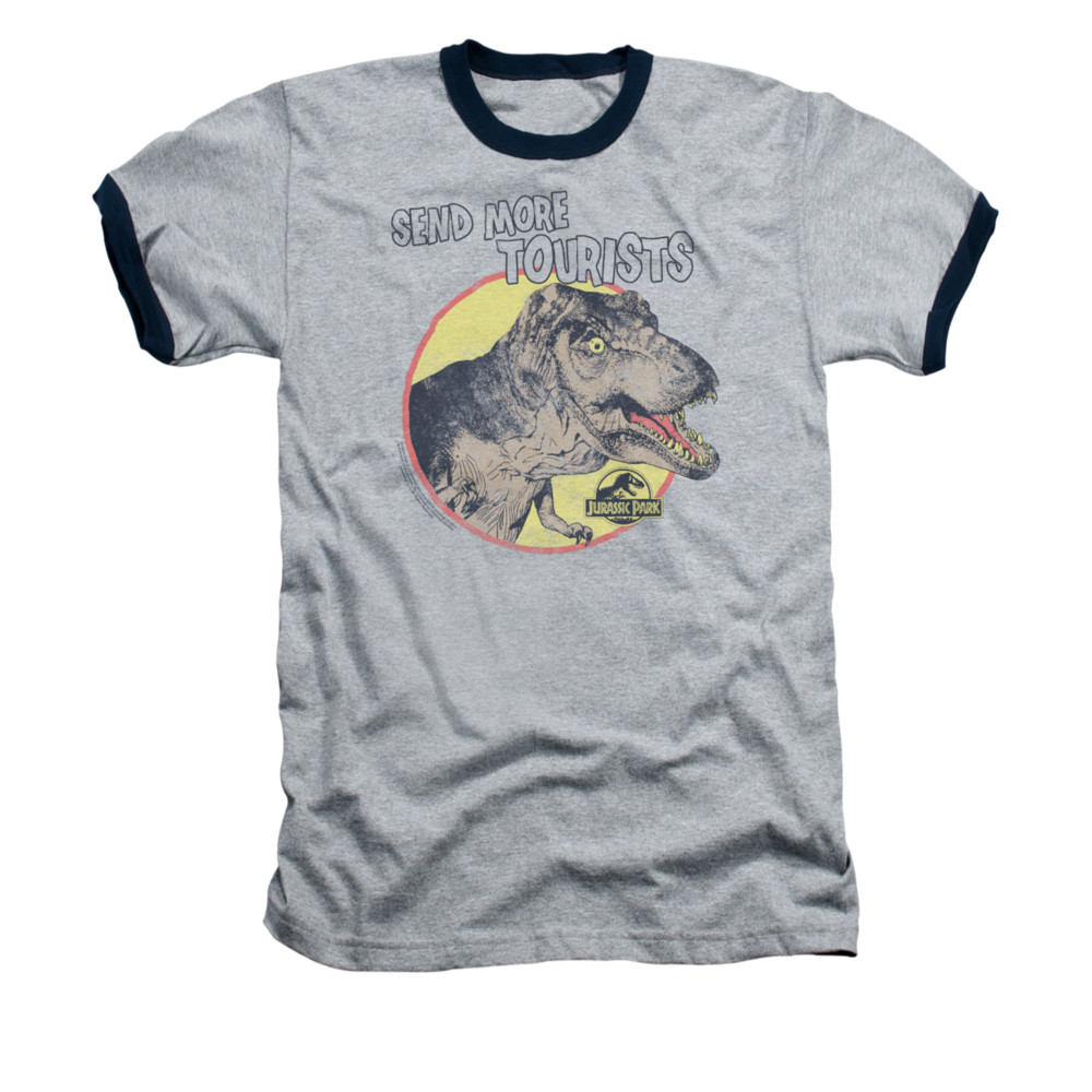 | | Jurassic Park Ringer Shirt More Tourists Adult Heather/Navy Tee T-ShirtJurassic Park Ringer Shirt More Tourists Adult Heather/Navy Tee T-Shirt Officially Licensed Available in Small, Medium, Large, XL, 2XL & 3XL Our Jurassic Park shirts is an American sci-fi classic film perfect for any fans of this action movie. ![]() |