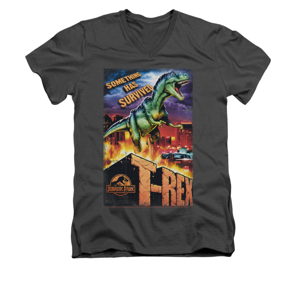 | | Jurassic Park Shirt Slim Fit V Neck Rex In The City Charcoal Tee T-ShirtJurassic Park Shirt Slim Fit V Neck Rex In The City Charcoal Tee T-Shirt Officially Licensed Available in Small, Medium, Large, XL & 2XL Our Jurassic Park shirts is an American sci-fi classic film perfect for any fans of this action movie. ![]() |