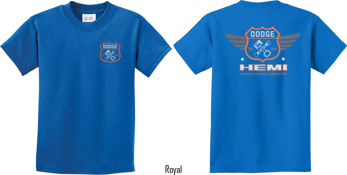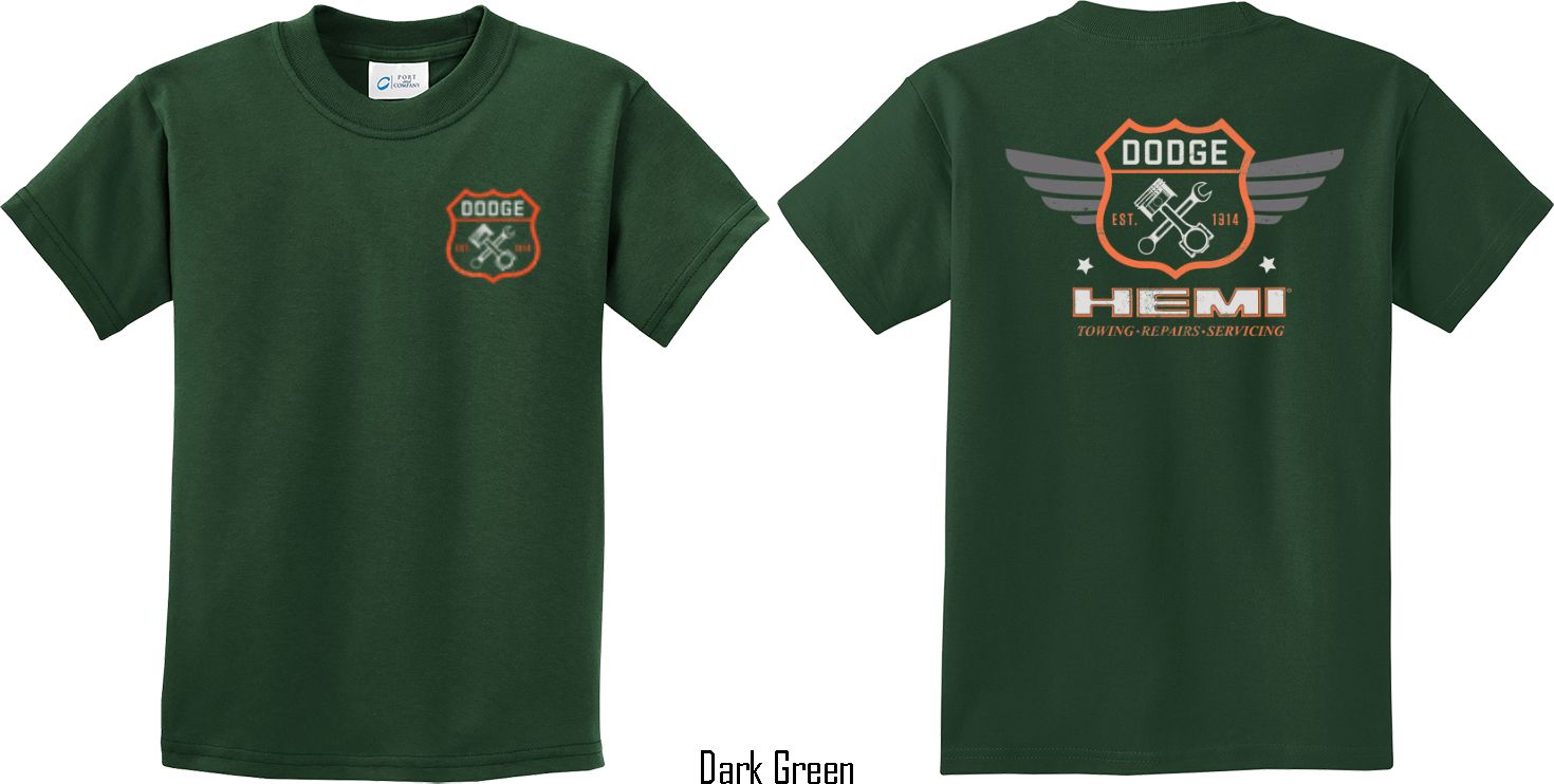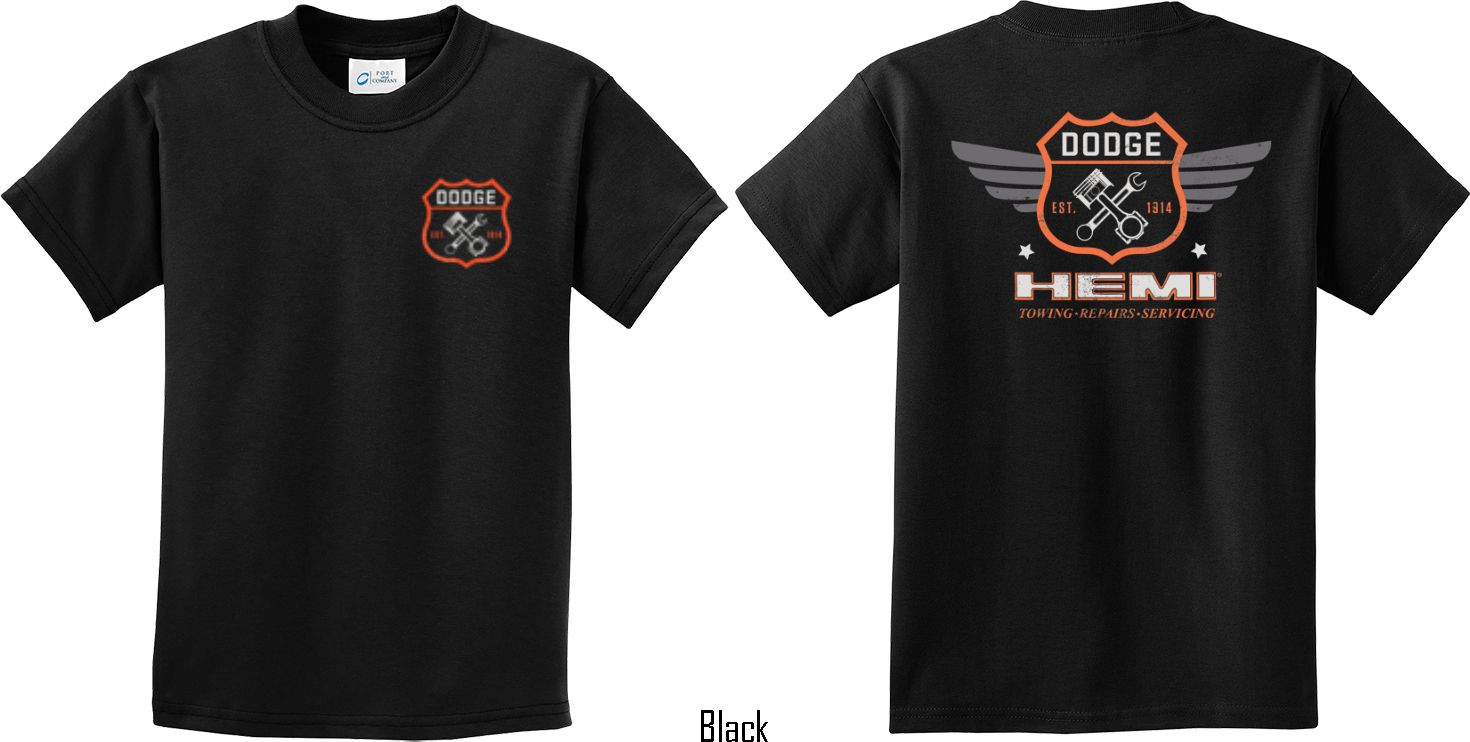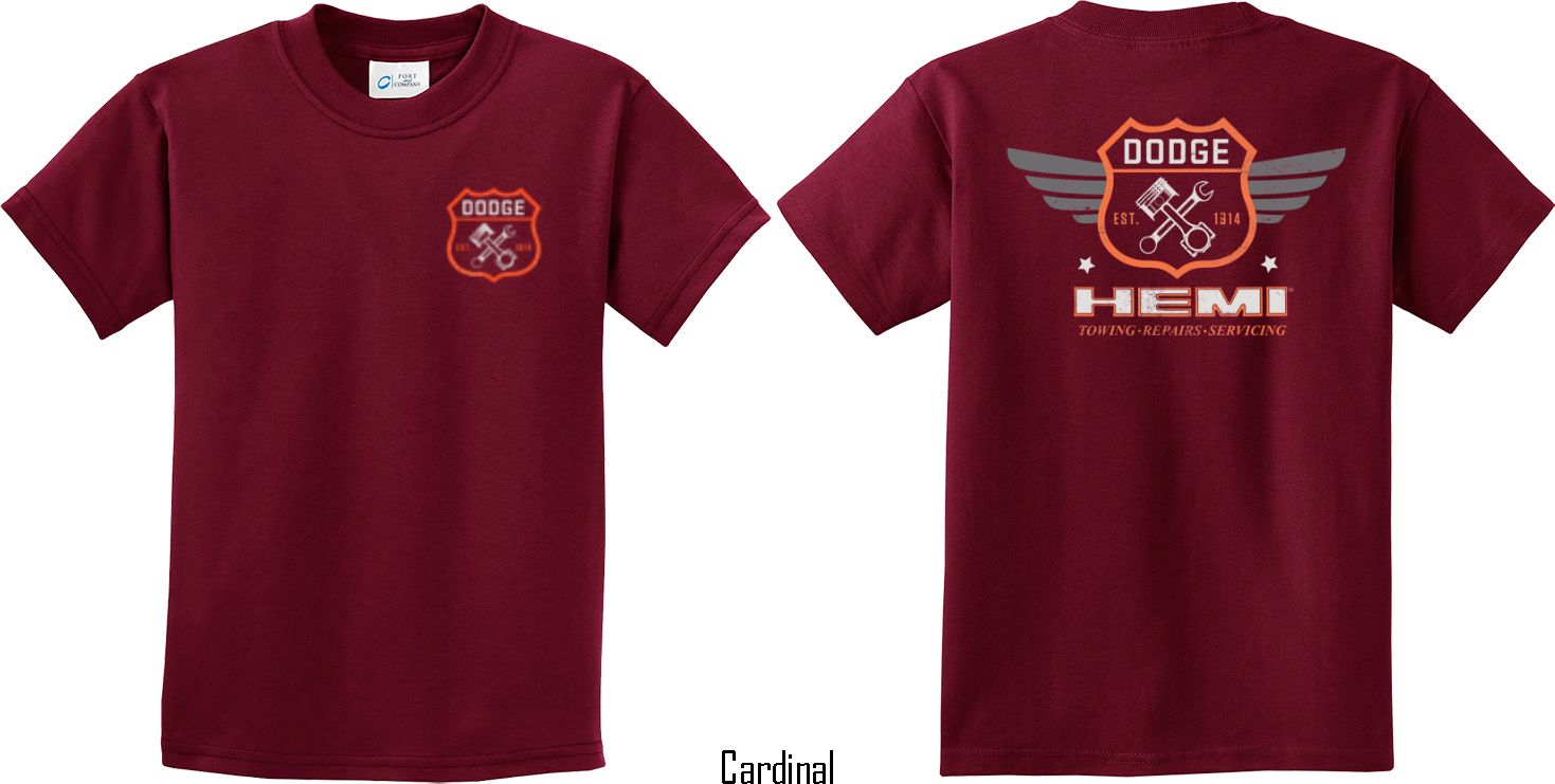 | | Kids Dodge Tee Garage Hemi (Front & Back) Youth T-shirtA youth t-shirt featuring Dodge Garage Est. 1914 on the front and back Hemi: Towing, Repairs, Servicing. This kids tee makes an awesome gift for all Dodge car enthusiasts! Our youth shirt is made of 100% cotton. Available in sizes Small through XL. Machine wash cold with like colors; dry low heat. ![]() |