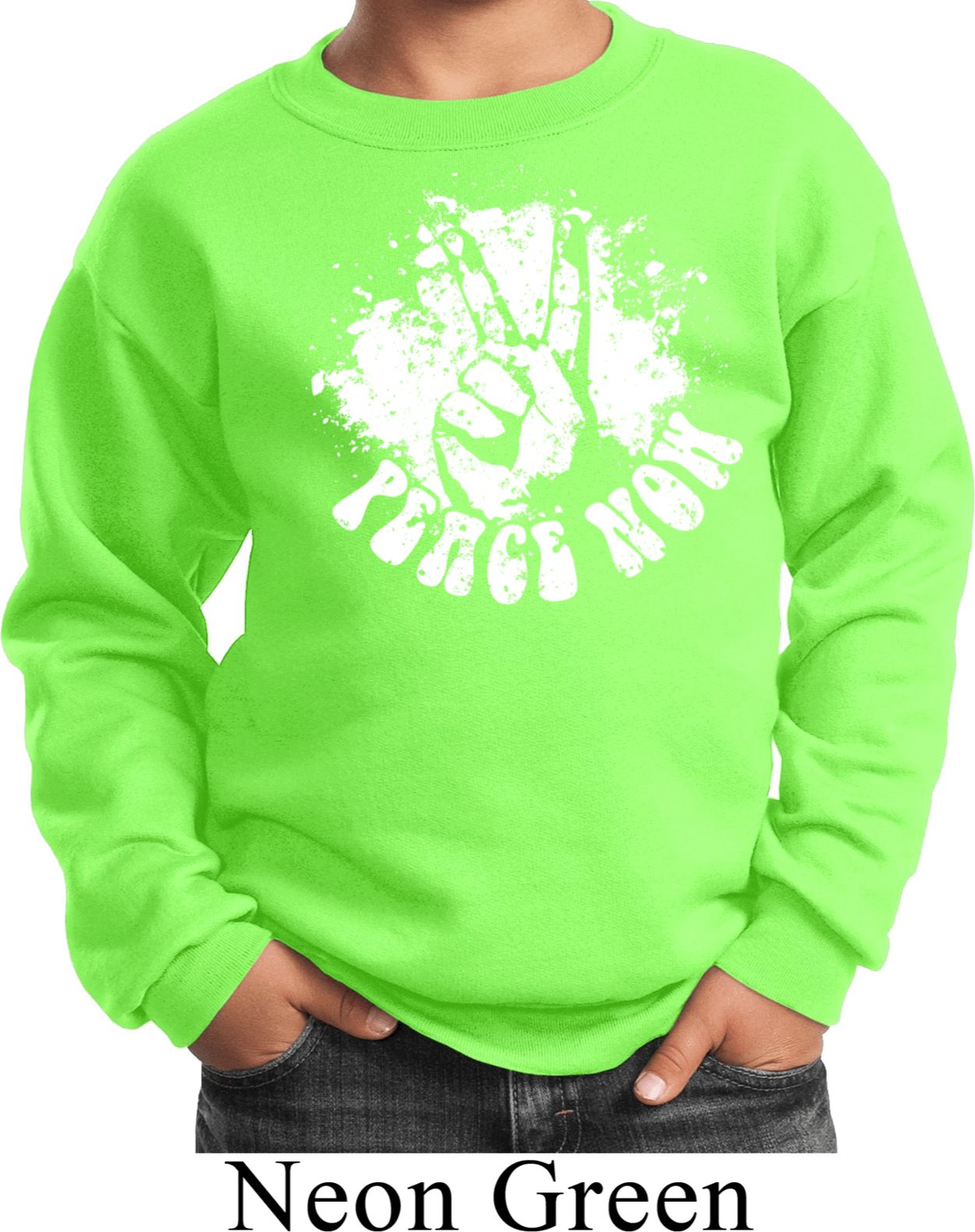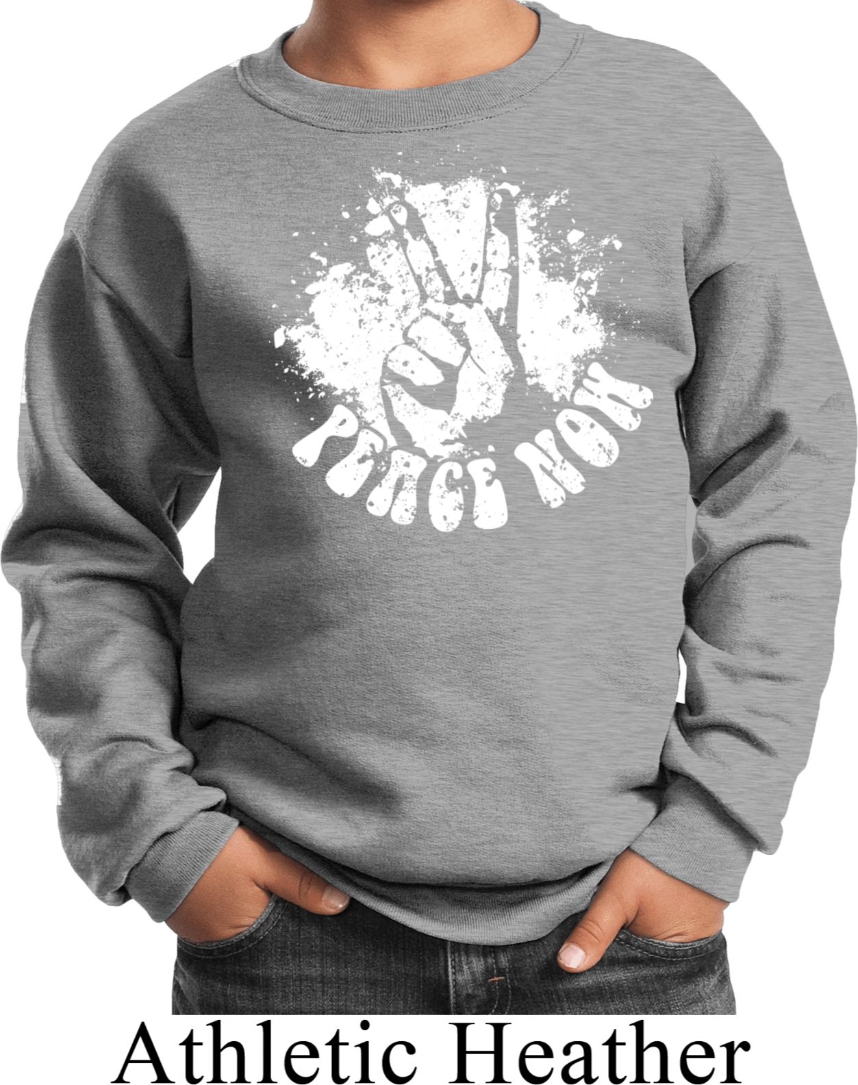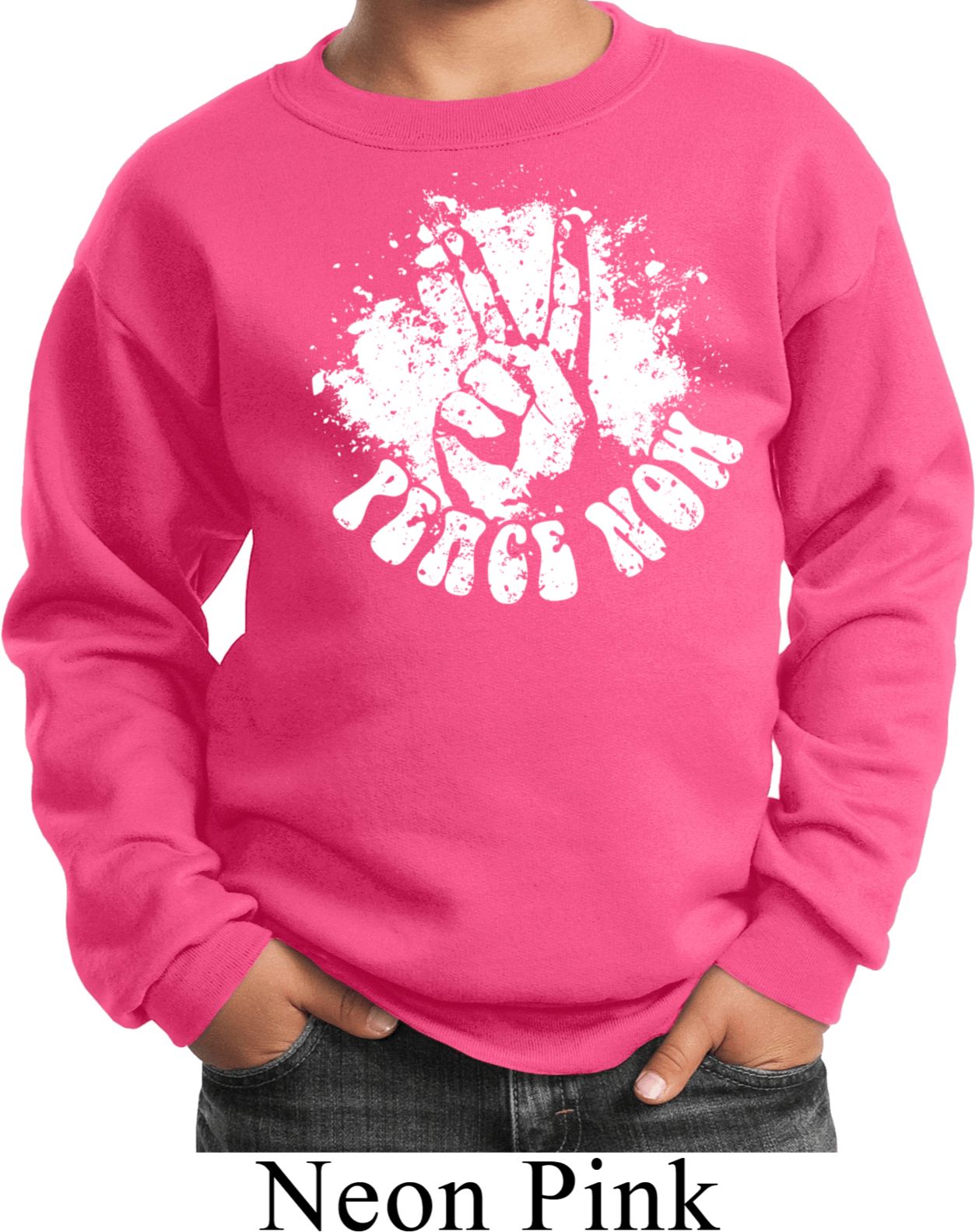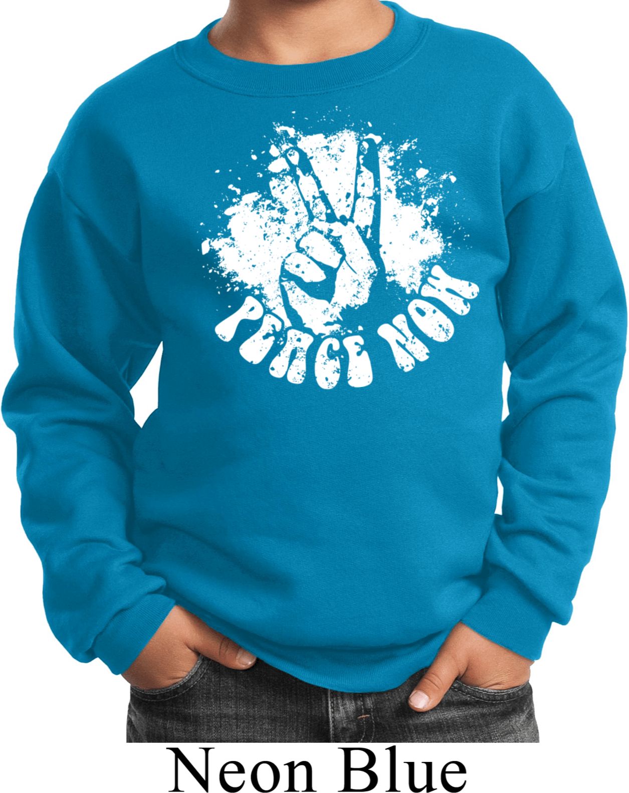 | | Kids Peace Sweatshirt Peace Now Sweat ShirtKids Peace Sweatshirt Peace Now Sweat Shirt A cotton/poly blend Available in Youth Small, Youth Medium, Youth Large & Youth XL Also available in colors Athletic Heather, Black, Carolina Blue, Charcoal, Dark Green, Kelly Green, Lime, Maroon, Navy, Neon Blue, Neon Green, Neon Orange, Neon Pink, Neon Yellow, Orange, Pale Pink, Purple, Red, Royal, and Sangria ![]() |