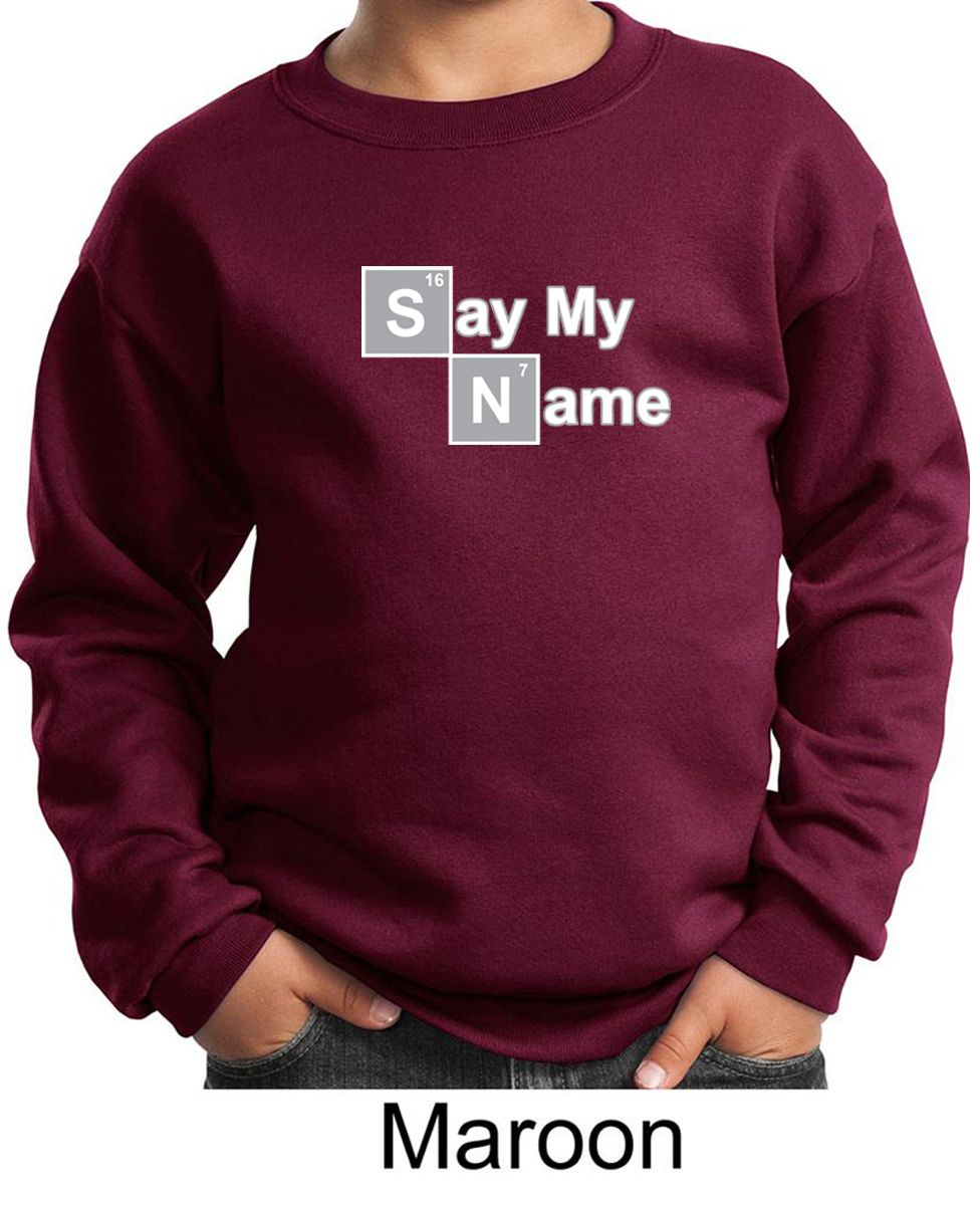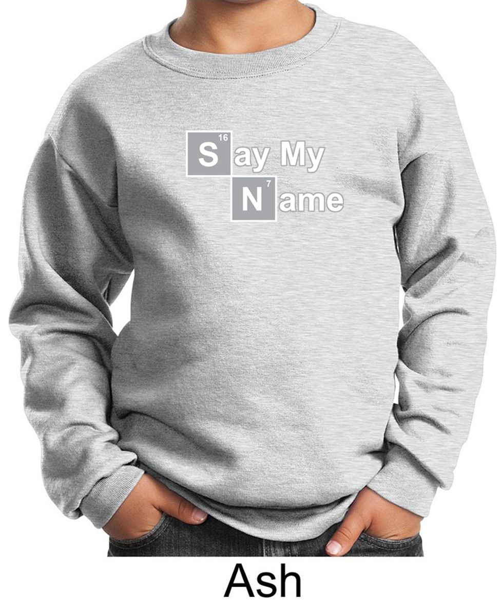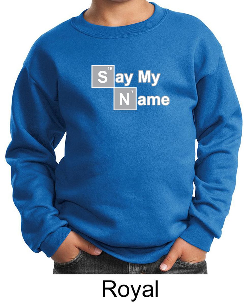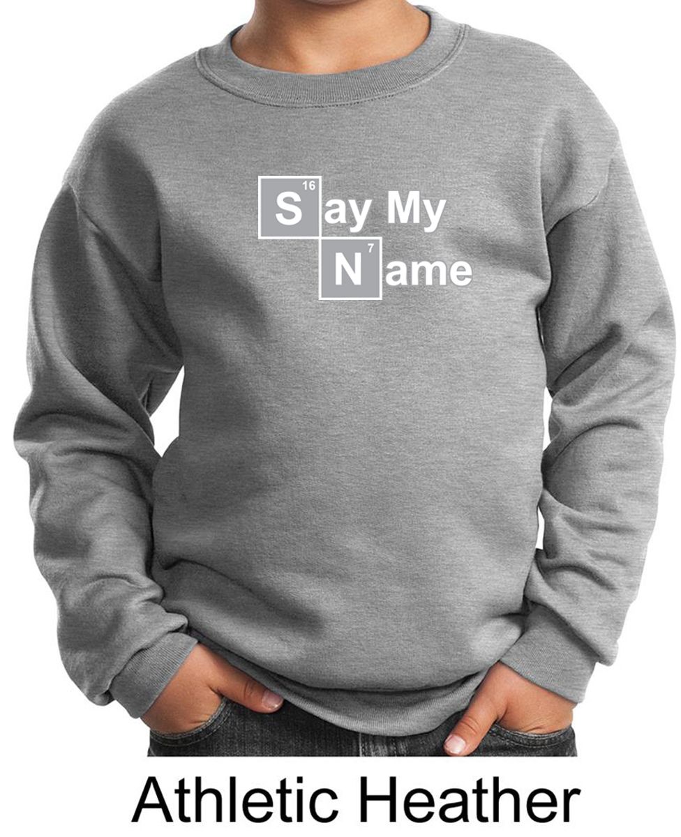 | | Kids Sweatshirt Say My Name Sweat ShirtKids Sweatshirt Say My Name Sweat Shirt A cotton/poly blend Available in Youth Small, Youth Medium, Youth Large & Youth XL Also available in colors Ash, Athletic Heather, Black, Dark Green, Maroon, Navy, Red, Royal, and White ![]() |