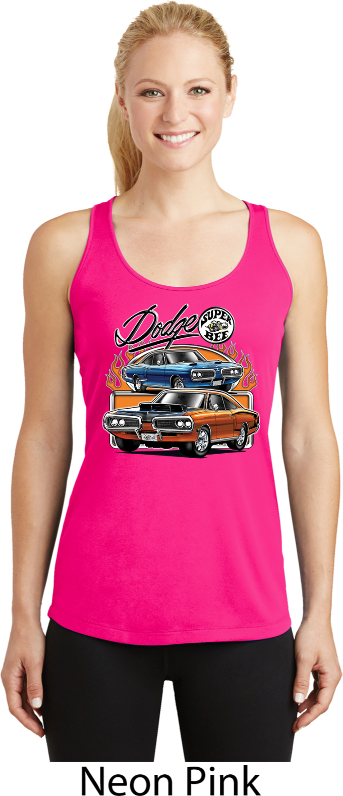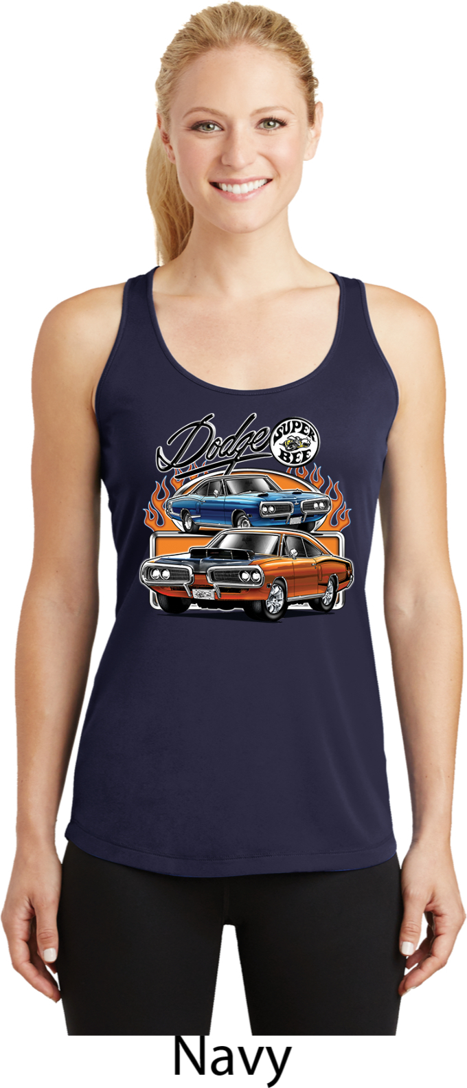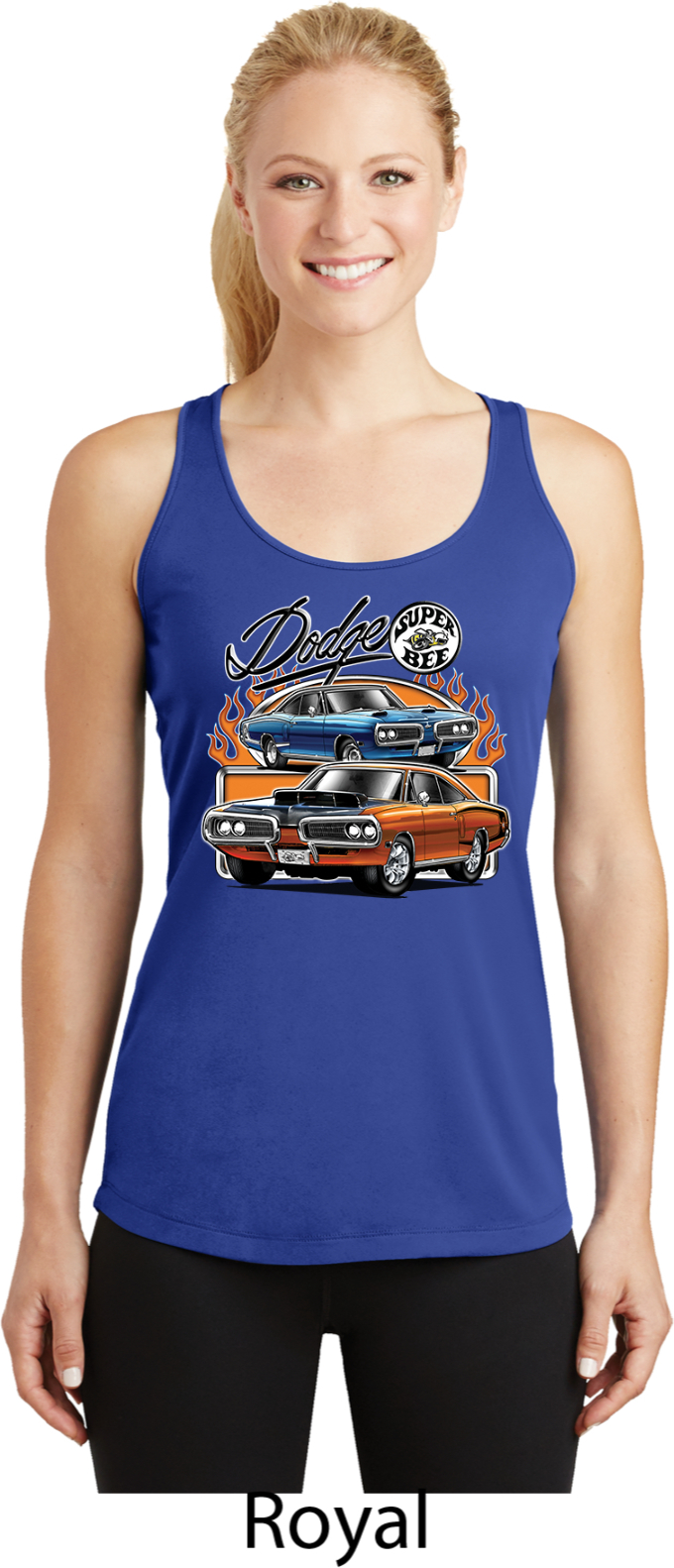 | | Ladies Dodge Blue and Orange Super Bee Dry Wicking RacerbackA ladies dry wicking racerback featuring a blue and orange Dodge Super Bee. Our ladies tanktop is made of 100% polyester. Available in sizes Small through 4XL. Machine wash cold with like colors; dry low heat. ![]() |