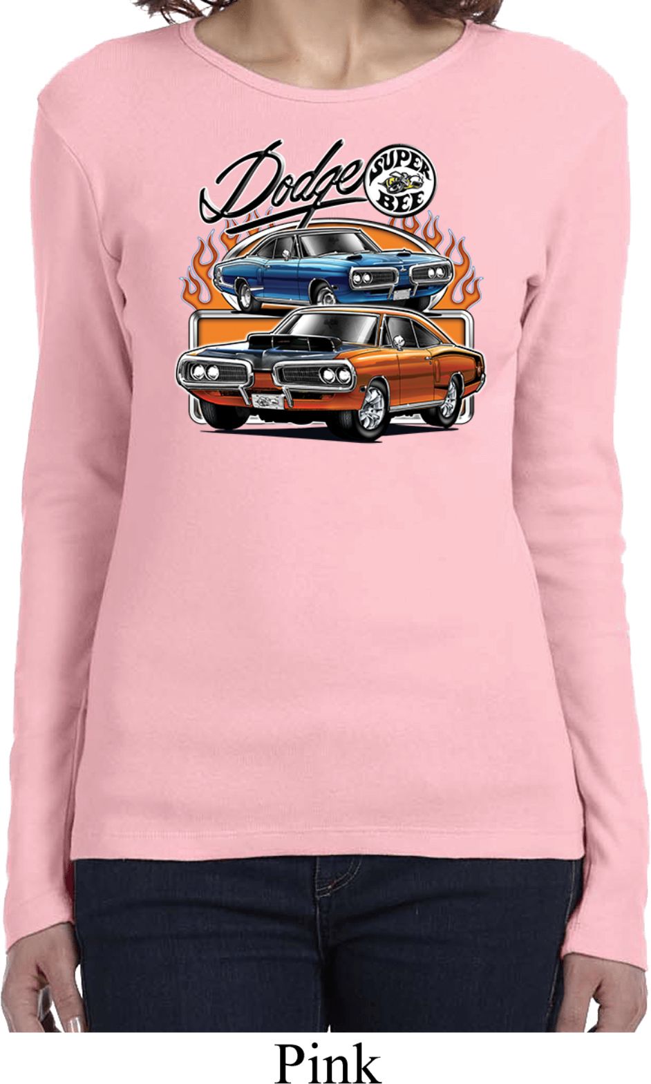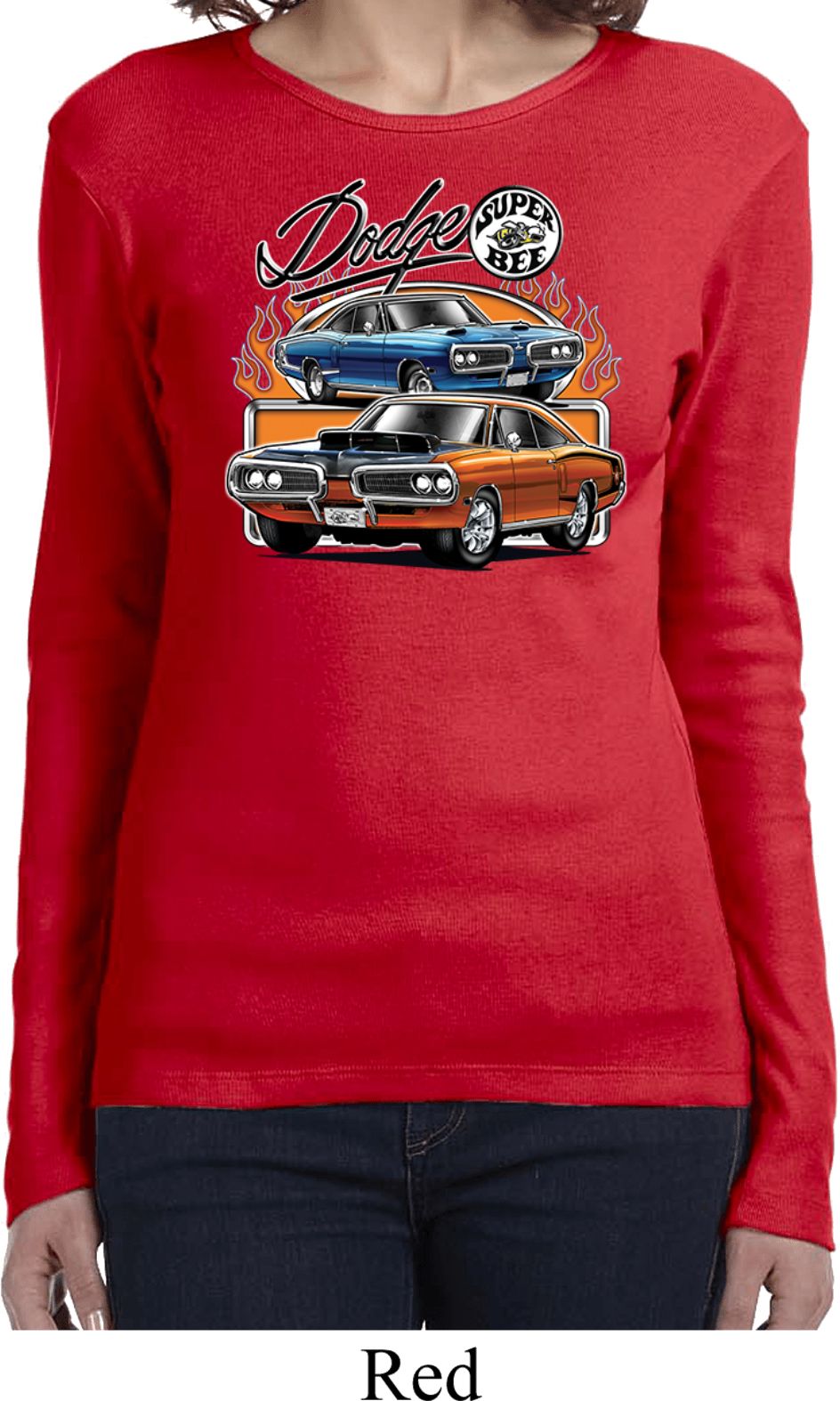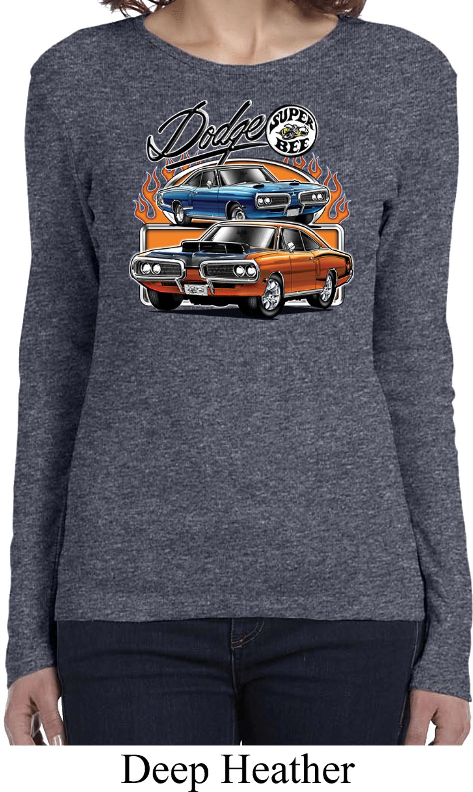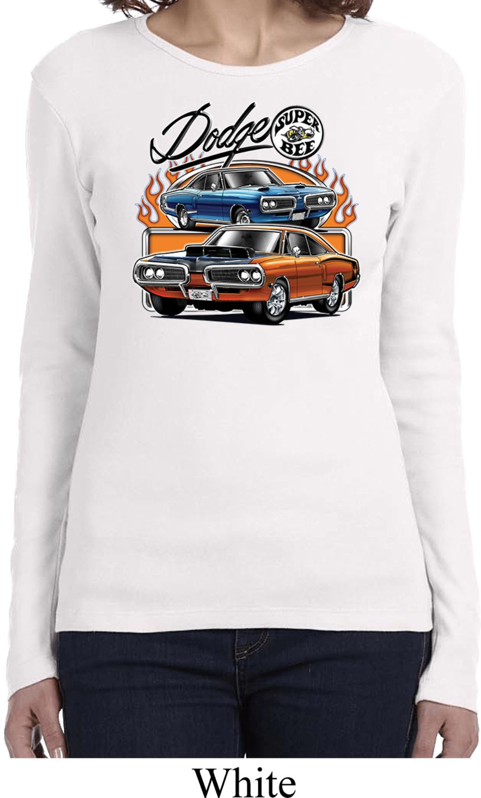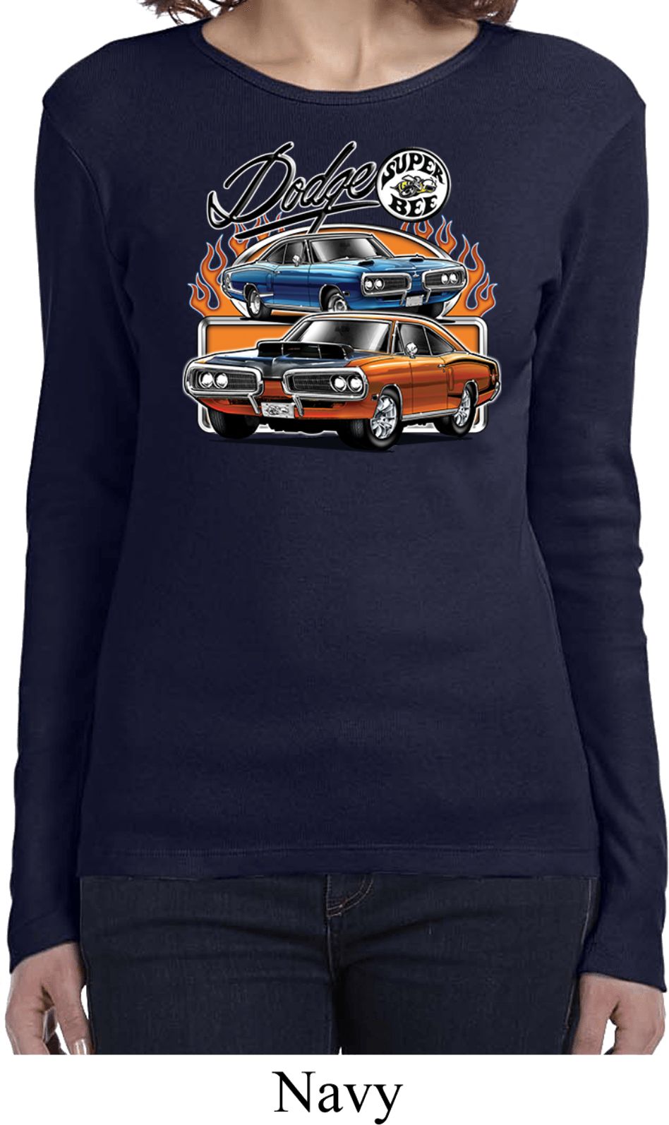 | | Ladies Dodge Blue and Orange Super Bee Long SleeveA ladies long sleeve featuring a blue and orange Dodge Super Bee. Our ladies shirt is made of 100% cotton. (Deep Heather is made with a blend of cotton/poly) Available in sizes Small through 2XL. Machine wash cold with like colors; dry low heat. ![]() |