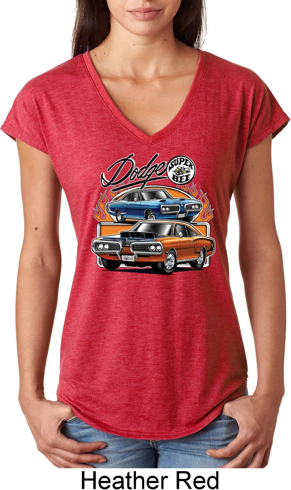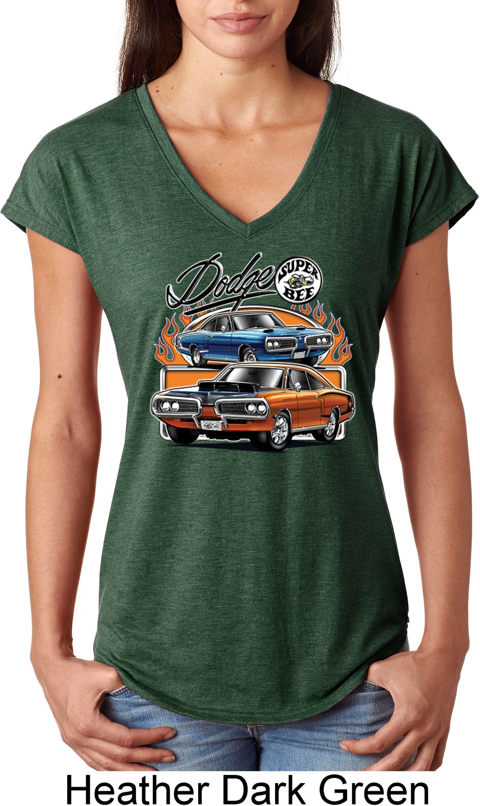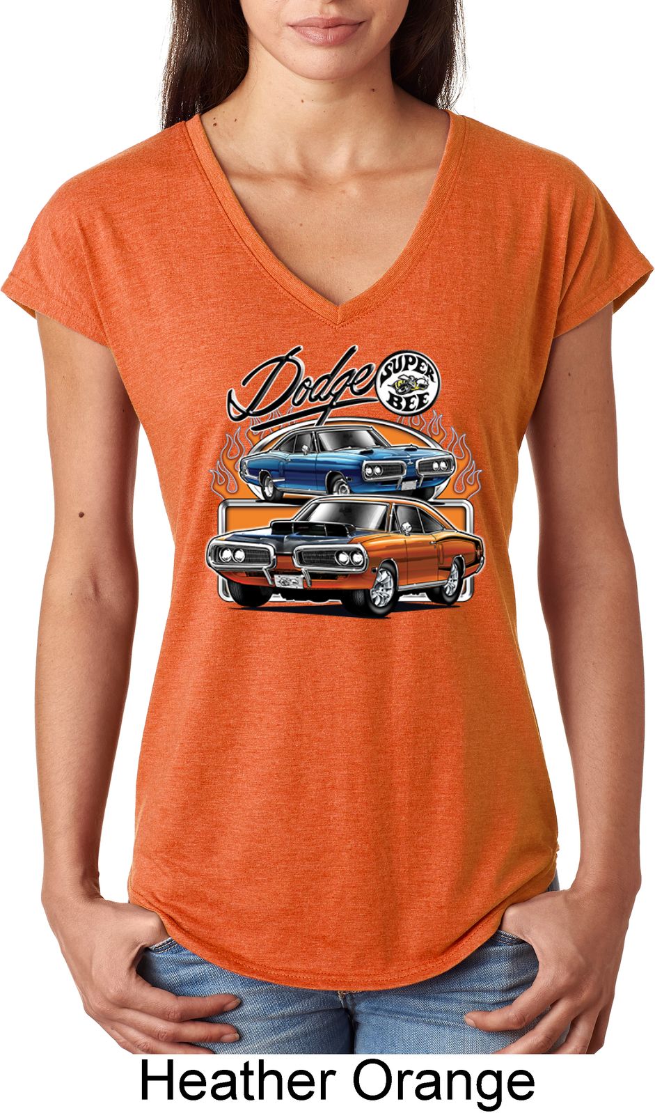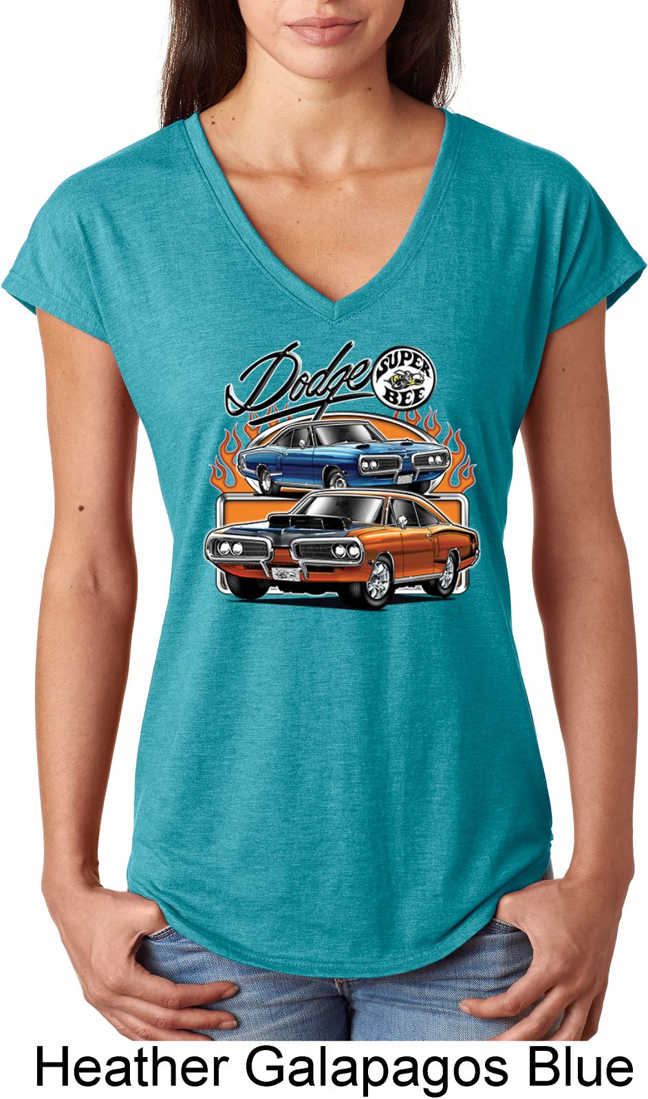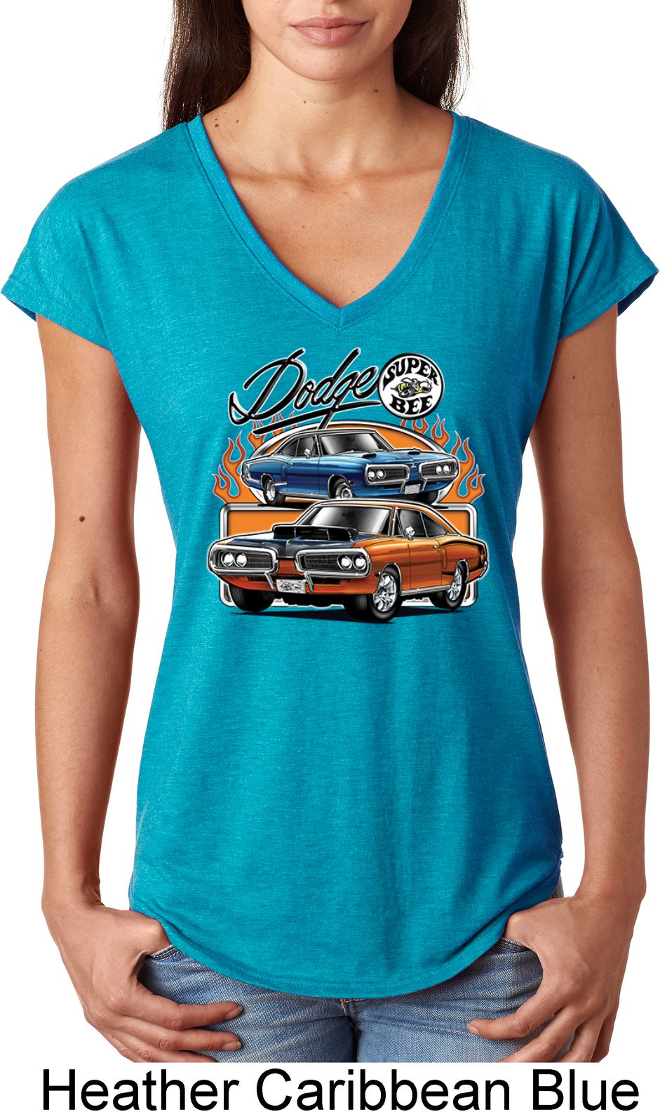 | | Ladies Dodge Blue and Orange Super Bee Tri Blend V-neckA soft ladies v-neck featuring a blue and orange Dodge Super Bee. Our ladies shirt is made with a blend of cotton/poly/rayon. Available in sizes Small through 2XL. Machine wash cold with like colors; dry low heat. ![]() |