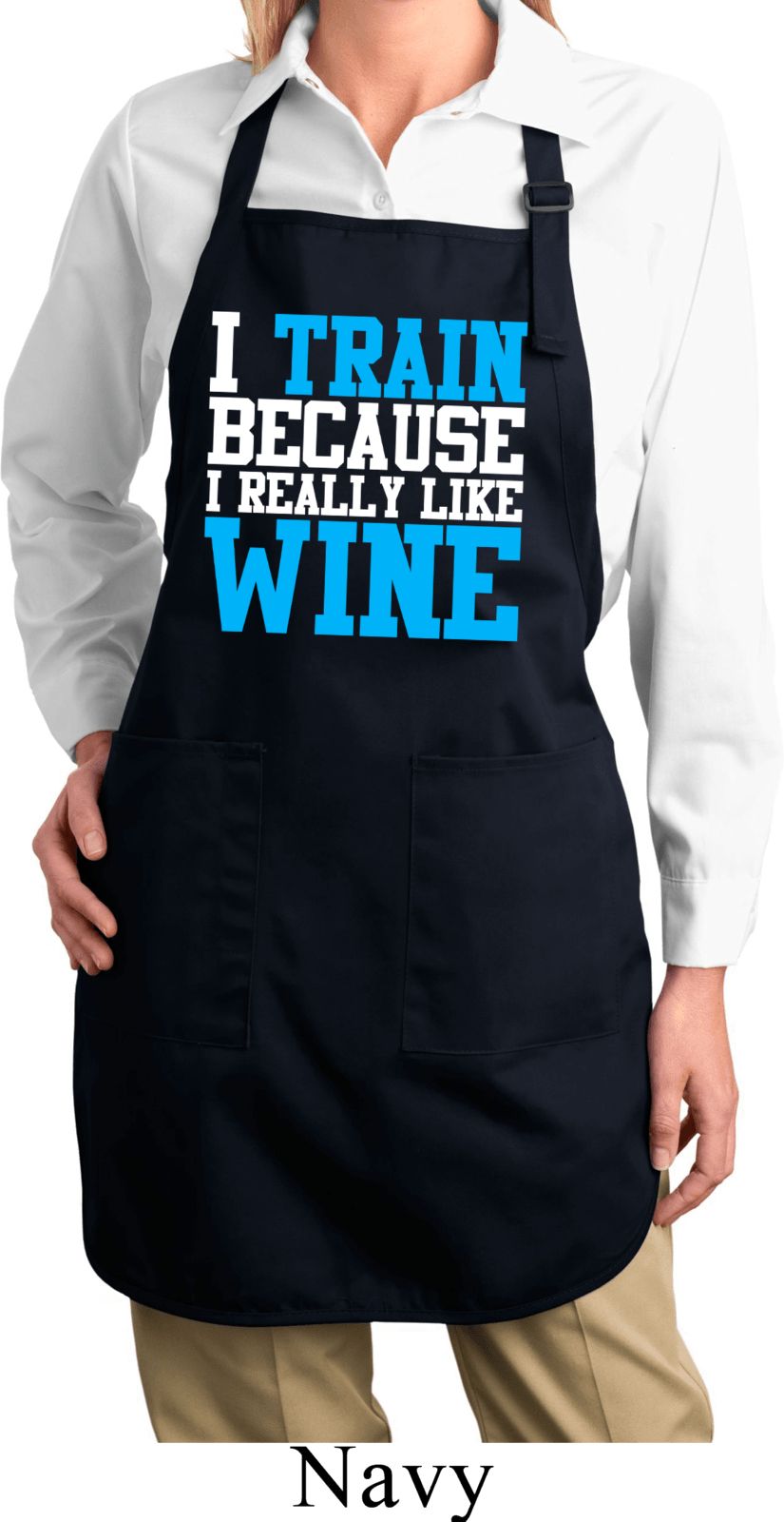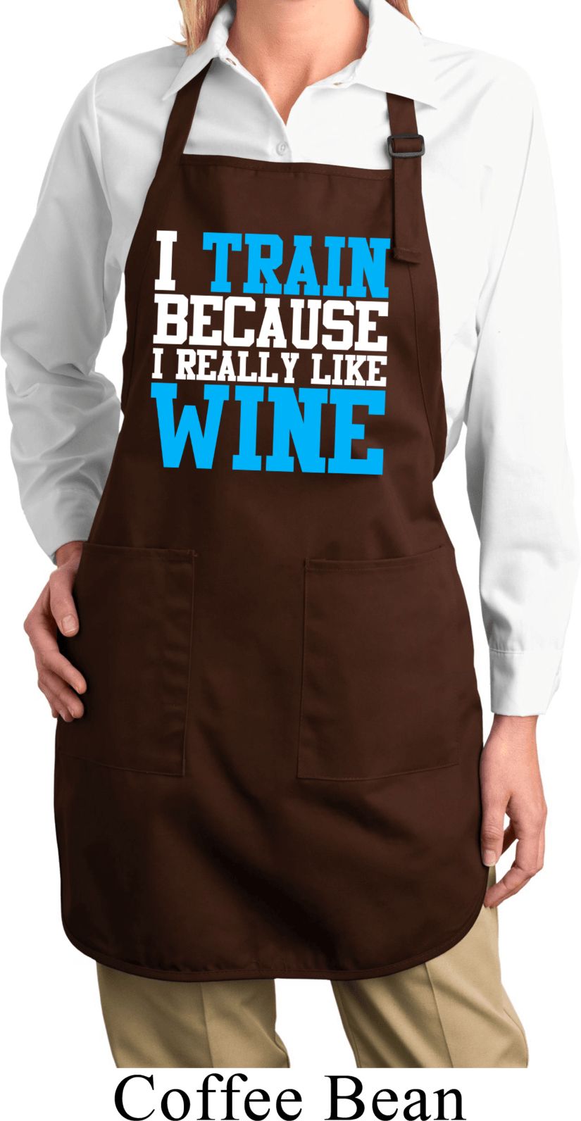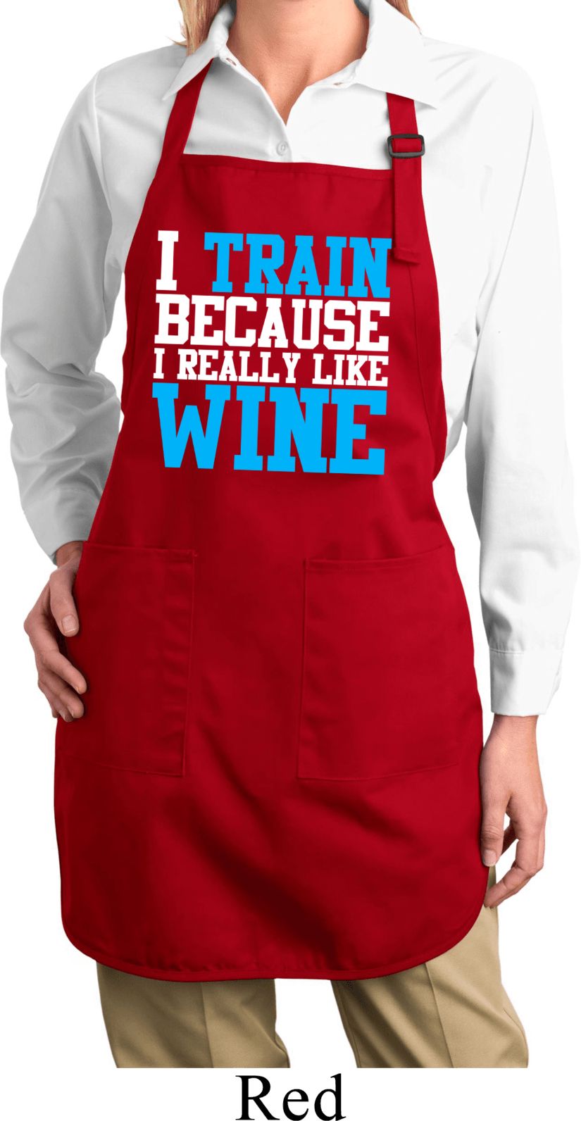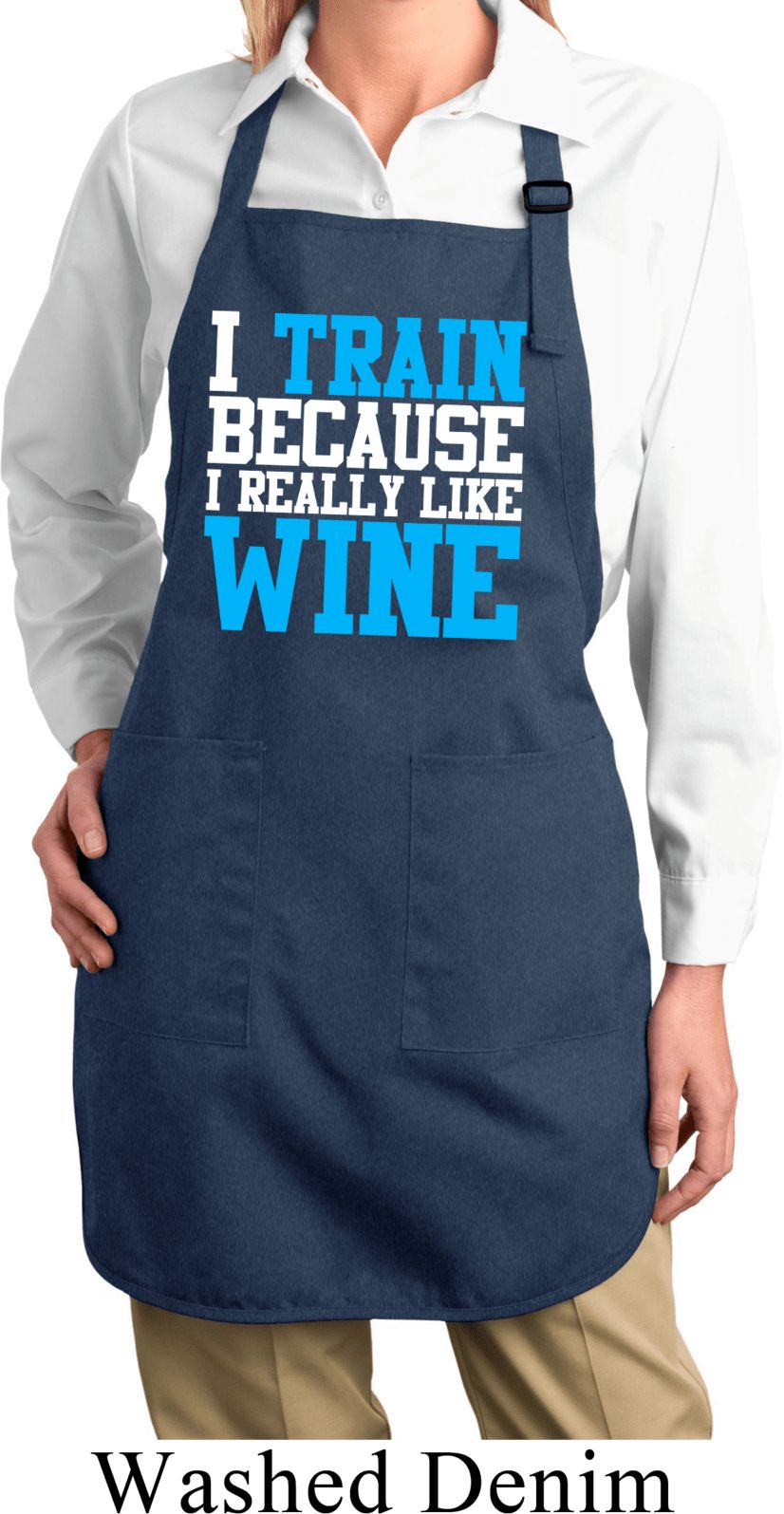 | | Ladies Fitness Apron I Train For Wine Full Length Apron with PocketsLadies Fitness Apron I Train For Wine Full Length Apron with Pockets A 100% cotton twill One Size Also available in colors Black, Coffee, Hunter Green, Maroon, Navy, Red, Royal, and Washed Denim |