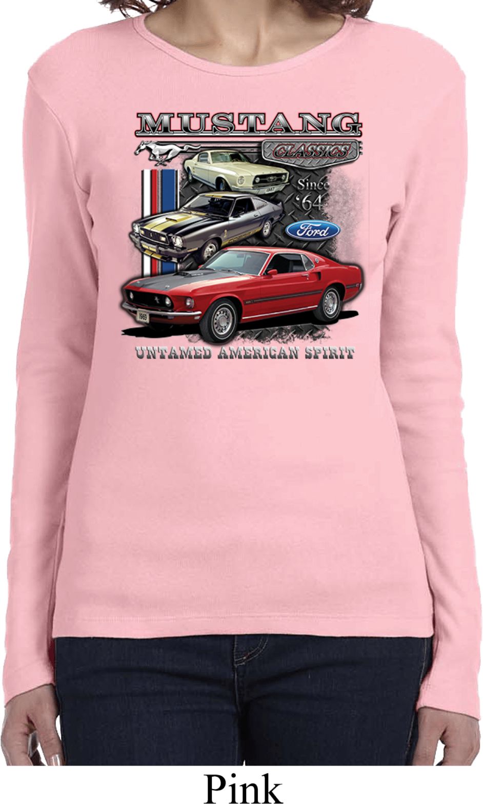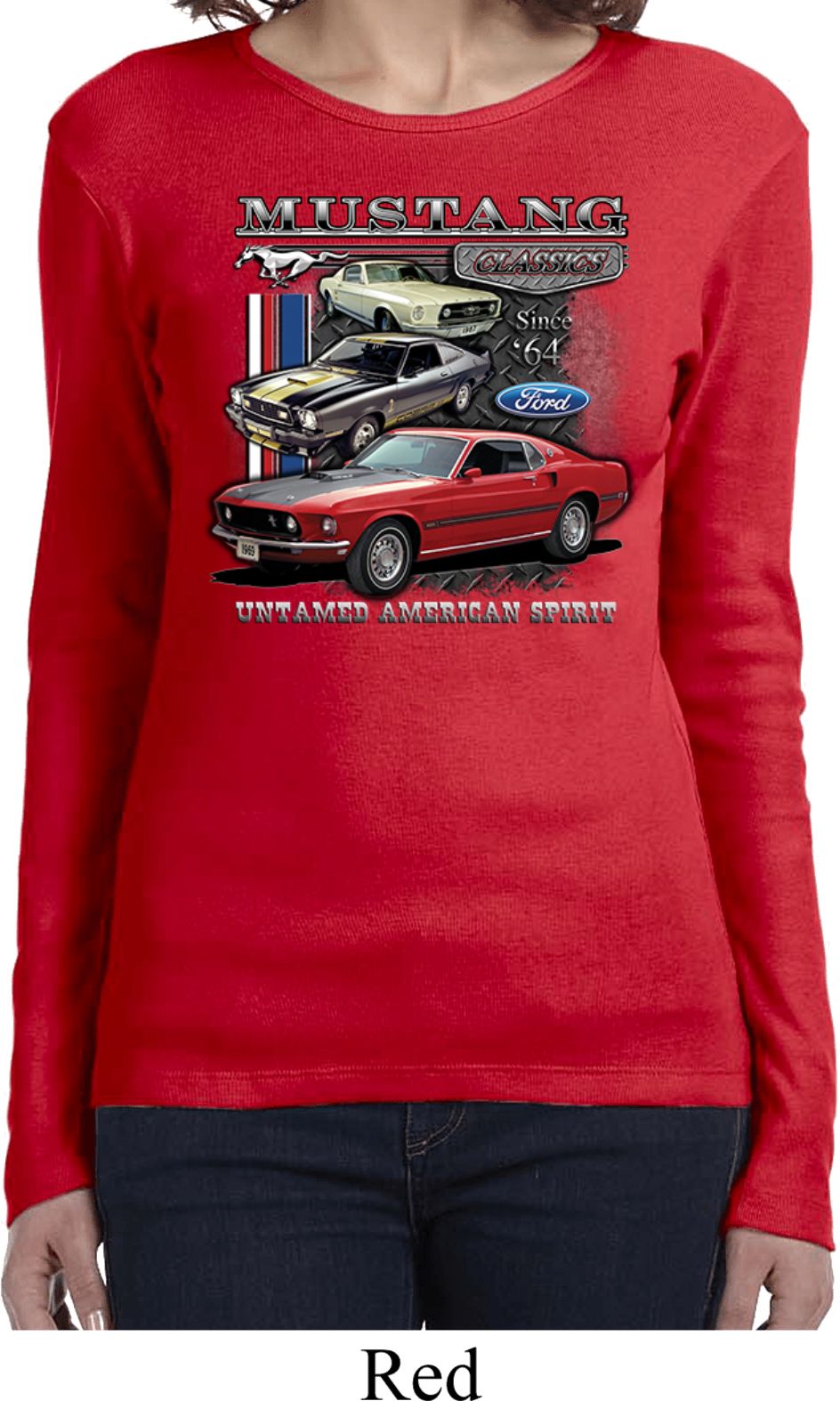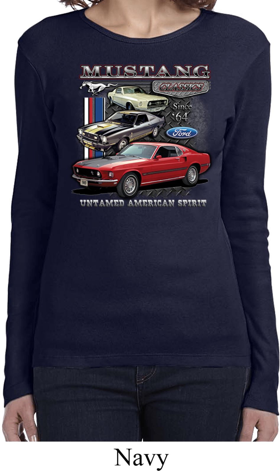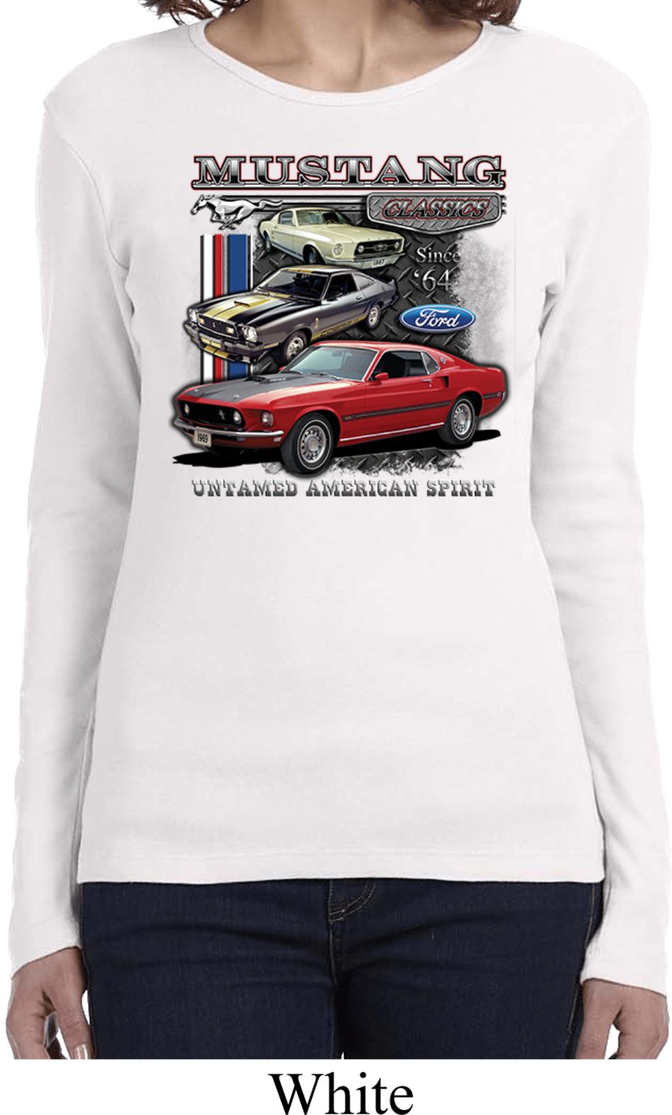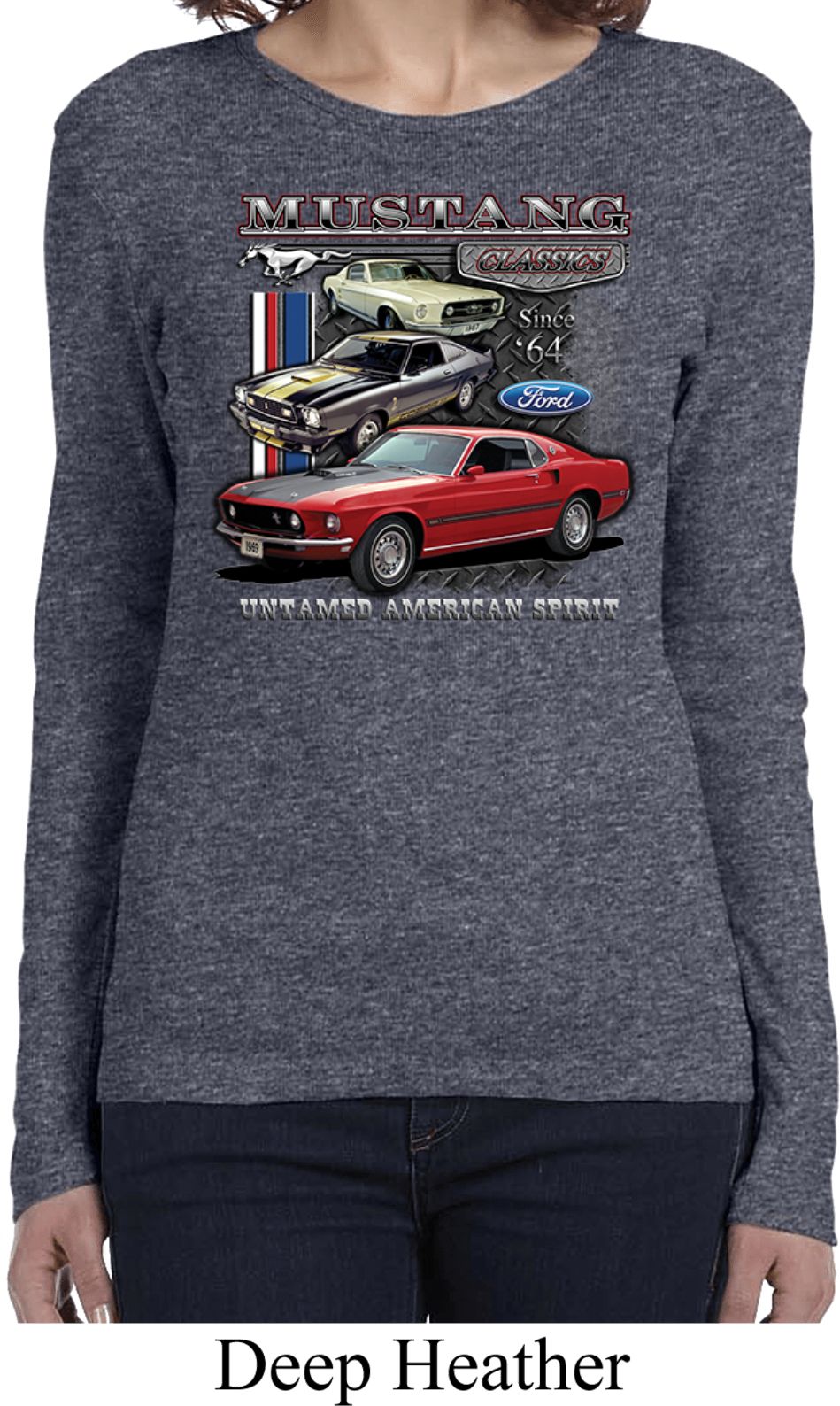 | | Ladies Ford Classic Mustangs Untamed Long SleeveA ladies long sleeve featuring Ford Mustang Classics since 1964, Untamed American Spirit. Our ladies shirt is made of 100% cotton. (Deep Heather is made with a blend of cotton/poly) Available in sizes Small through 2XL. Machine wash cold with like colors; dry low heat. ![]() |