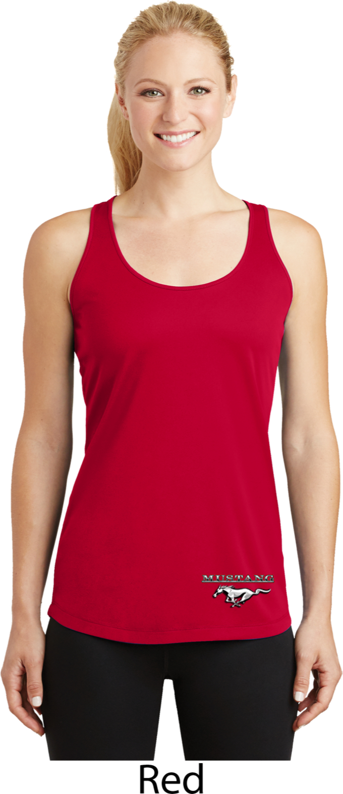 A ladies dry wicking racerback featuring Ford Mustang. Our ladies tanktop is made of 100% polyester. Available in sizes Small through 4XL. Machine wash cold with like colors; dry low heat.