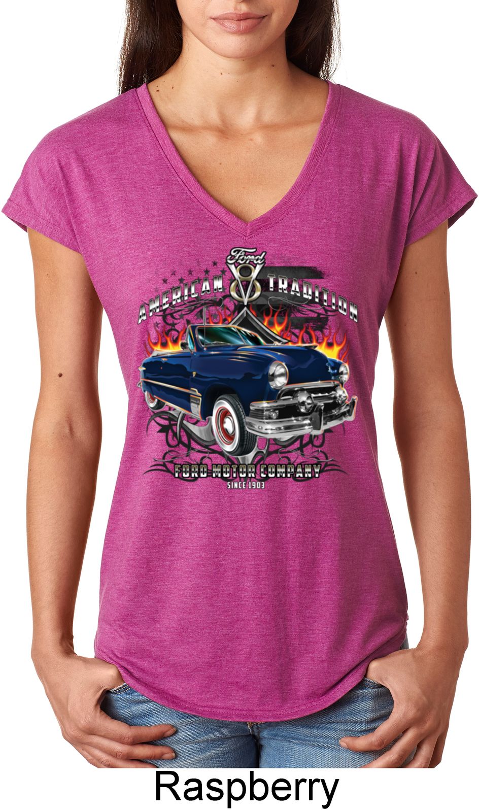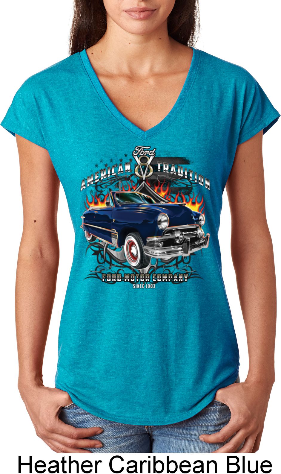 | | Ladies Ford Shirt American Tradition Tri Blend V-Neck ShirtLadies Ford Shirt American Tradition Tri Blend V-Neck Shirt A cool shirt to wear to a car show Great for anyone who is proud to be an American A poly/cotton/rayon blend Available in Ladies Small, Ladies Medium, Ladies Large, Ladies XL & Ladies 2XL Also available in colors Black, Heather Aubergine, Heather Caribbean, Heather Dark Green, Heather Dark Grey, Heather Galapagos, Heather Green, Heather Grey, Heather Orange, Heather Purple, Heather Red, Raspberry, and White |
