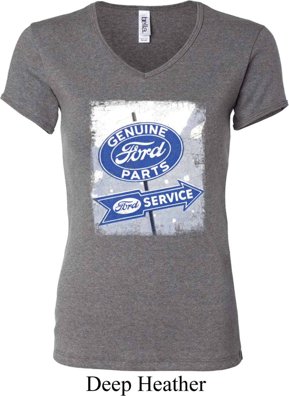 Ladies Ford Shirt Vintage Sign Genuine Ford Parts V-neck Tee T-Shirt 100% cotton Deep heather is a cotton/poly blend Available in Ladies Small, Ladies Medium, Ladies Large, Ladies XL & Ladies 2XL Also available in colors Black, Deep Heather, Navy, Pink, Red, Royal, and White  |