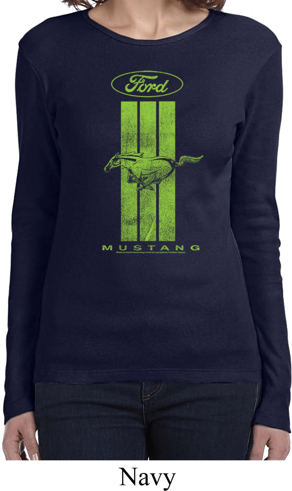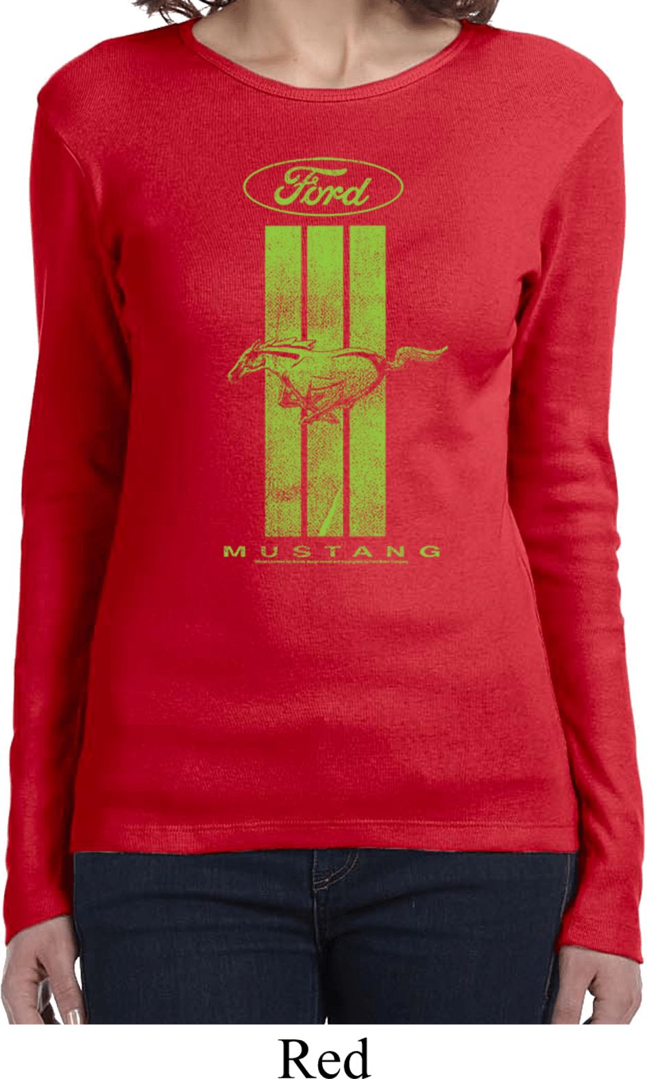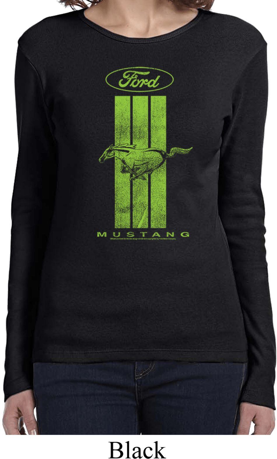 | | Ladies Ford Tee Green Mustang Stripe Long SleeveA ladies long sleeve featuring a green Ford Mustang Stripe. Our ladies tee is made of 100% cotton. A perfect gift for all who drive Ford Mustangs! Available in sizes Small through 2XL. Machine wash cold with like colors; dry low heat. ![]() |