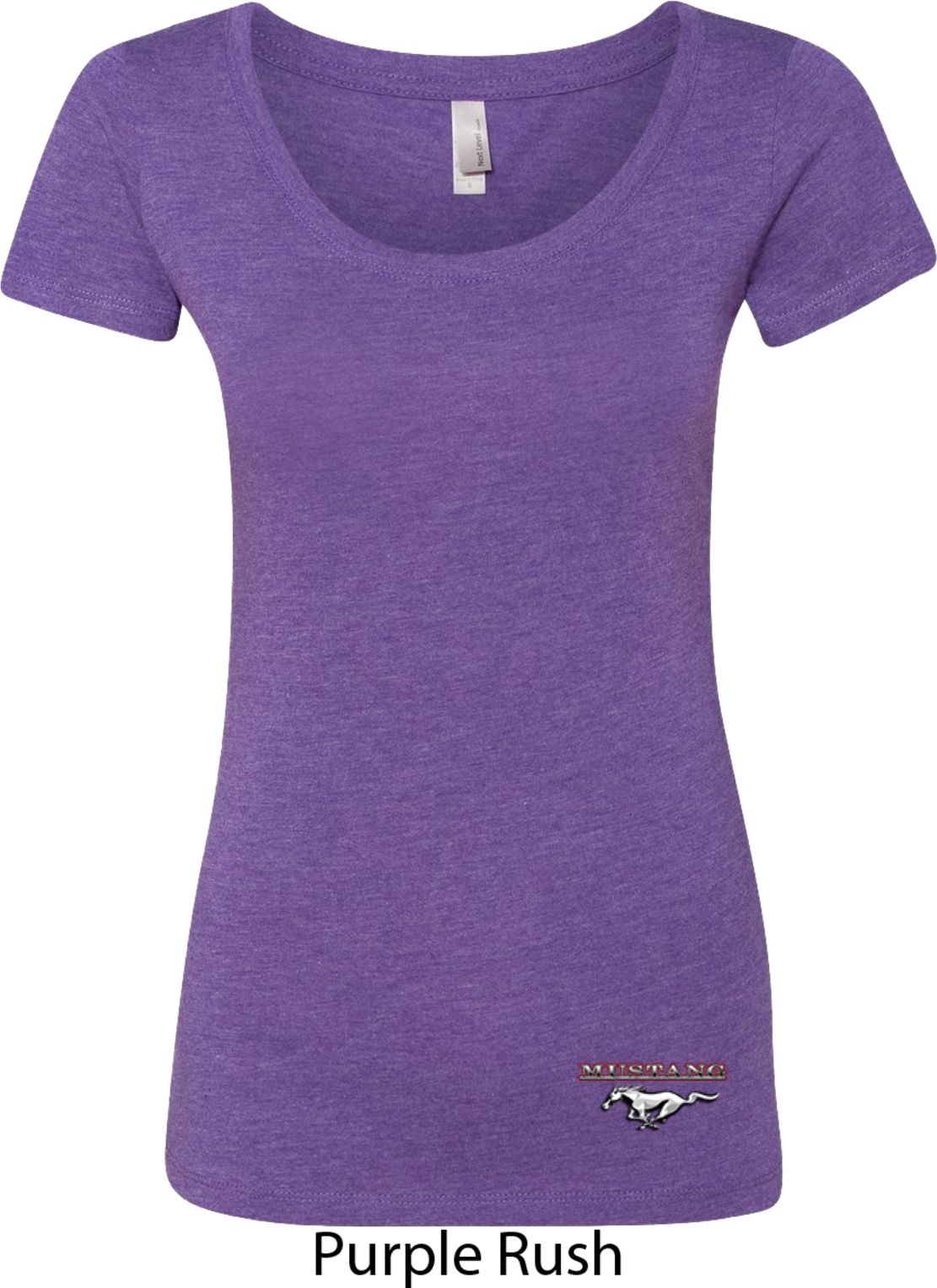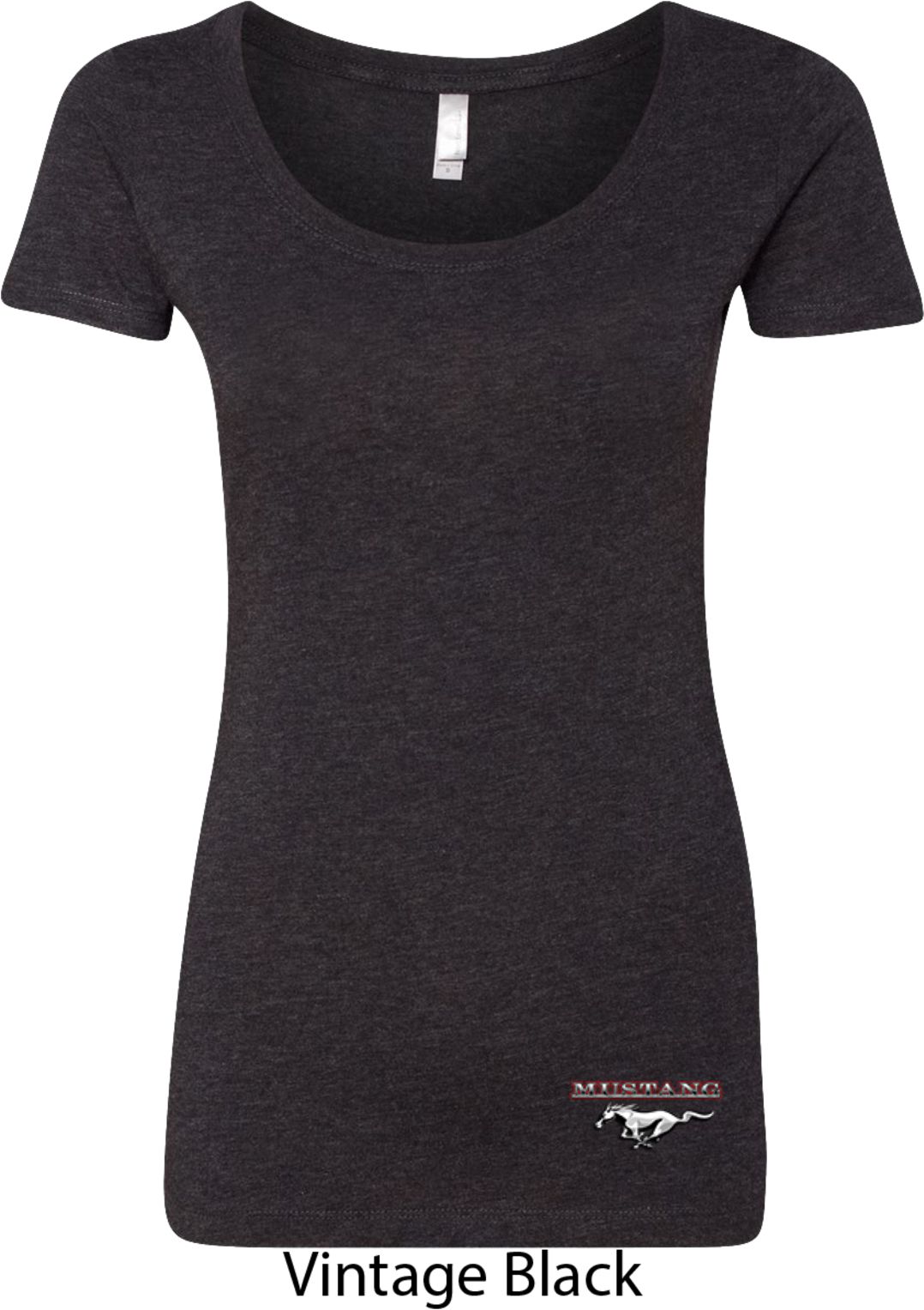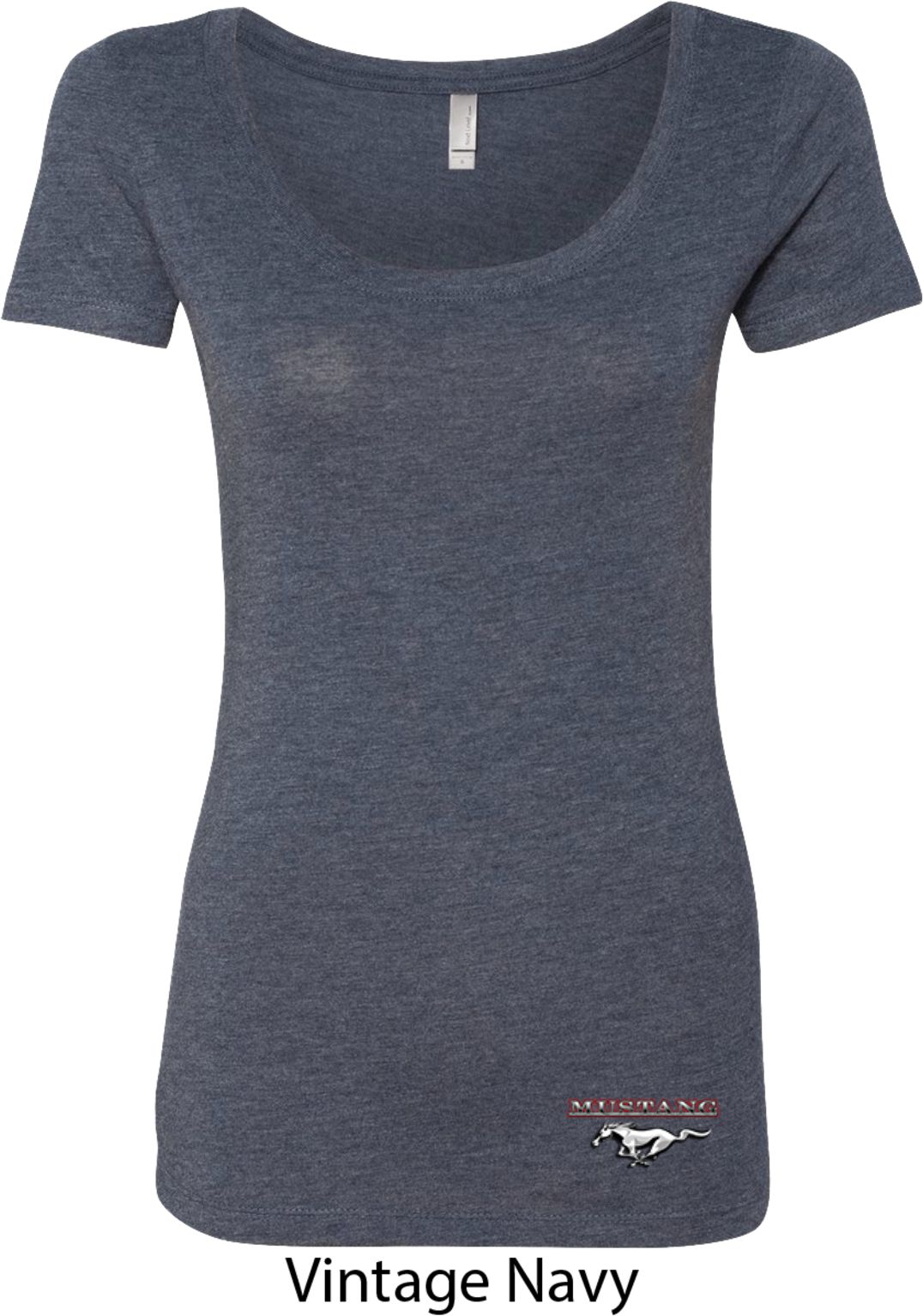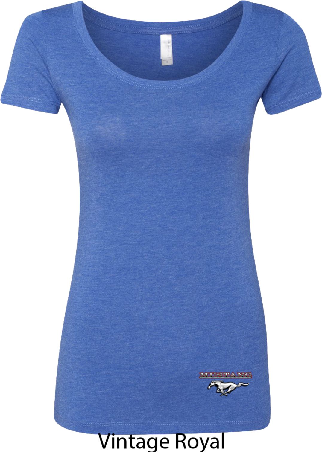 A fitted ladies scoop neck featuring Ford Mustang. Our ladies shirt is made with a blend of poly/cotton/rayon. Available in sizes Small through 2XL. Machine wash cold with like colors; dry low heat.