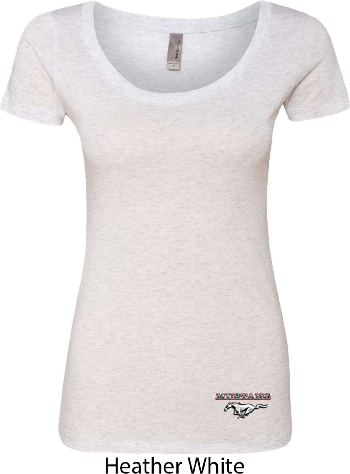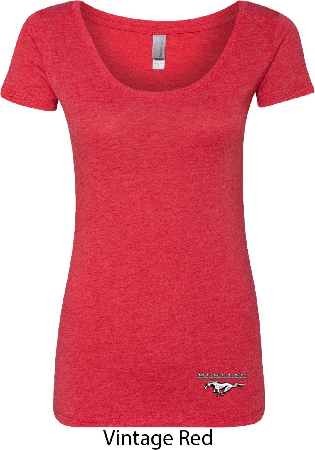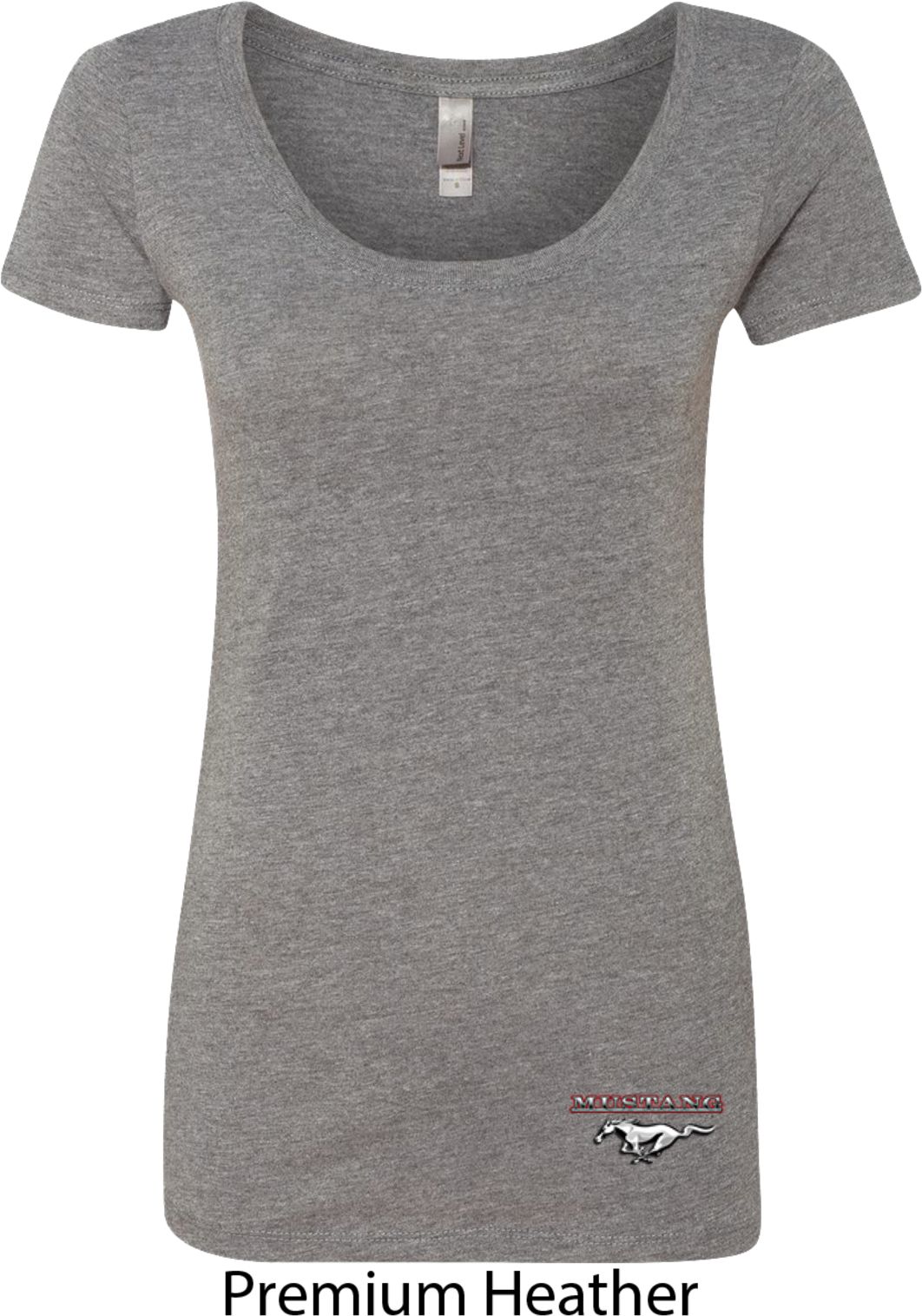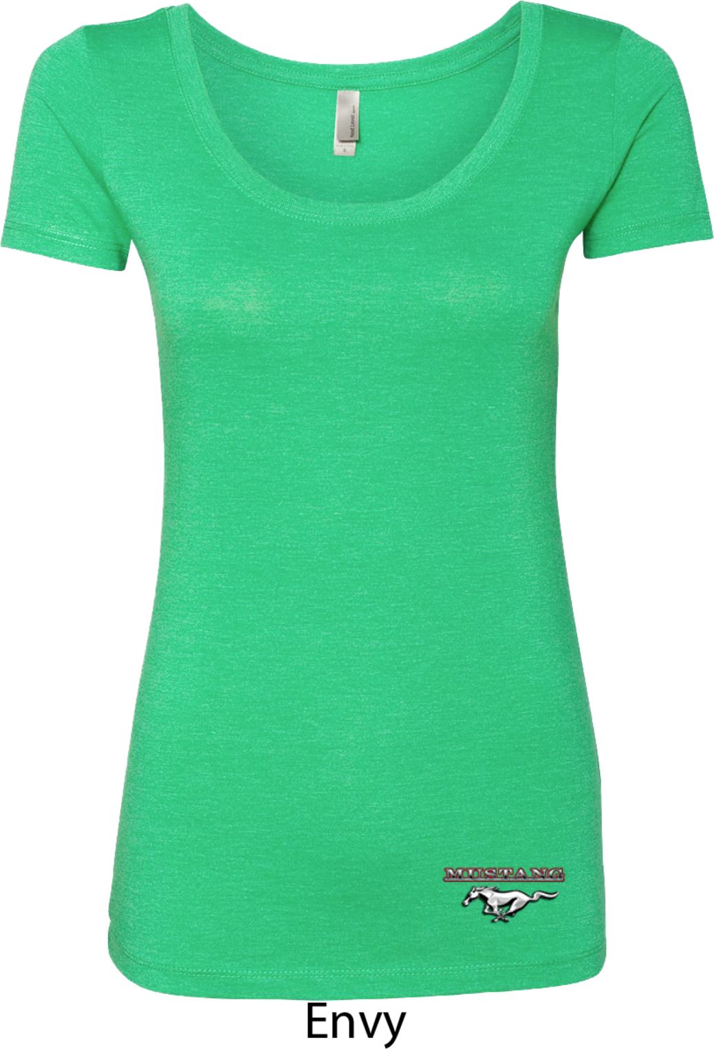 A fitted ladies scoop neck featuring Ford Mustang. Our ladies shirt is made with a blend of poly/cotton/rayon. Available in sizes Small through 2XL. Machine wash cold with like colors; dry low heat.