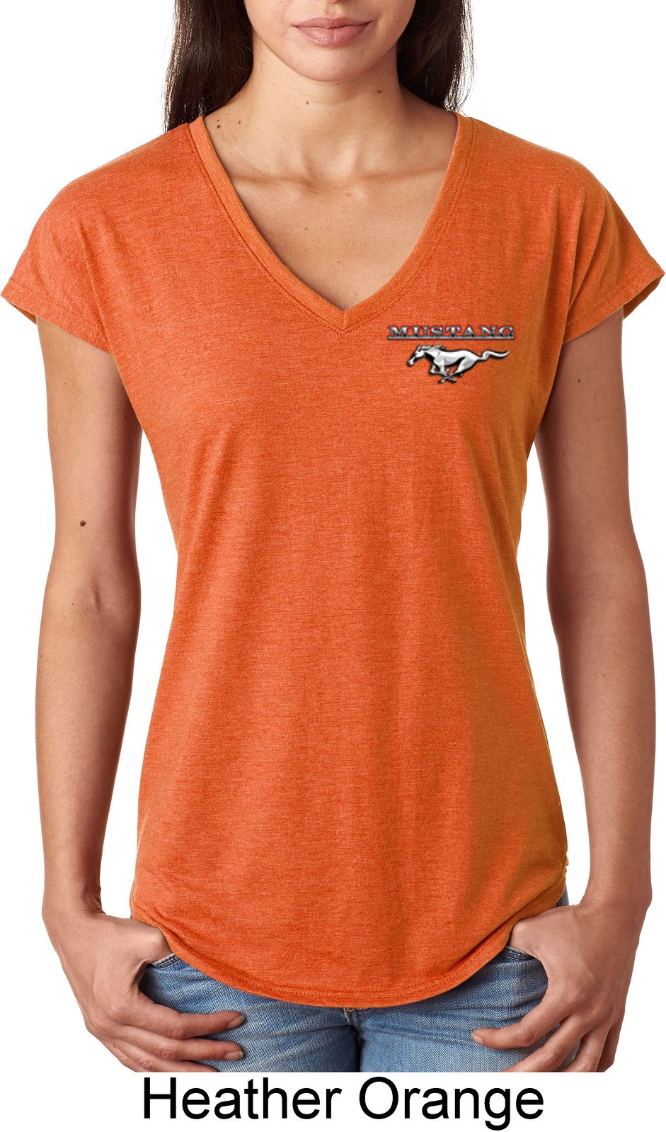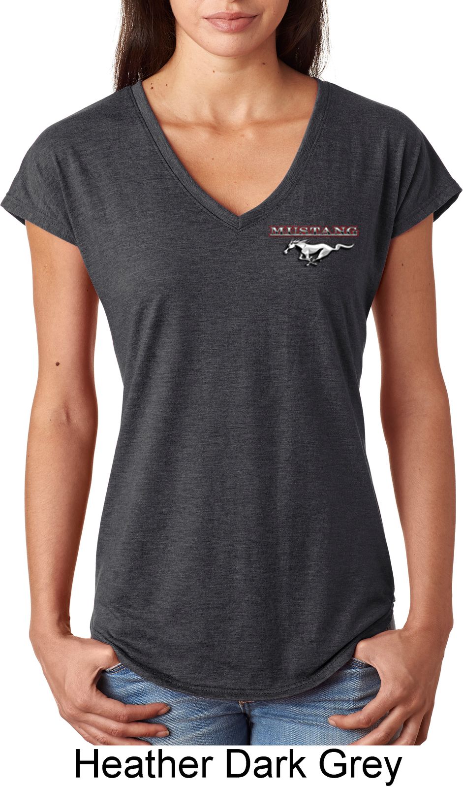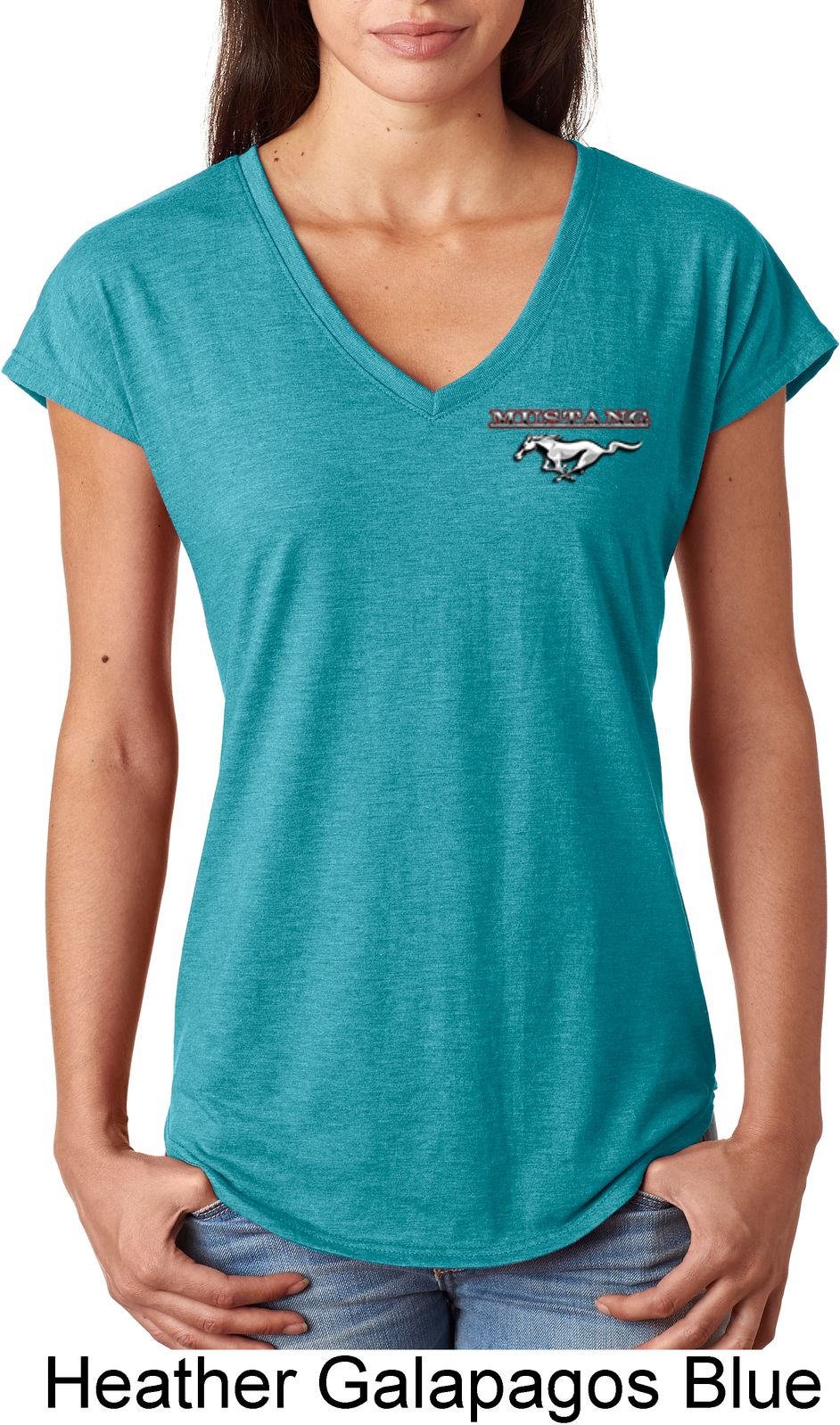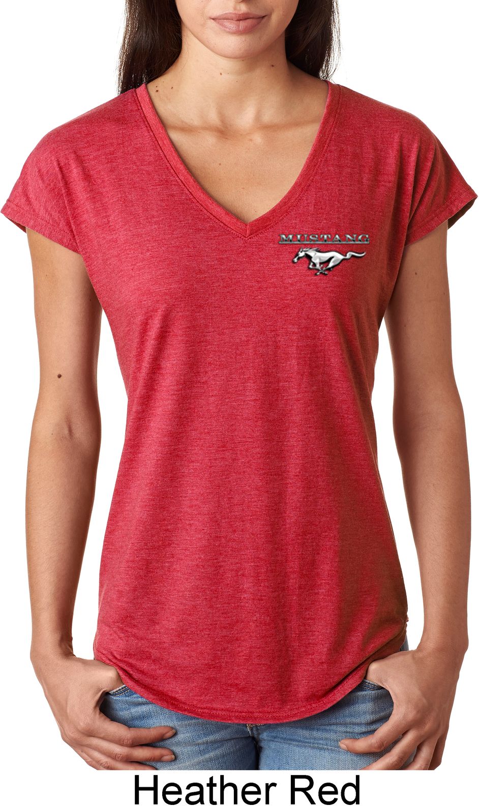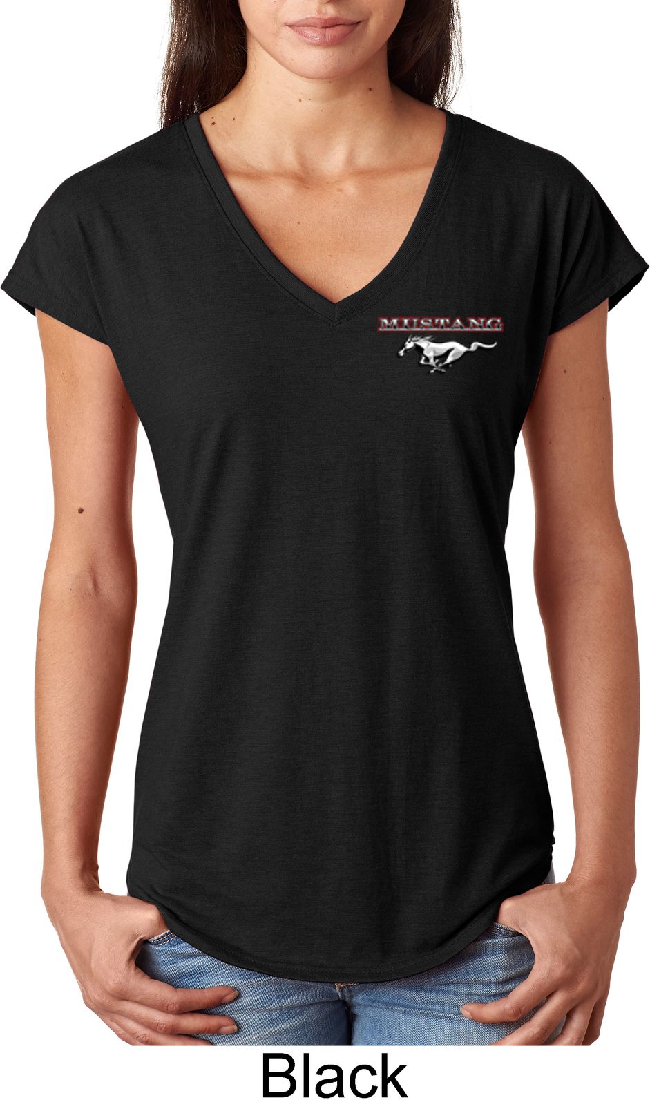 | | Ladies Ford Tee Mustang Pocket Print Tri Blend V-neckA ladies tri blend v-neck featuring Ford Mustang as a pocket print. Our ladies shirt is made with a blend of cotton/poly/rayon. Available in sizes Small through 2XL. Machine wash cold with like colors; dry low heat. Please note: This shirt does not have a pocket. ![]() |