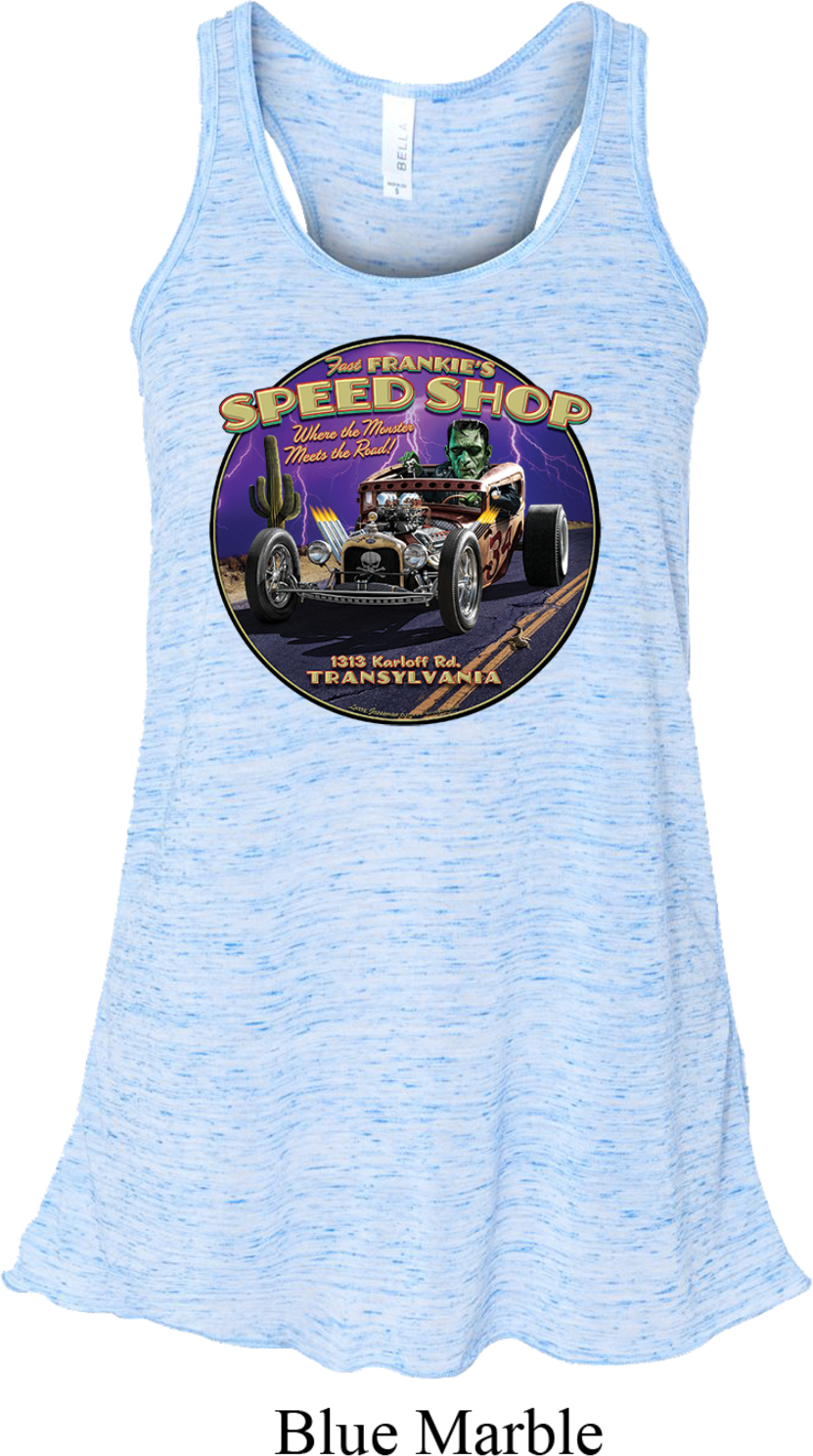 | | Ladies Frankenstein Frankie's Speed Shop Flowy V-neck Tank TopA ladies flowy v-neck tanktop featuring Frankie's Speed Shop; Where the Monster Meets the Road! 1313 Karloff Rd, Transylvania. Solid colors are made of poly/rayon; Marble colors are made of poly/cotton; Stripe colors are made of rayon/poly. A perfect gift for all Frankenstein fans! Available in sizes Small through 2XL. Machine wash cold with like colors; dry low heat. ![]() |