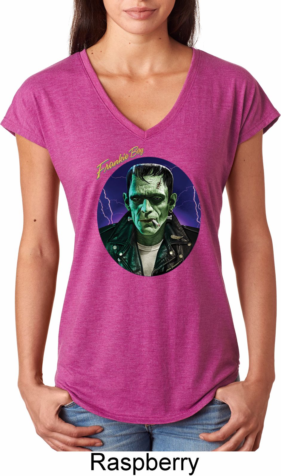 | | Ladies Frankenstein Tee Frankie Boy Tri Blend V-neckA soft ladies v-neck featuring a cool portrait of Frankie Boy smoking his cigarette and lightning in the distance. Our ladies shirt is made with a blend of cotton/poly/rayon. A perfect gift for all Frankenstein fans! Available in sizes Small through 2XL. Machine wash cold with like colors; dry low heat. ![]() |