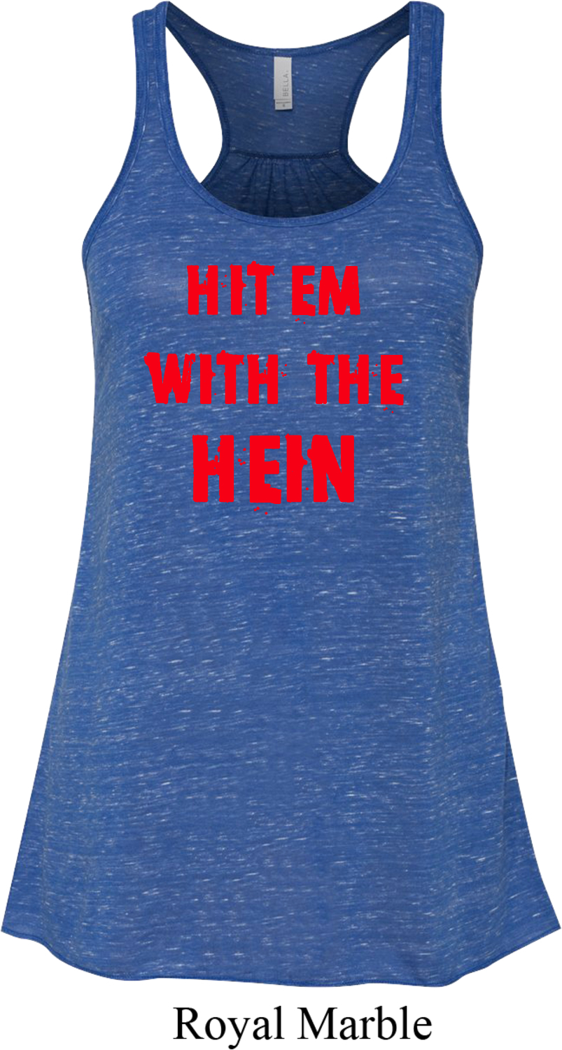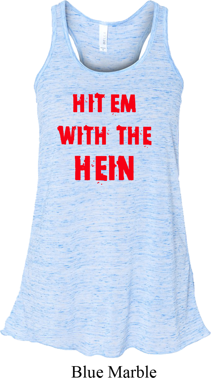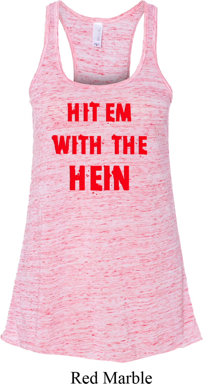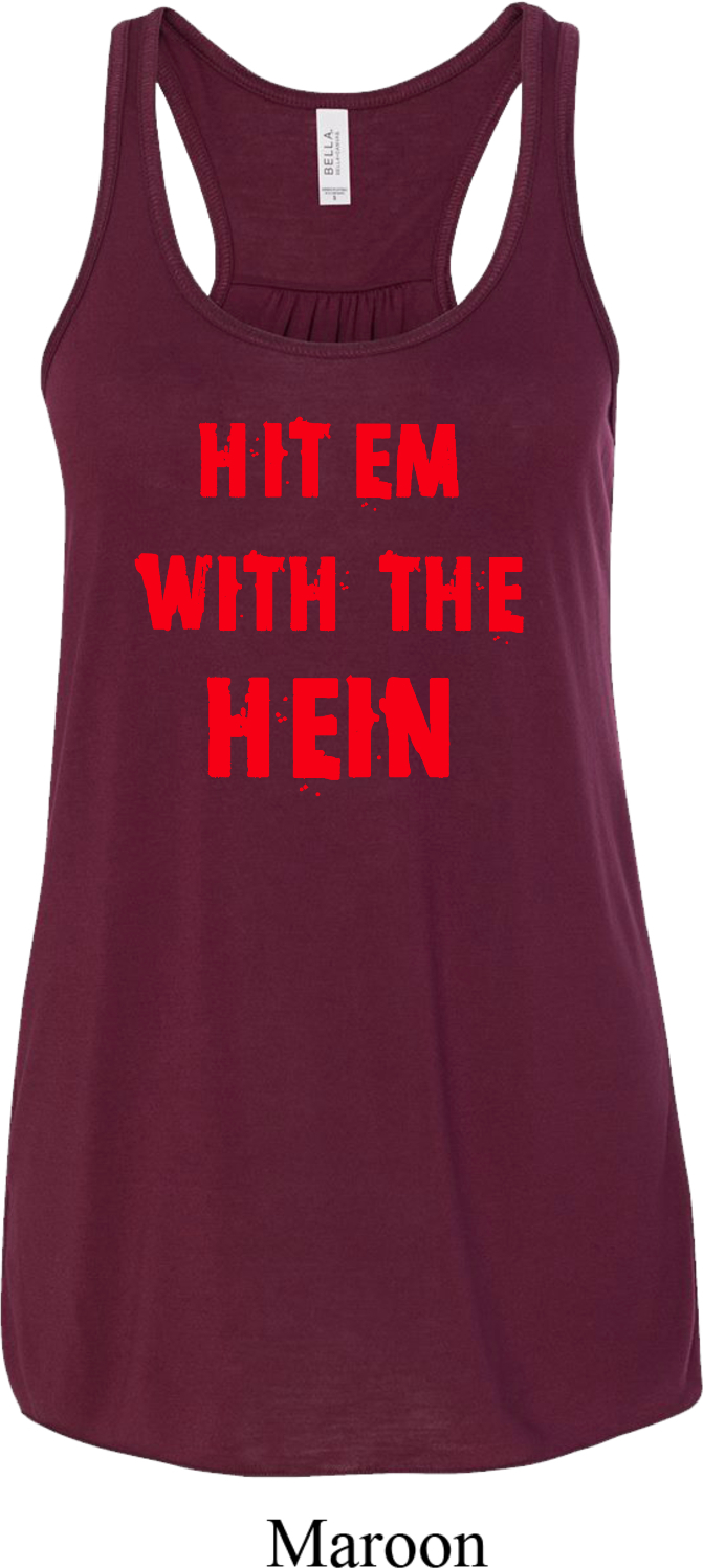 | | Ladies Funny Tank Top Hit em with the Hein Flowy RacerbackA ladies flowy racerback with a scrunch back featuring the funny saying Hit 'em with the Hein in red lettering. Solid colors are made of poly/rayon; Marble colors are made of poly/cotton; Stripe colors are made of rayon/poly. Available in sizes Small through 2XL. Machine wash cold with like colors; dry low heat. ![]() |