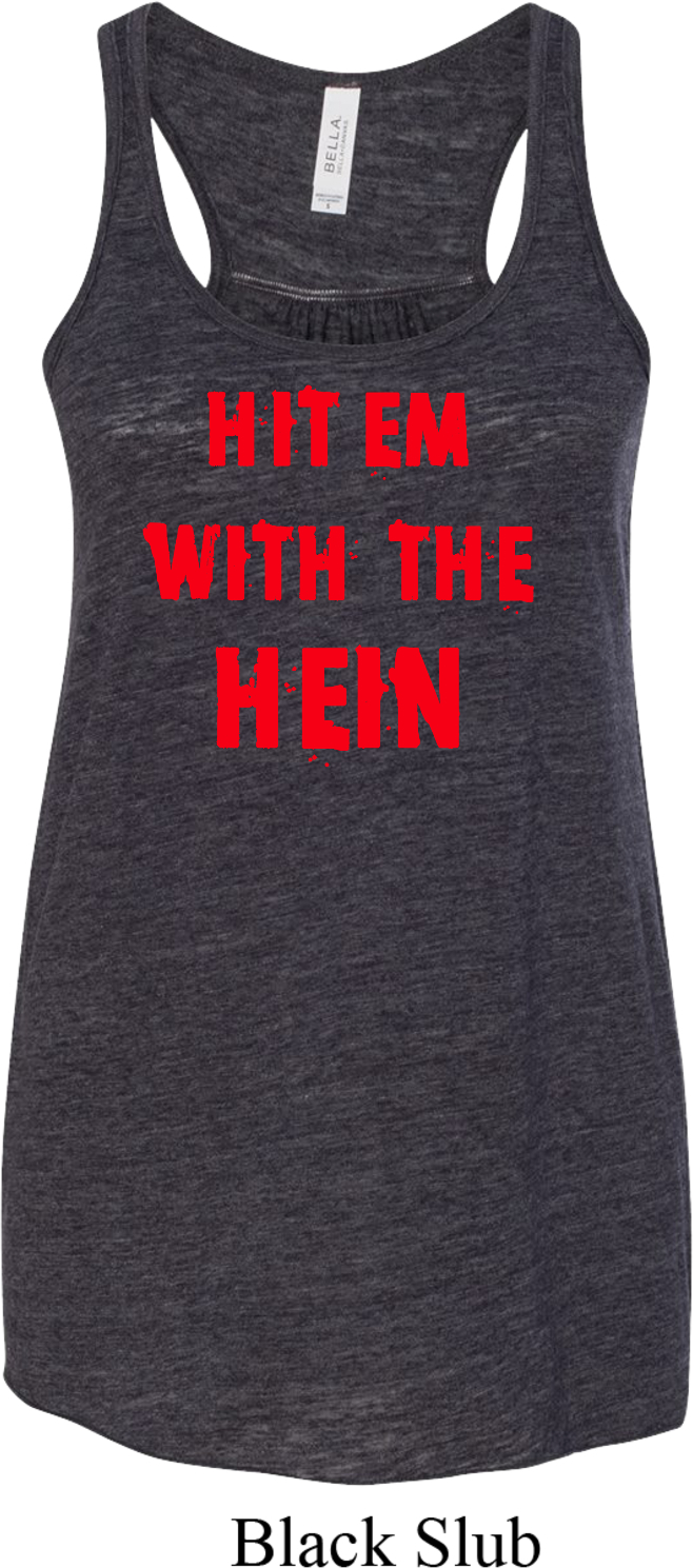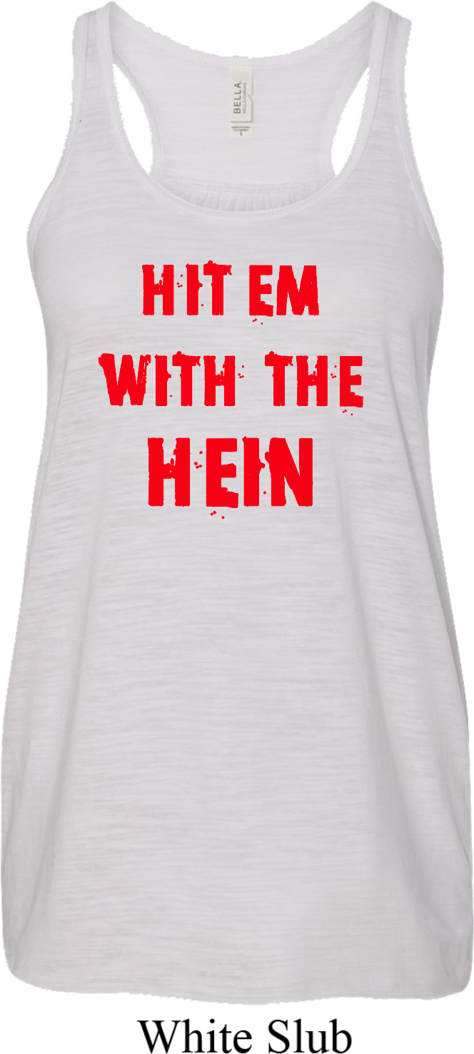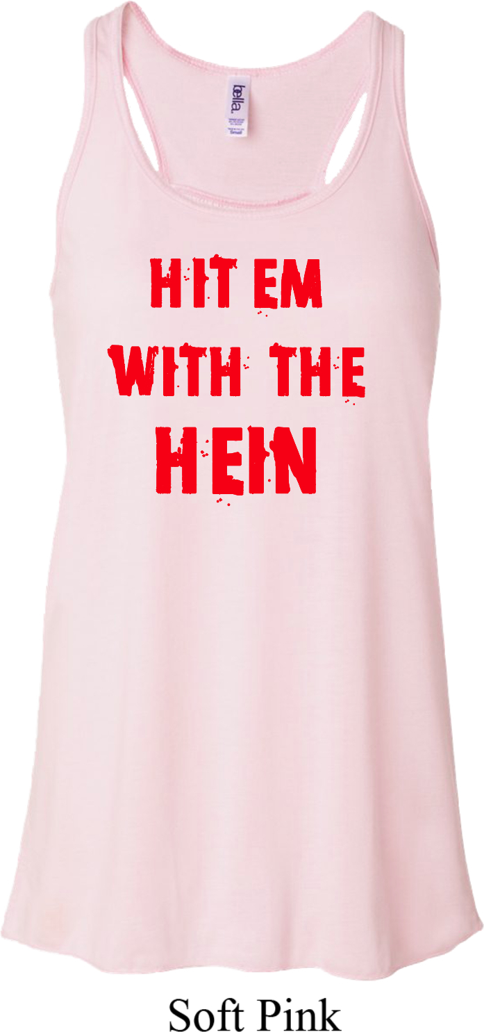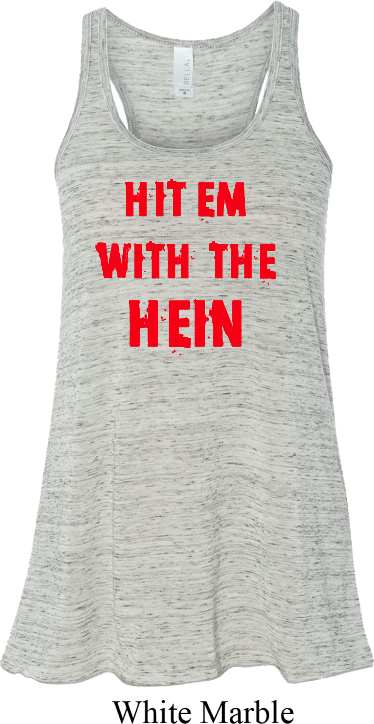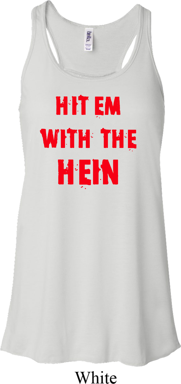| | Ladies Funny Tank Top Hit em with the Hein Flowy RacerbackA ladies flowy racerback with a scrunch back featuring the funny saying Hit 'em with the Hein in red lettering. Solid colors are made of poly/rayon; Marble colors are made of poly/cotton; Stripe colors are made of rayon/poly. Available in sizes Small through 2XL. Machine wash cold with like colors; dry low heat. ![]() |