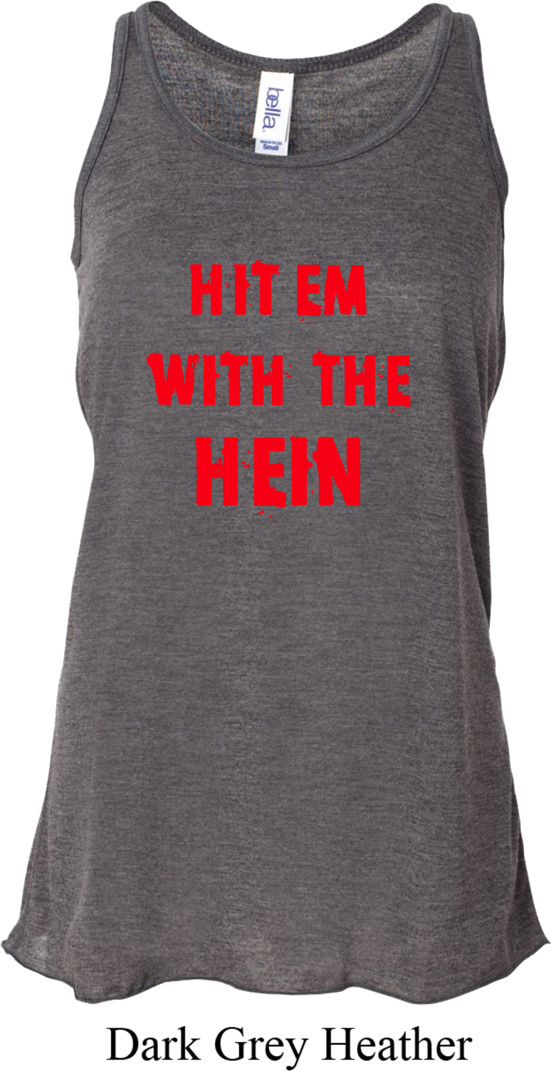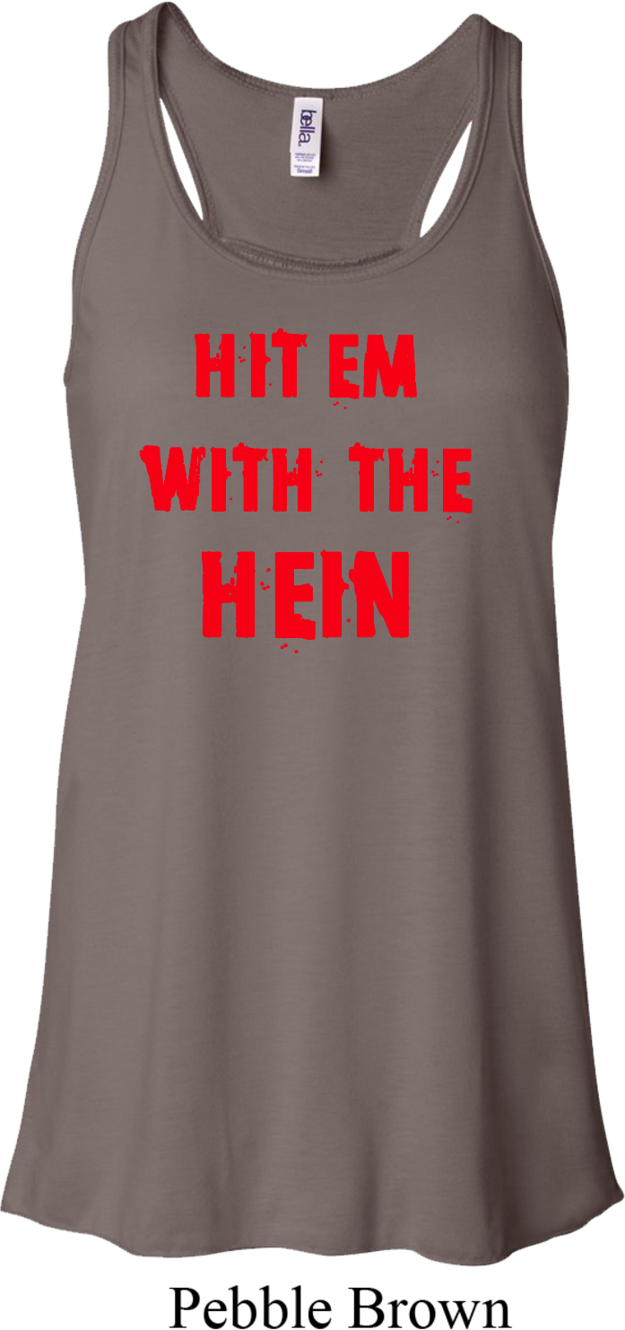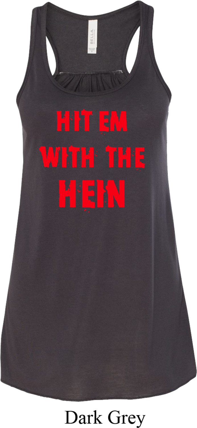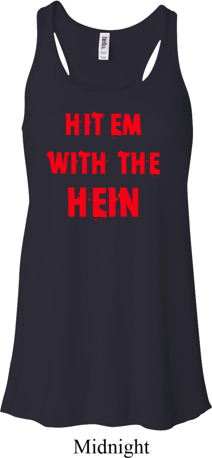 | | Ladies Funny Tank Top Hit em with the Hein Flowy RacerbackA ladies flowy racerback with a scrunch back featuring the funny saying Hit 'em with the Hein in red lettering. Solid colors are made of poly/rayon; Marble colors are made of poly/cotton; Stripe colors are made of rayon/poly. Available in sizes Small through 2XL. Machine wash cold with like colors; dry low heat. ![]() |