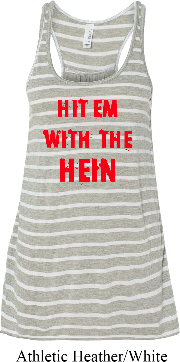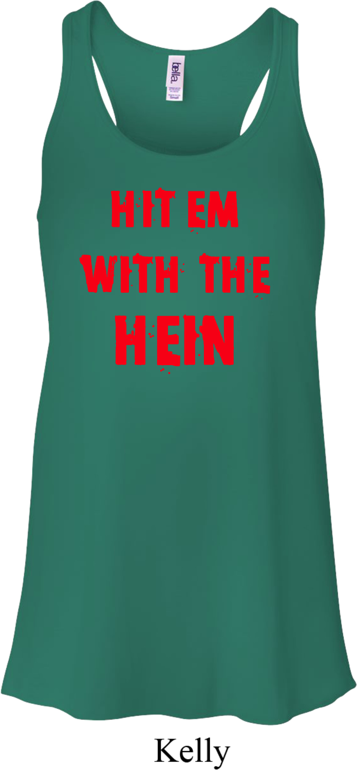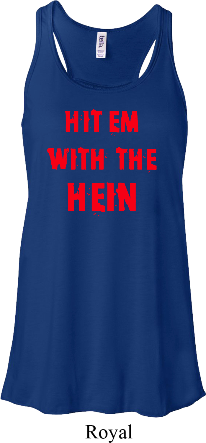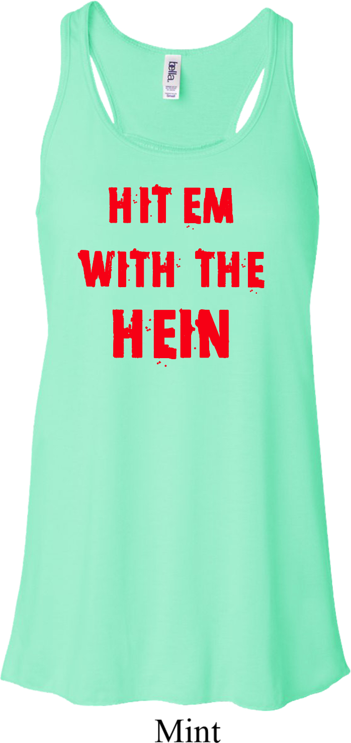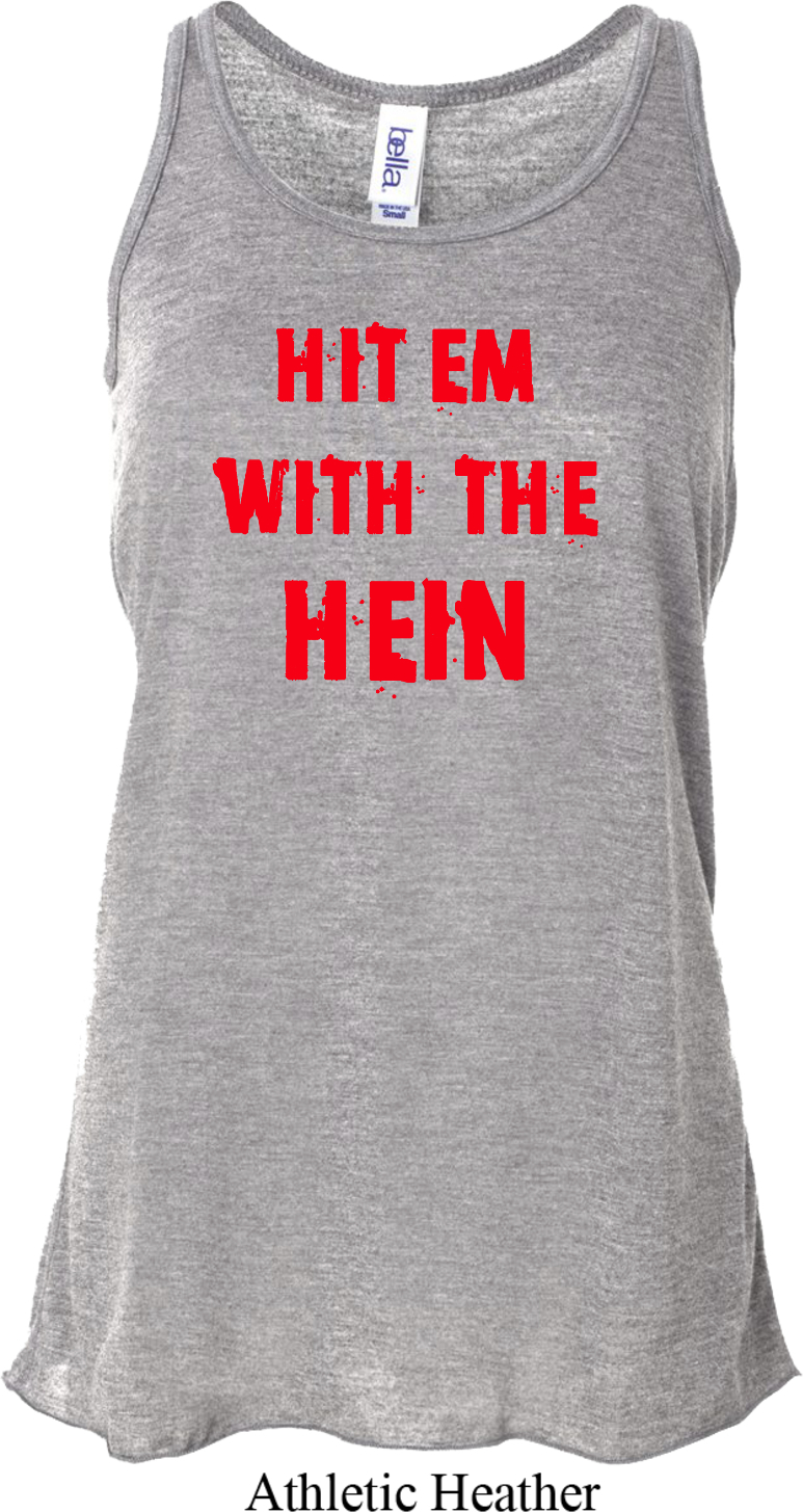 | | Ladies Funny Tank Top Hit em with the Hein Flowy RacerbackA ladies flowy racerback with a scrunch back featuring the funny saying Hit 'em with the Hein in red lettering. Solid colors are made of poly/rayon; Marble colors are made of poly/cotton; Stripe colors are made of rayon/poly. Available in sizes Small through 2XL. Machine wash cold with like colors; dry low heat. ![]() |