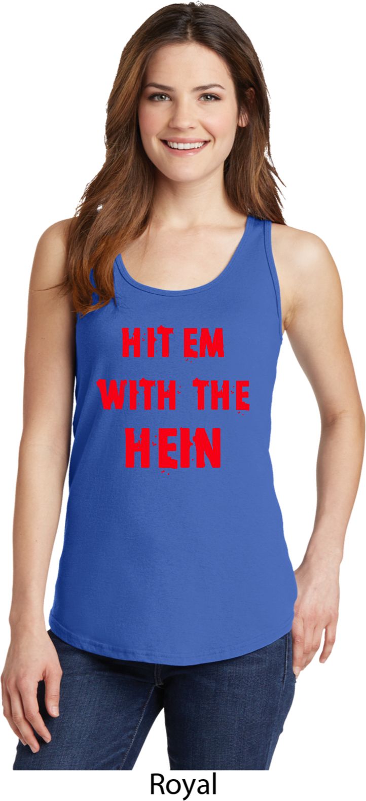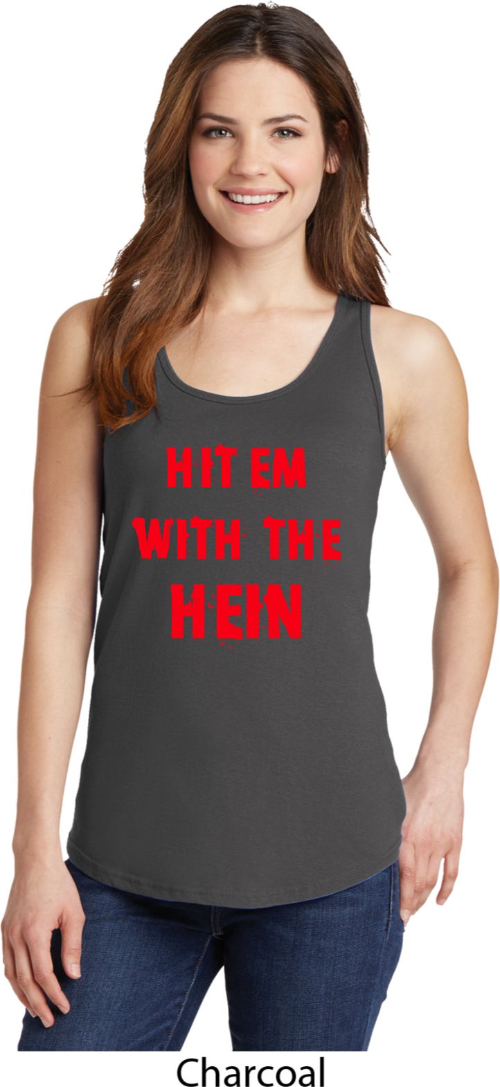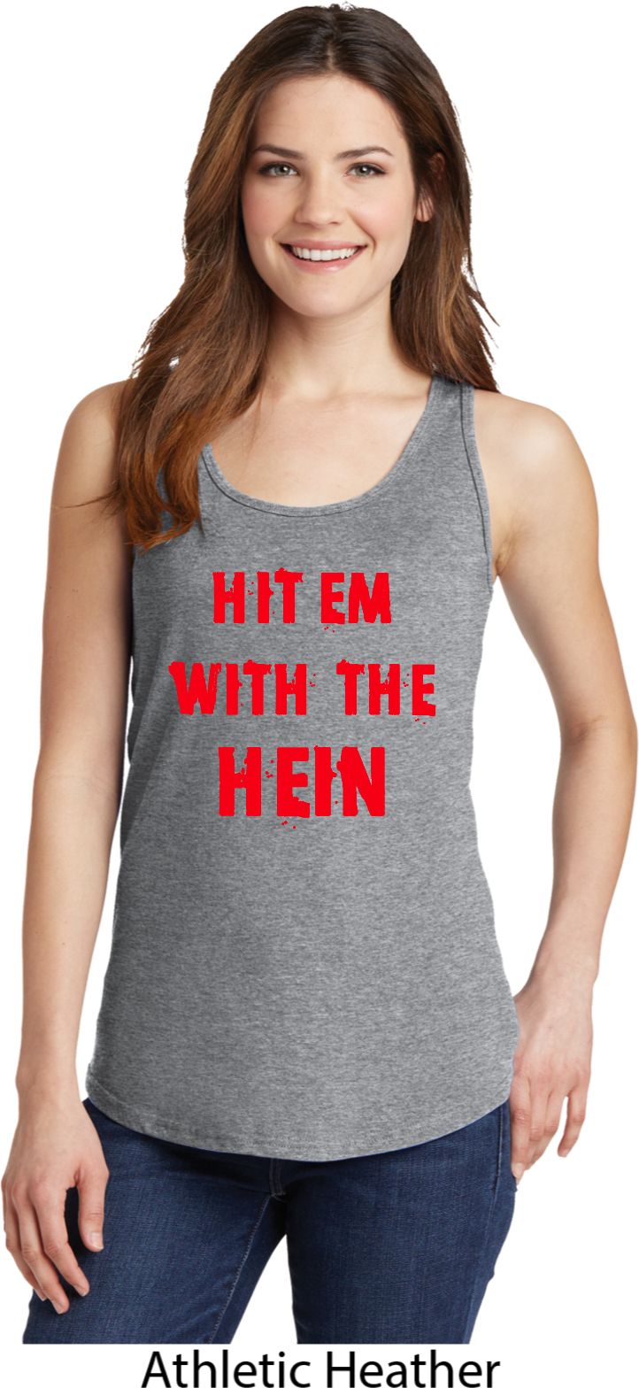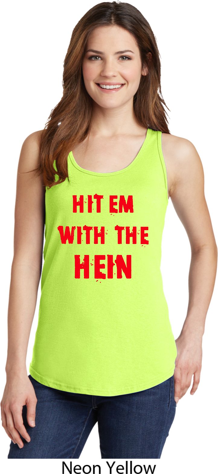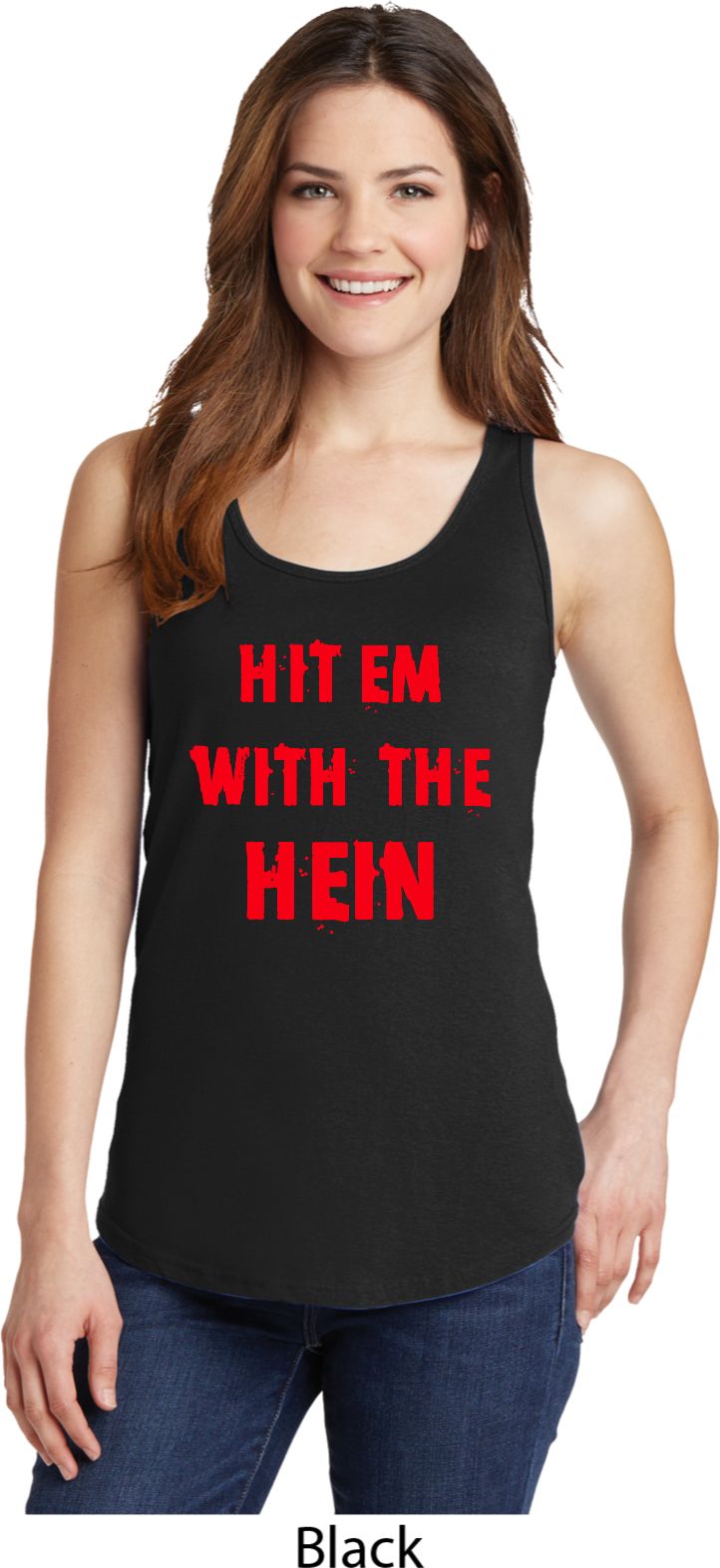 | | Ladies Funny Tank Top Hit em with the Hein TanktopA relaxed fit ladies tank top featuring the funny saying Hit 'em with the Hein in red lettering. Our ladies tanktop is made of 100% cotton. (Neons and Heathers are made with a blend of cotton/poly) Available in sizes Small through 4XL. Machine wash cold with like colors; dry low heat. ![]() |