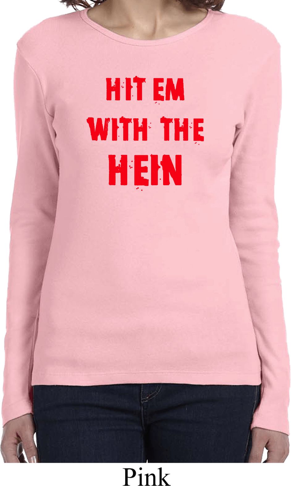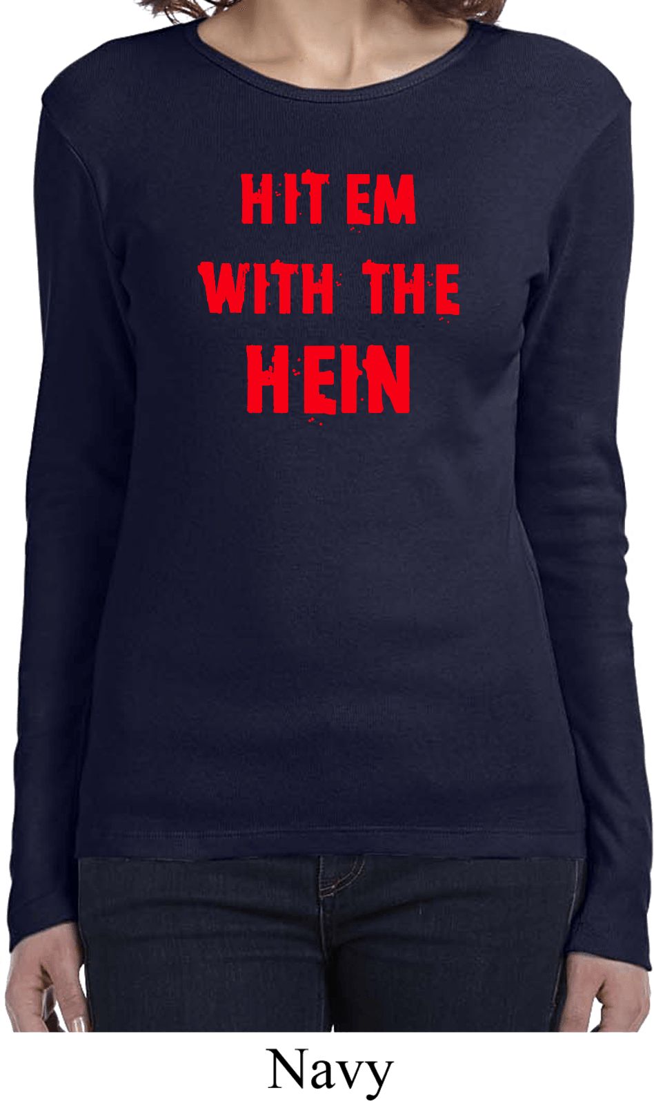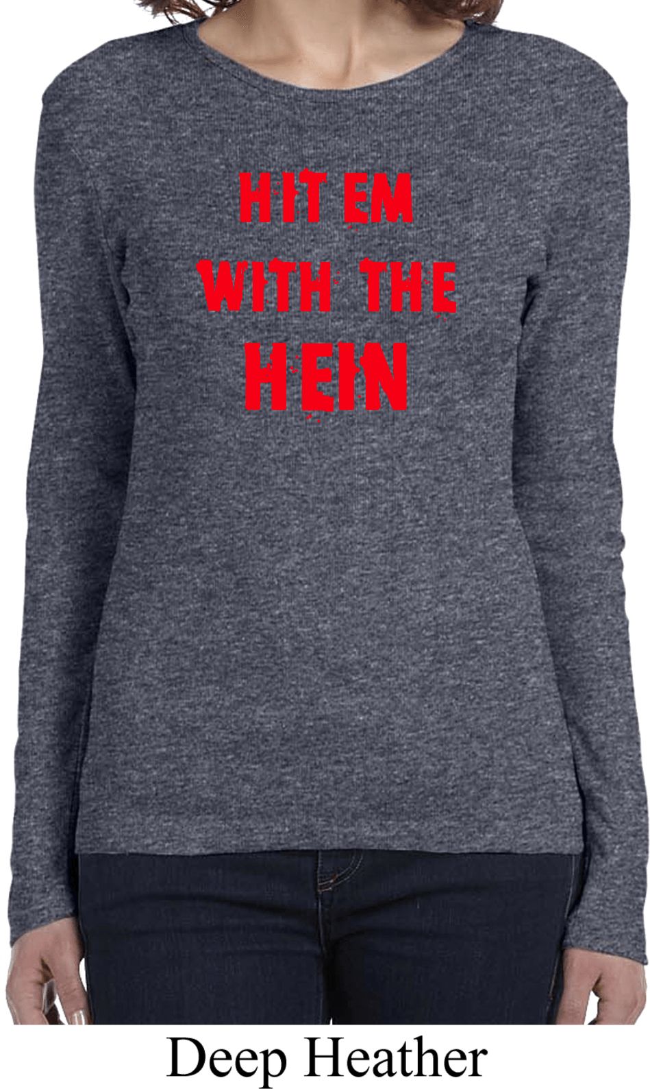 | | Ladies Funny Tee Hit em with the Hein Long SleeveA ladies long sleeve featuring the funny saying Hit 'em with the Hein in red lettering. Our ladies shirt is made of 100% cotton. (Deep Heather is made with a blend of cotton/poly) Available in sizes Small through 2XL. Machine wash cold with like colors; dry low heat. ![]() |