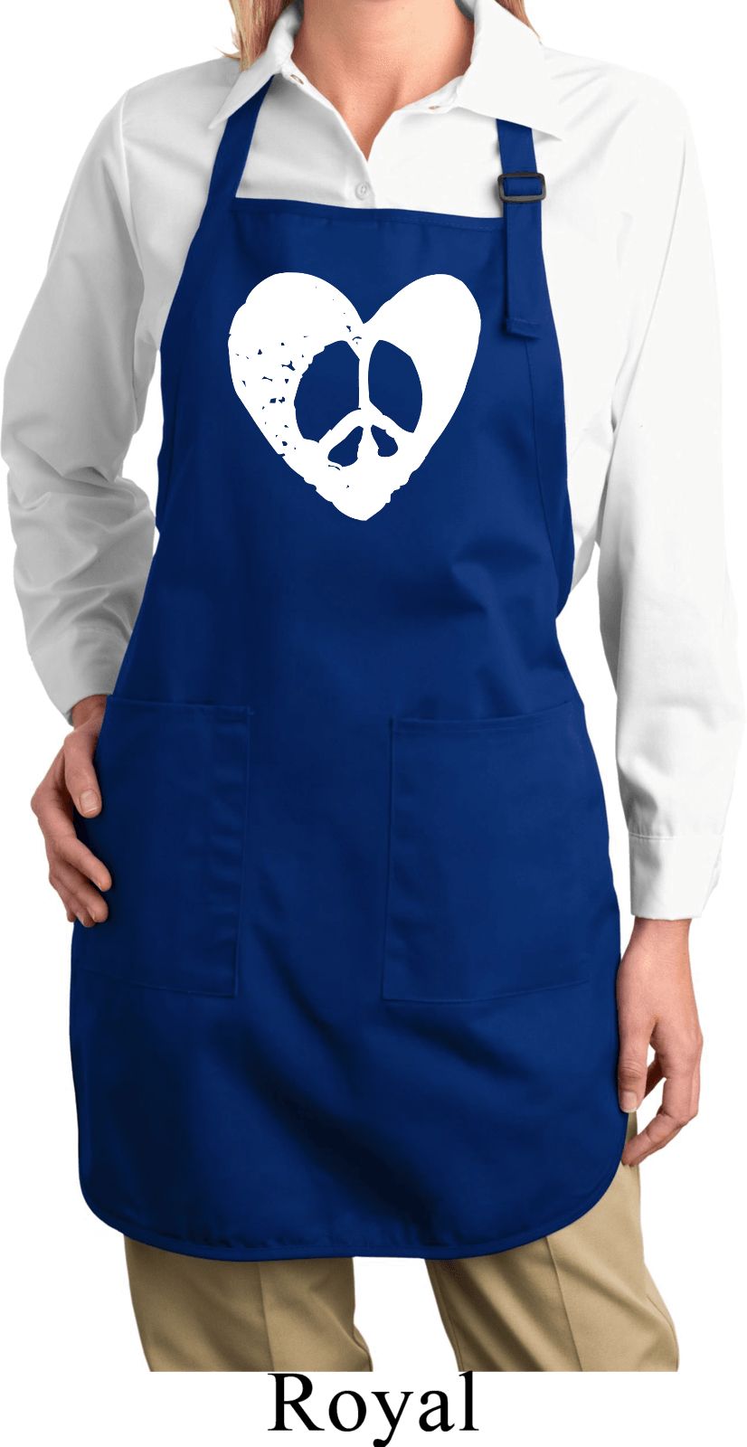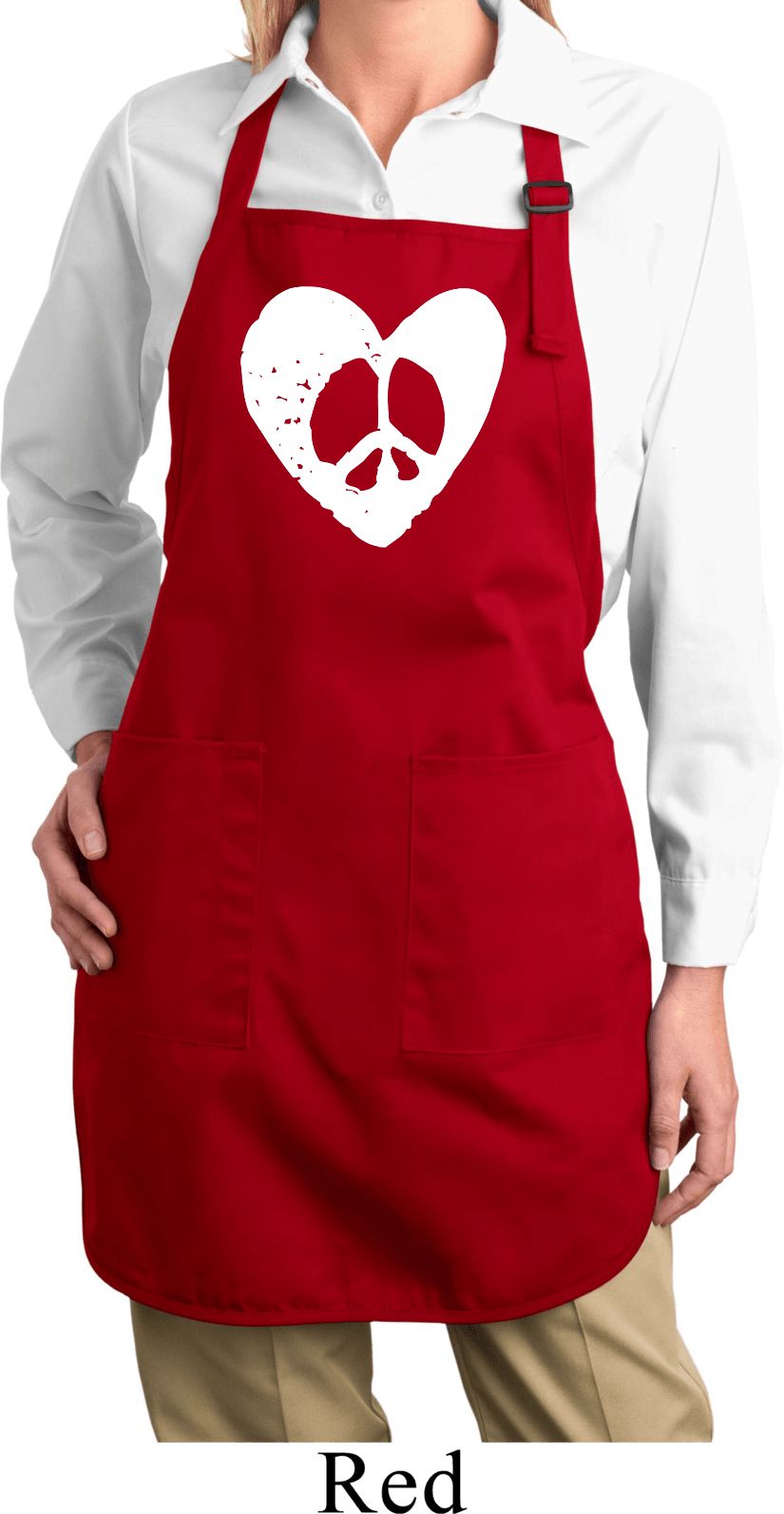 | | Ladies Peace Apron Hippie Heart Peace Full Length Apron with PocketsA ladies full length apron with an adjustable neck strap featuring a distressed love and peace design. Our apron has two waist patch pockets and one pen pocket. One size fits all. Machine wash cold with like colors; dry low heat. |
