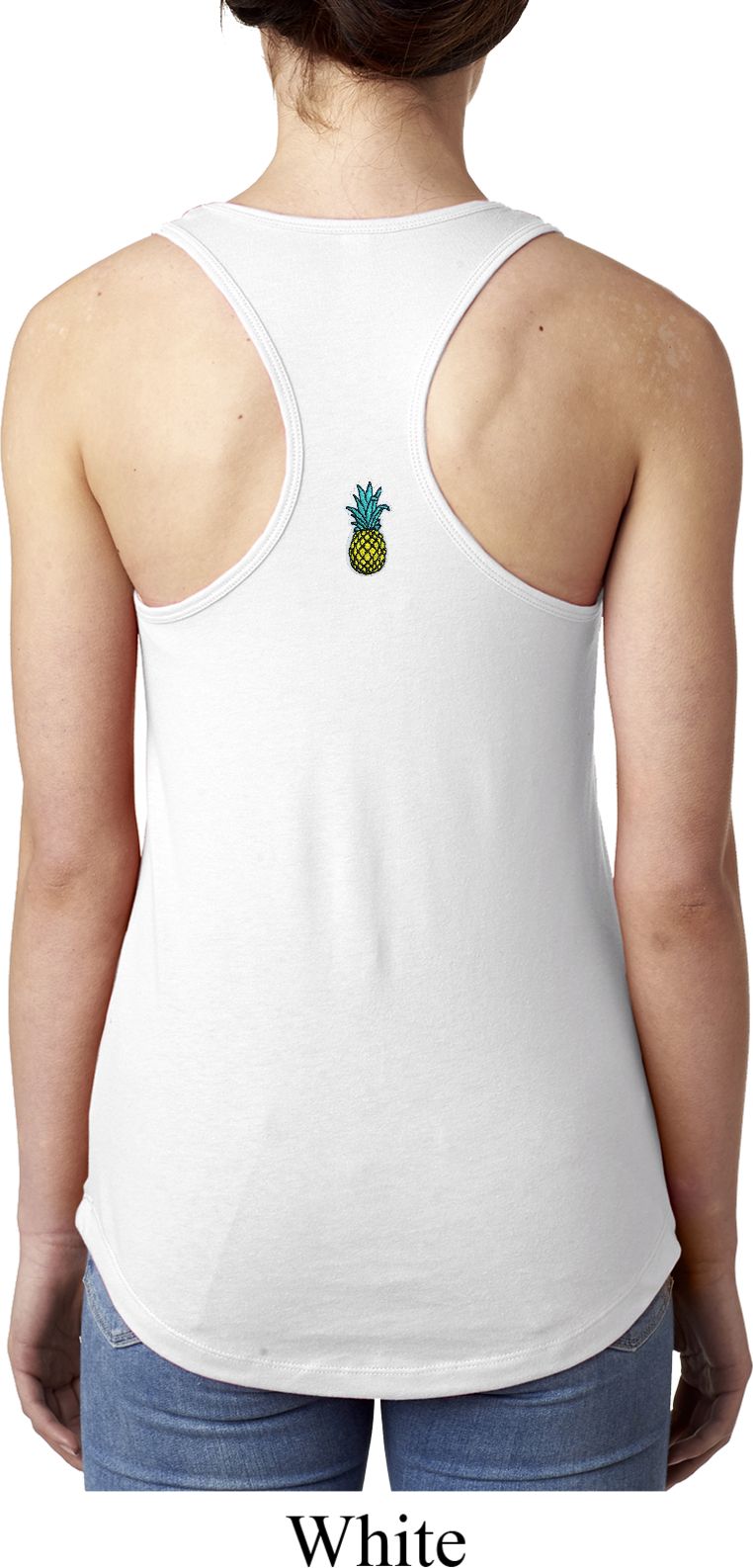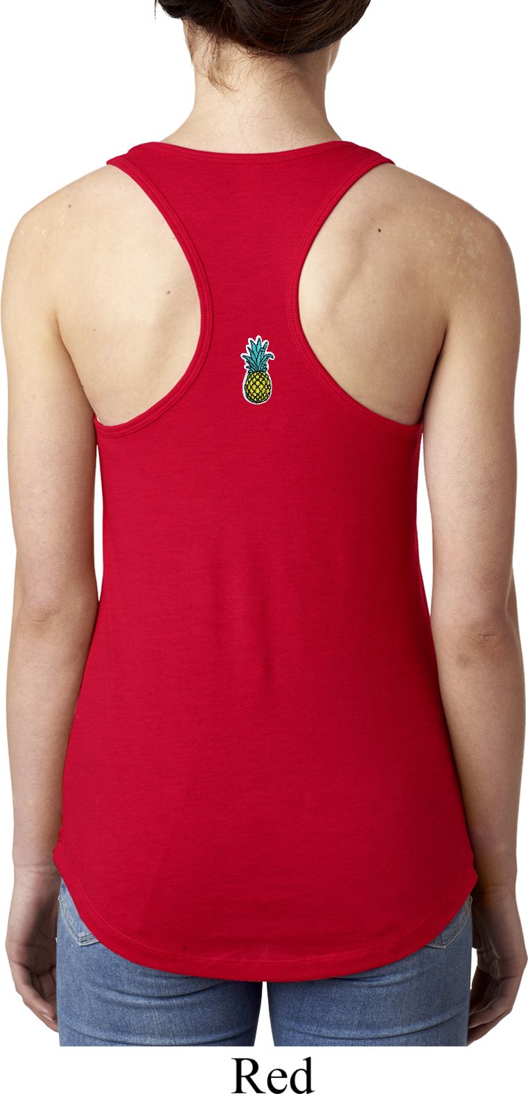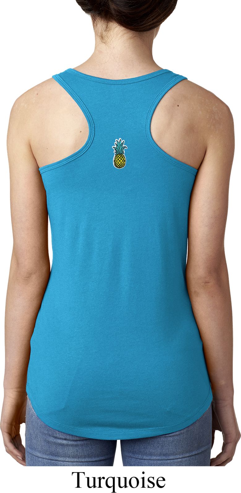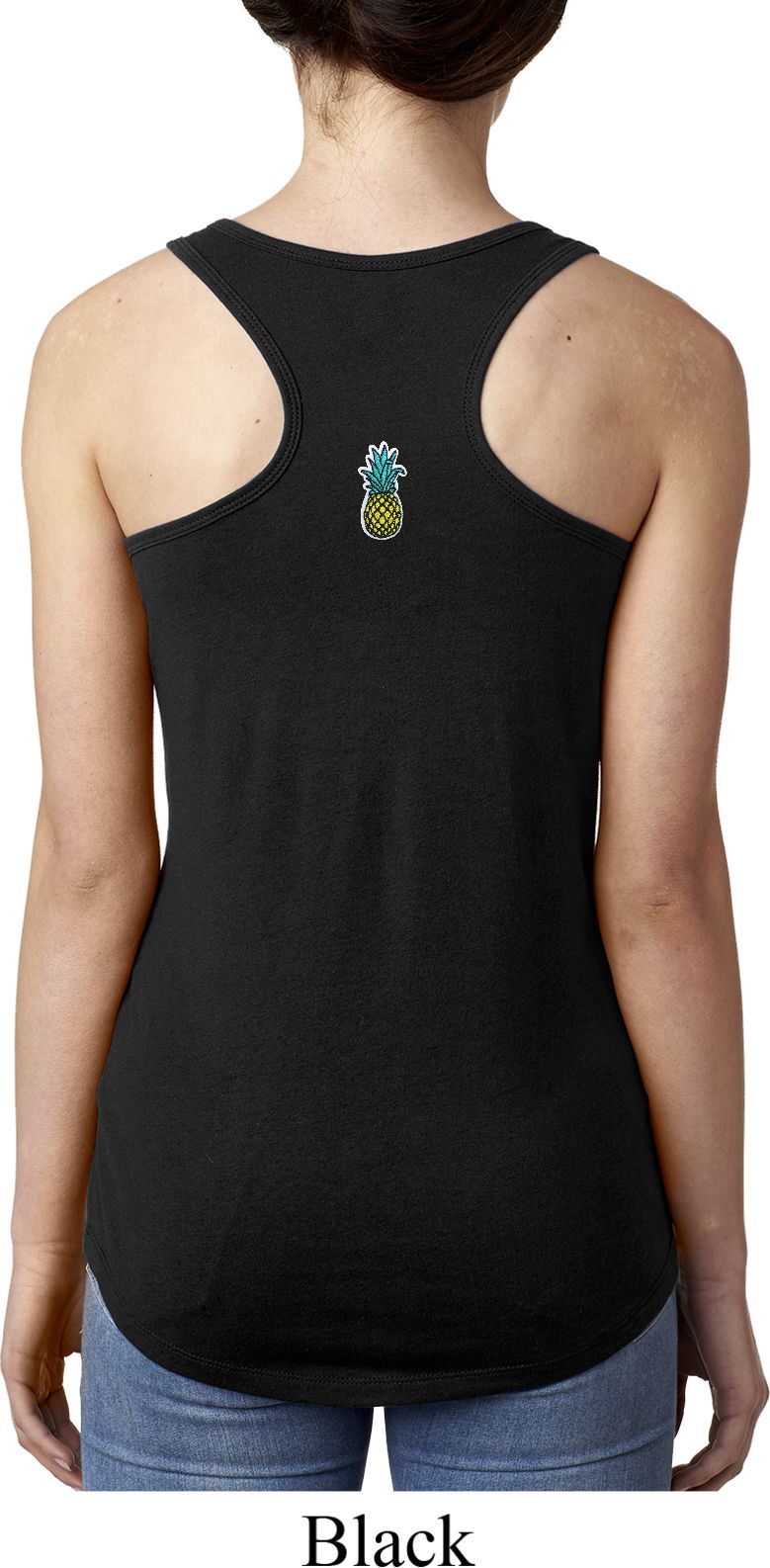 A ladies racerback featuring a pineapple patch on the back. Made with a blend of cotton/poly. Available in sizes Small through 2XL. Machine wash cold with like colors; dry low heat.