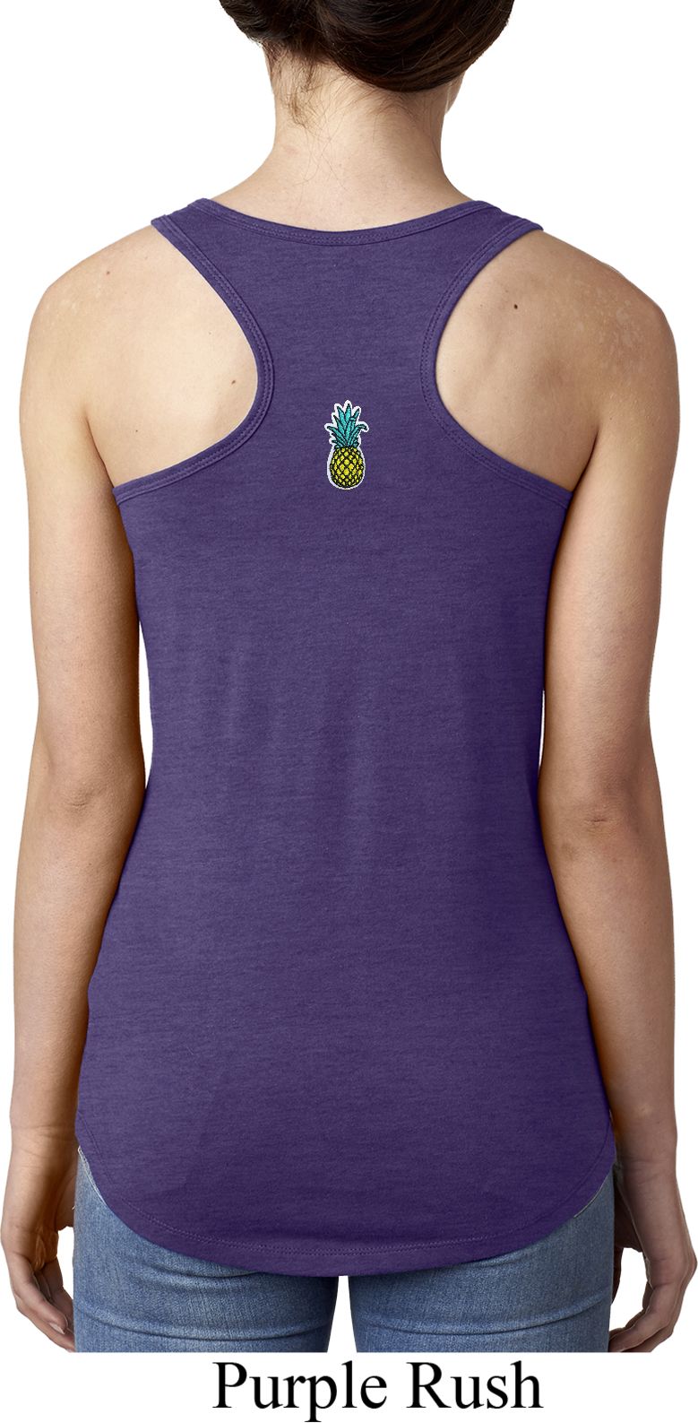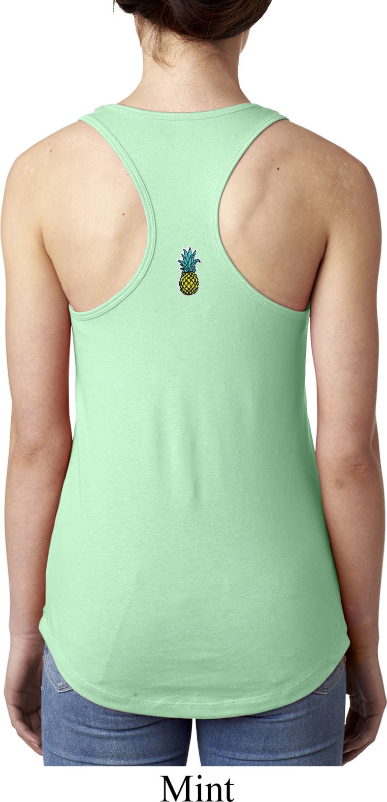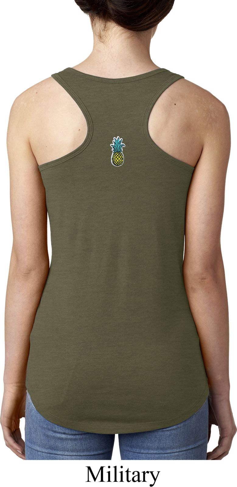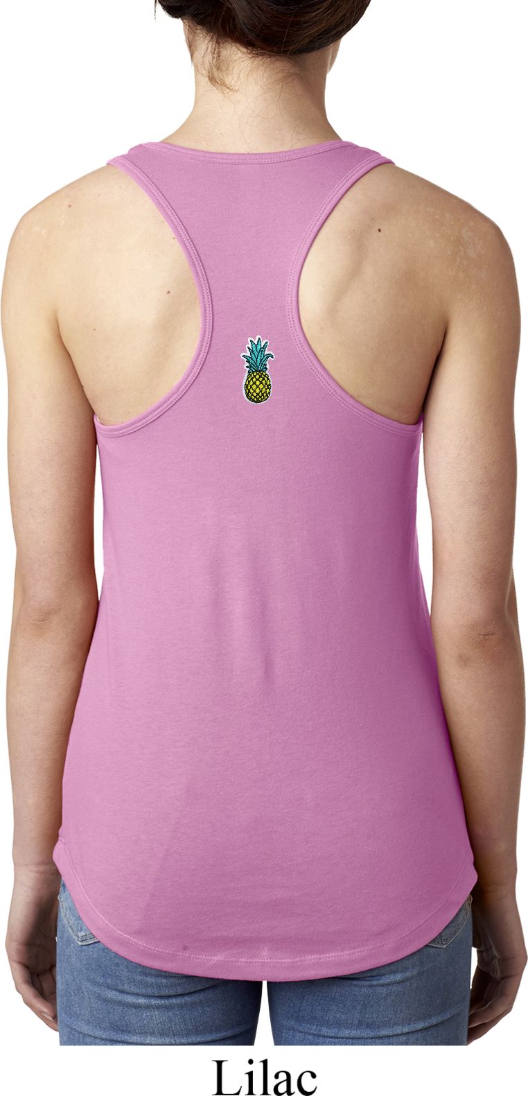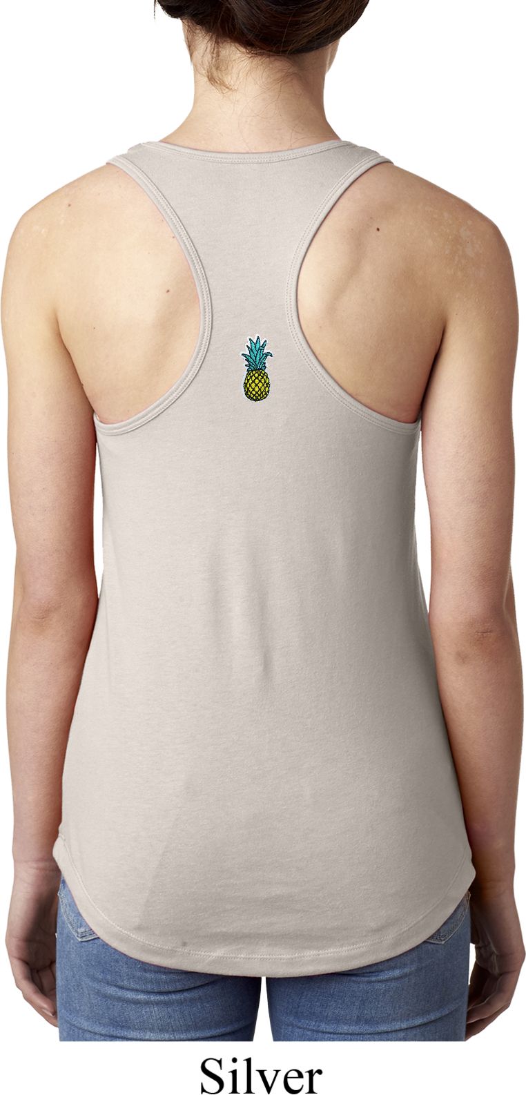 A ladies racerback featuring a pineapple patch on the back. Made with a blend of cotton/poly. Available in sizes Small through 2XL. Machine wash cold with like colors; dry low heat.