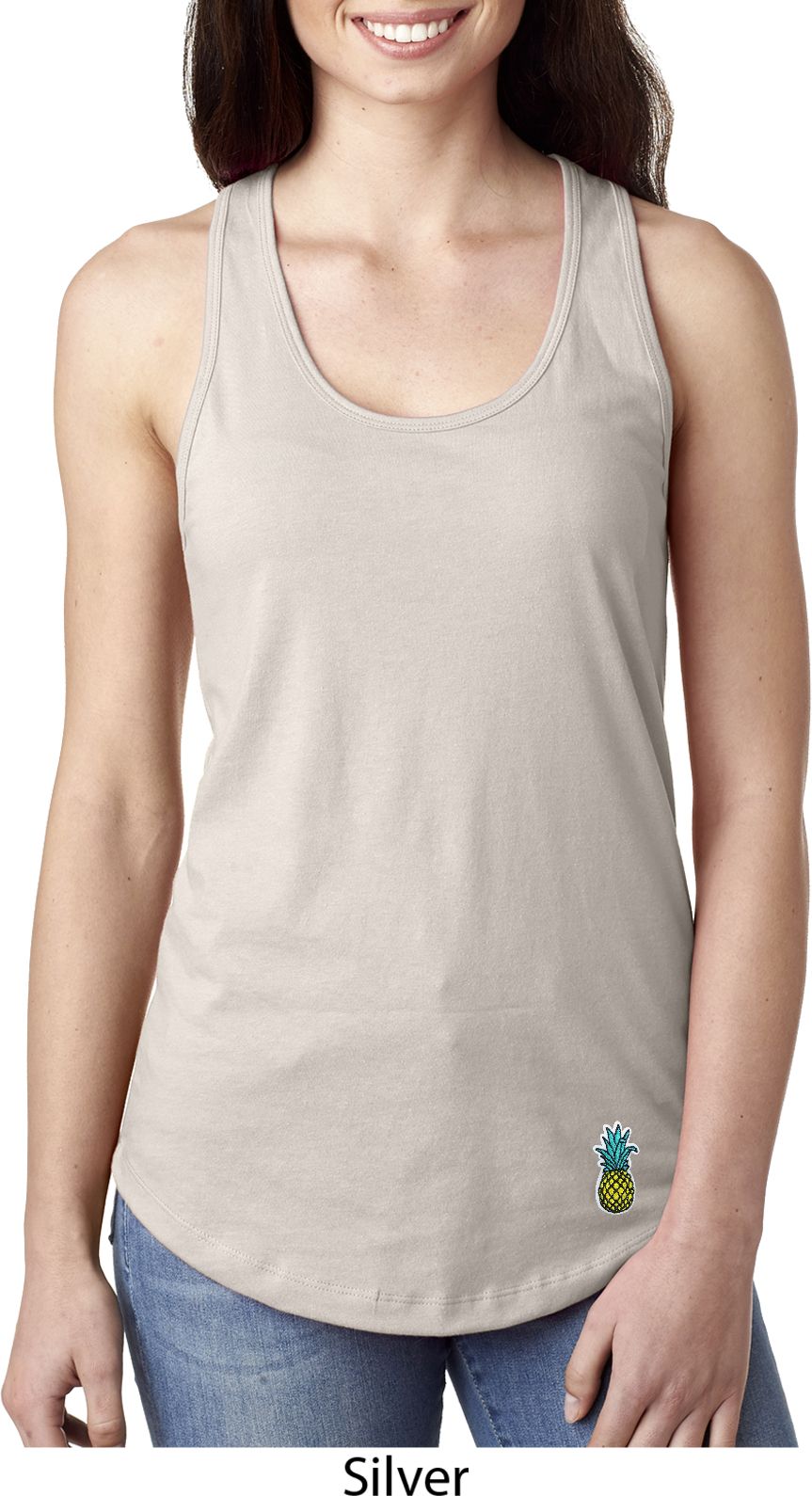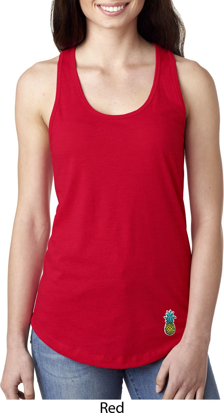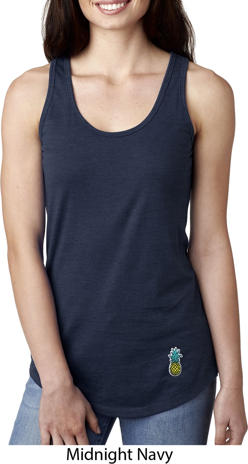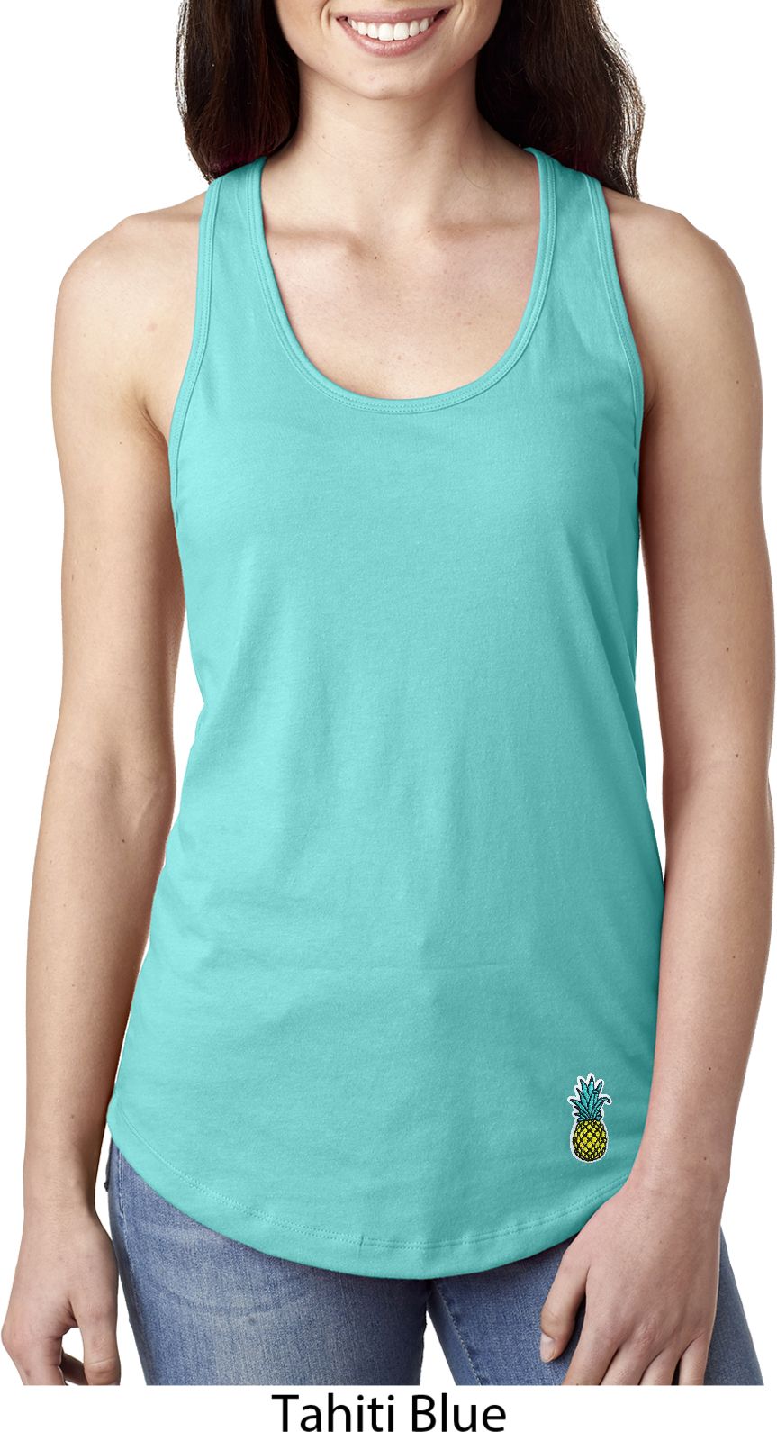 A fitted ladies racerback tanktop featuring a pineapple patch at the bottom. Our ladies tanktop is made with a blend of cotton/poly. Available in sizes Small through 2XL.