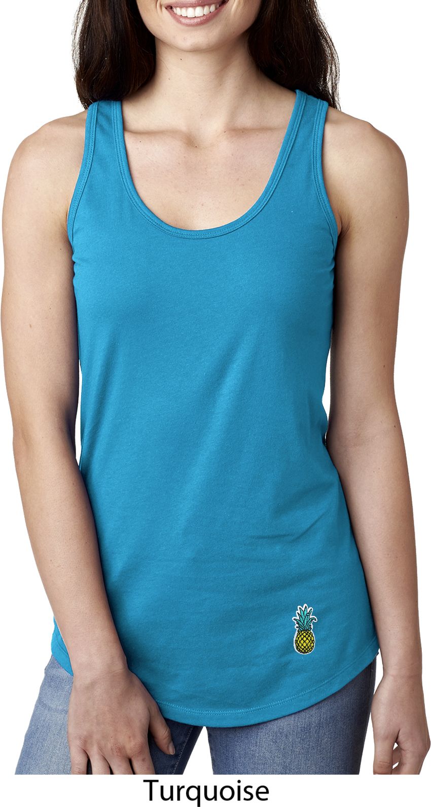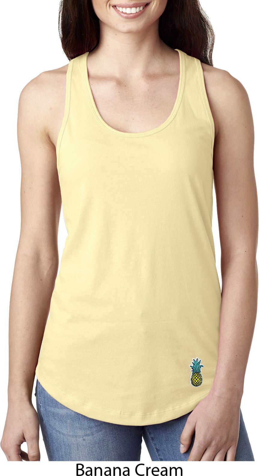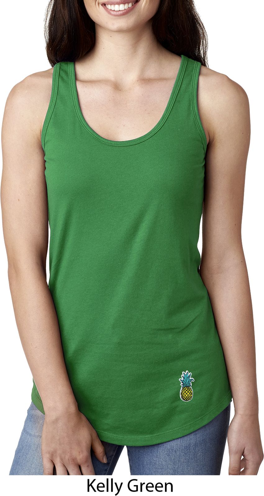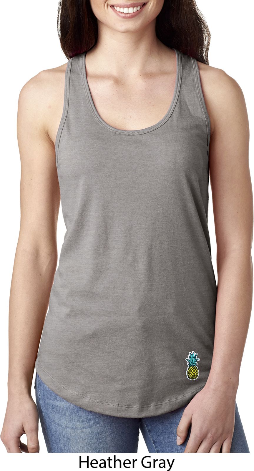 A fitted ladies racerback tanktop featuring a pineapple patch at the bottom. Our ladies tanktop is made with a blend of cotton/poly. Available in sizes Small through 2XL.