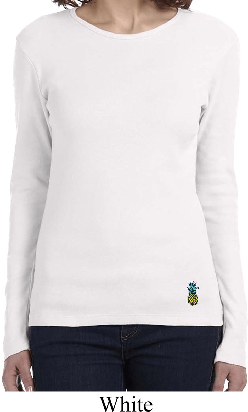 A ladies long sleeve featuring a pineapple patch at the bottom. Our fitted ladies long sleeve is made of 100% cotton. Available in sizes Small through 2XL.