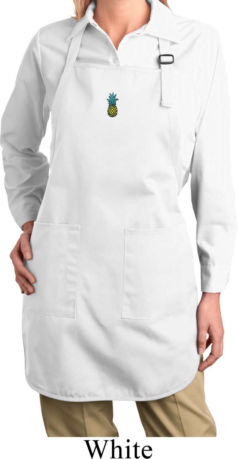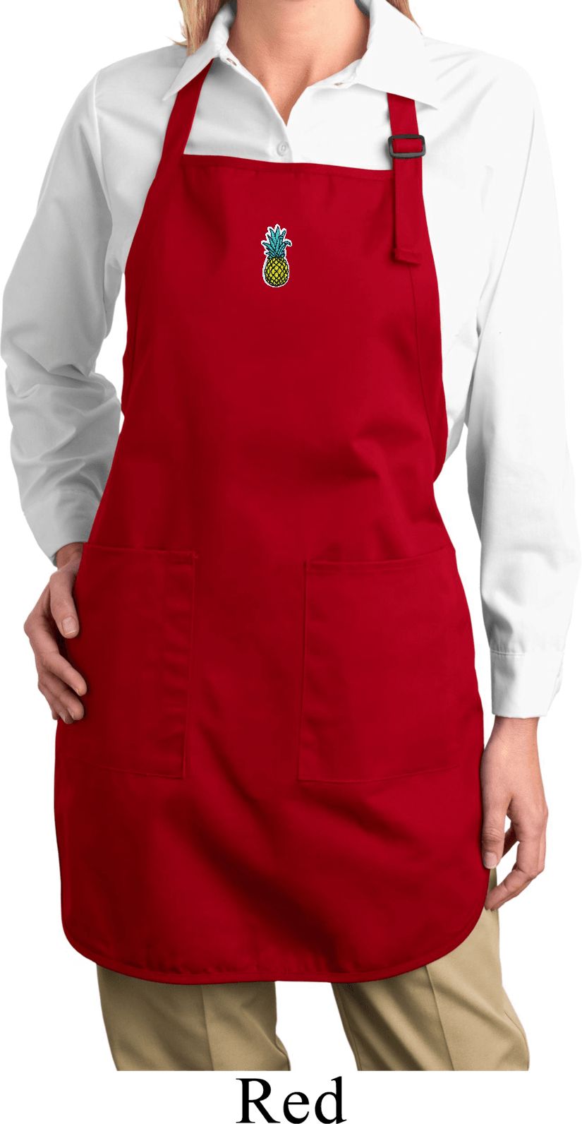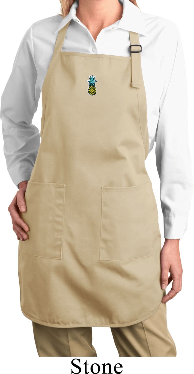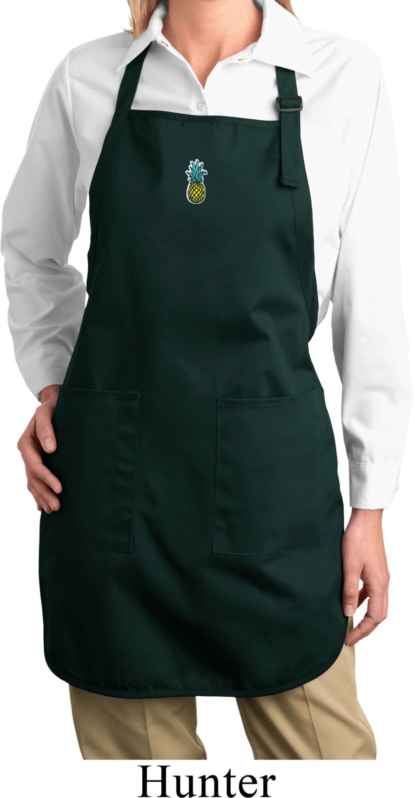 A ladies full length apron with an adjustable neck strap featuring a pineapple patch. One size fits all.