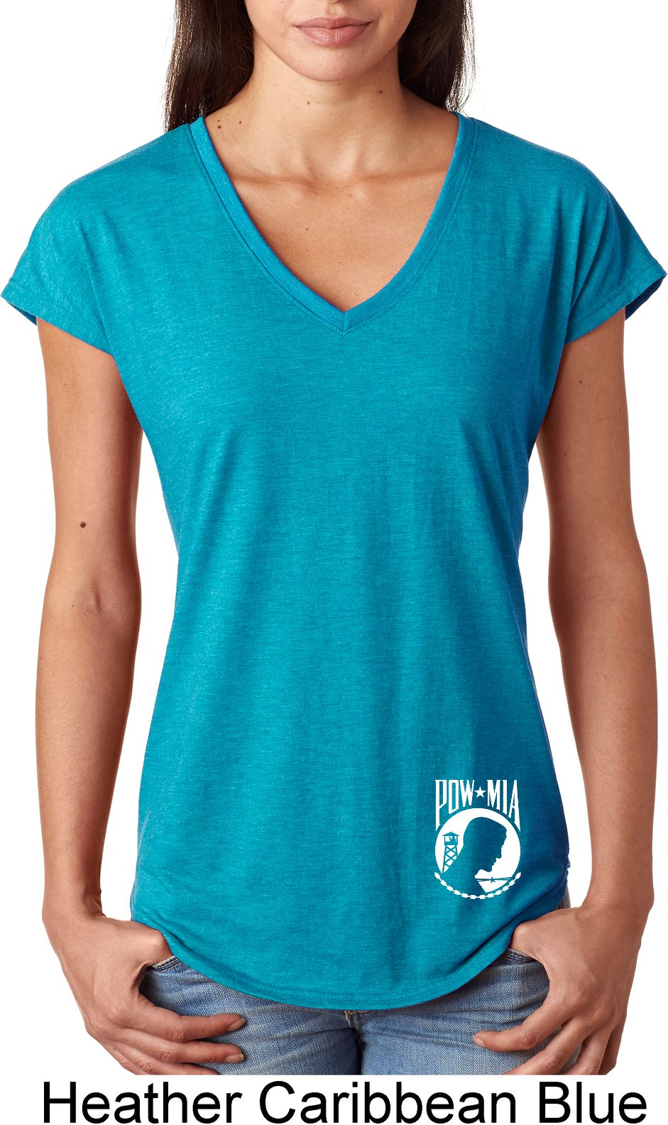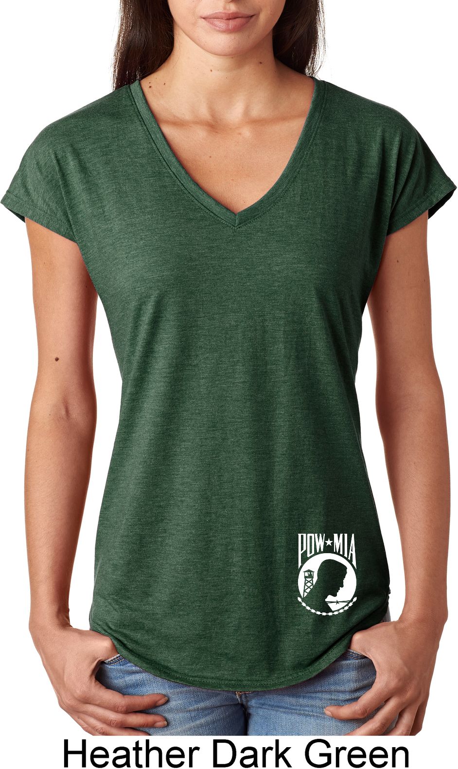 A ladies tri blend v-neck featuring Pow Mia. Our ladies tee is made with a blend of cotton/poly/rayon. Available in sizes Small through 2XL. Machine wash cold with like colors; dry low heat.