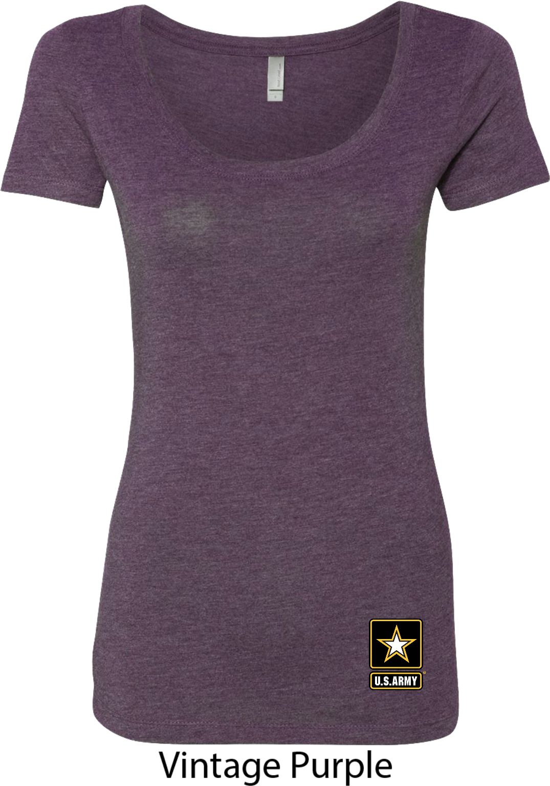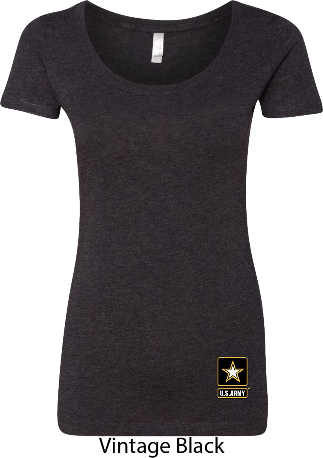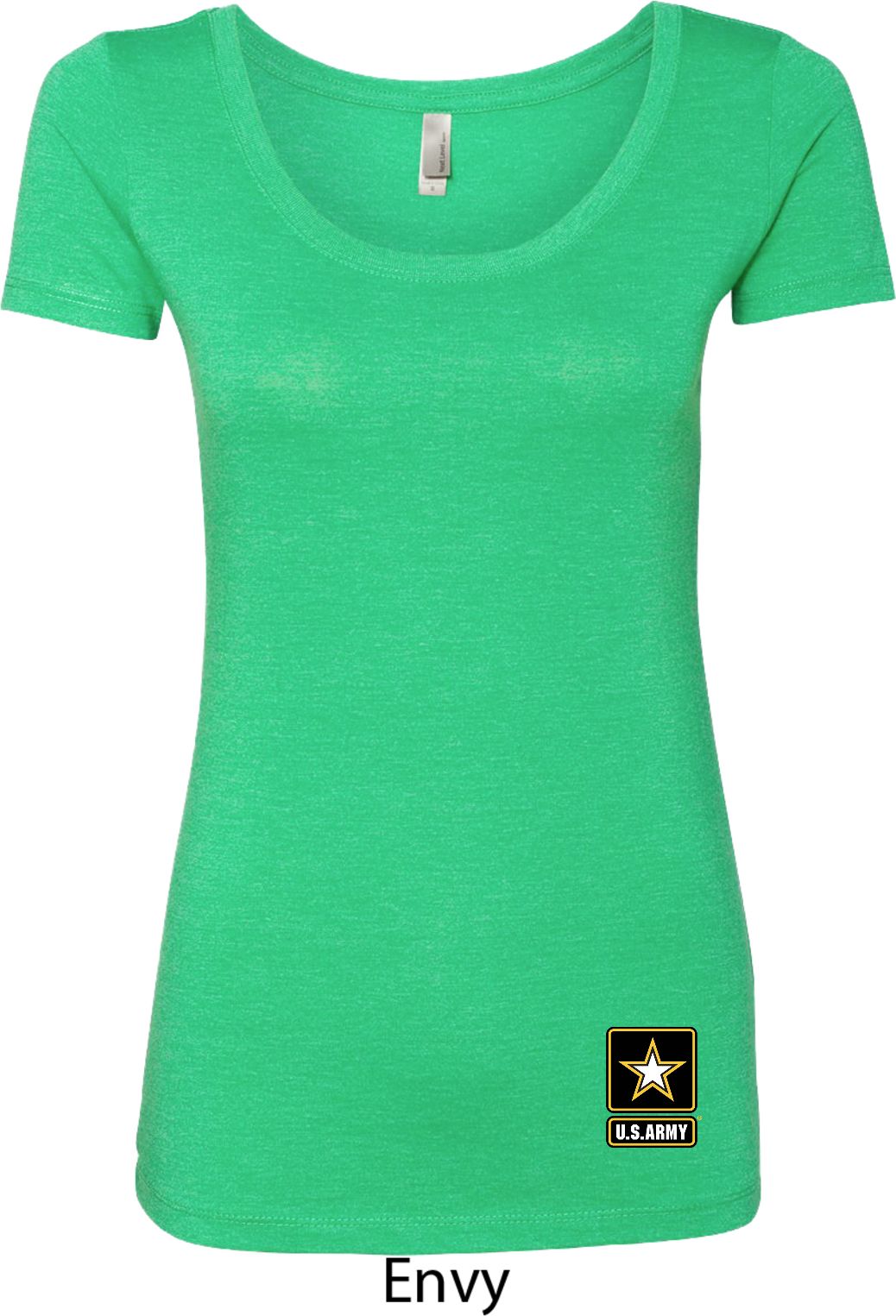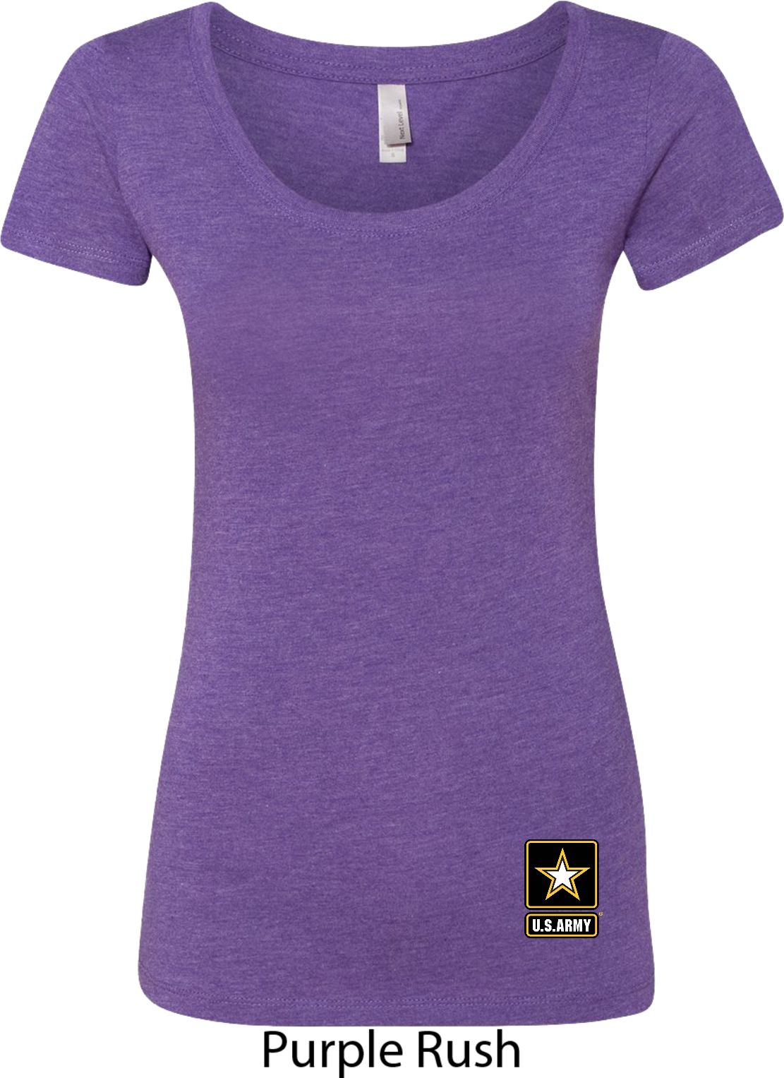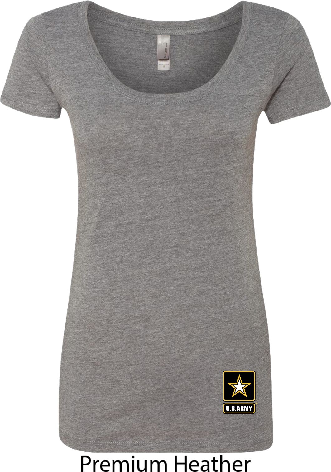 | | Ladies US Army Bottom Print Scoop NeckA ladies fitted scoop neck shirt featuring the U.S. Army logo at the bottom. Our ladies shirt is made with a blend of poly/cotton/rayon. Available in sizes Small through 2XL. Machine wash cold with like colors; dry low heat. ![]() |