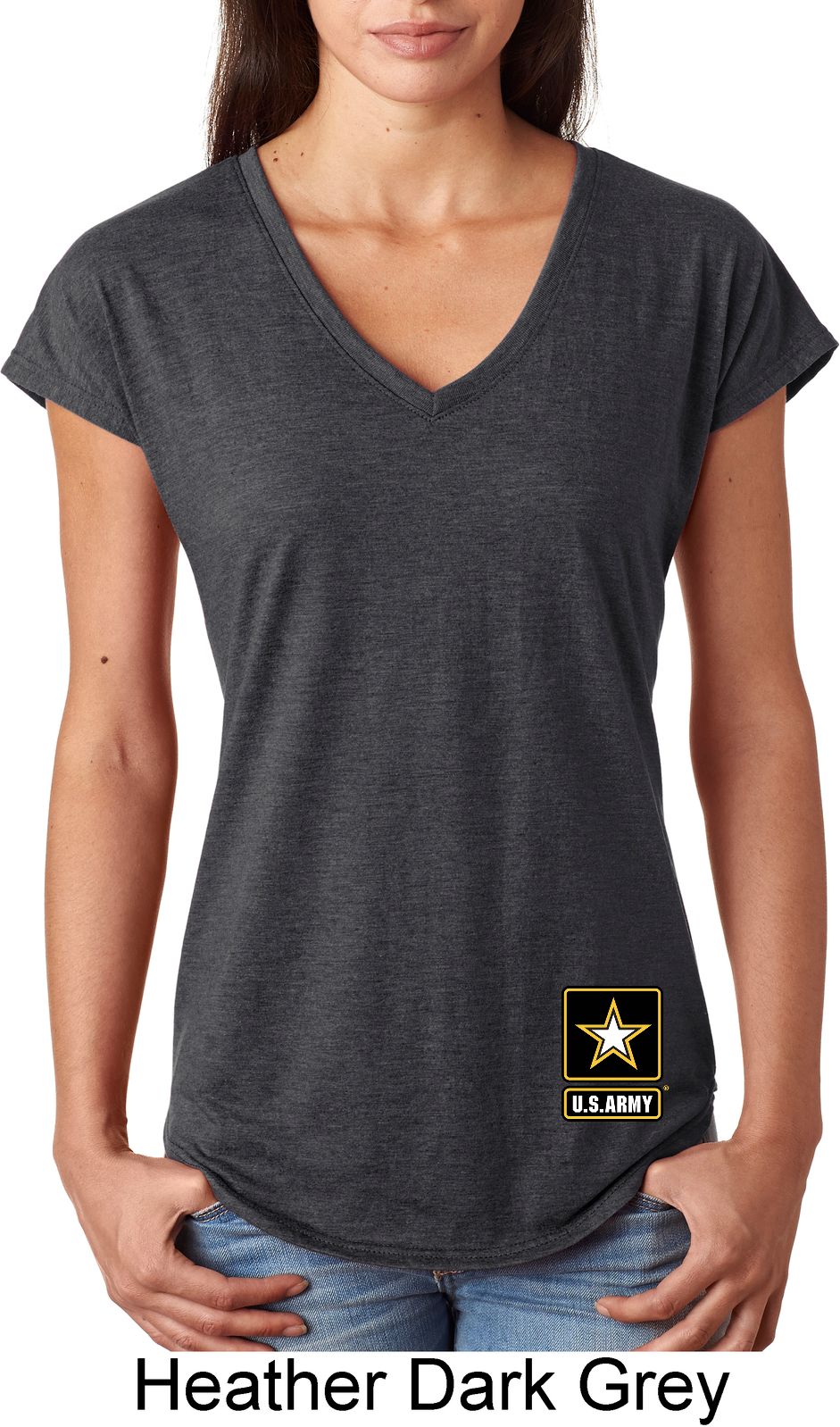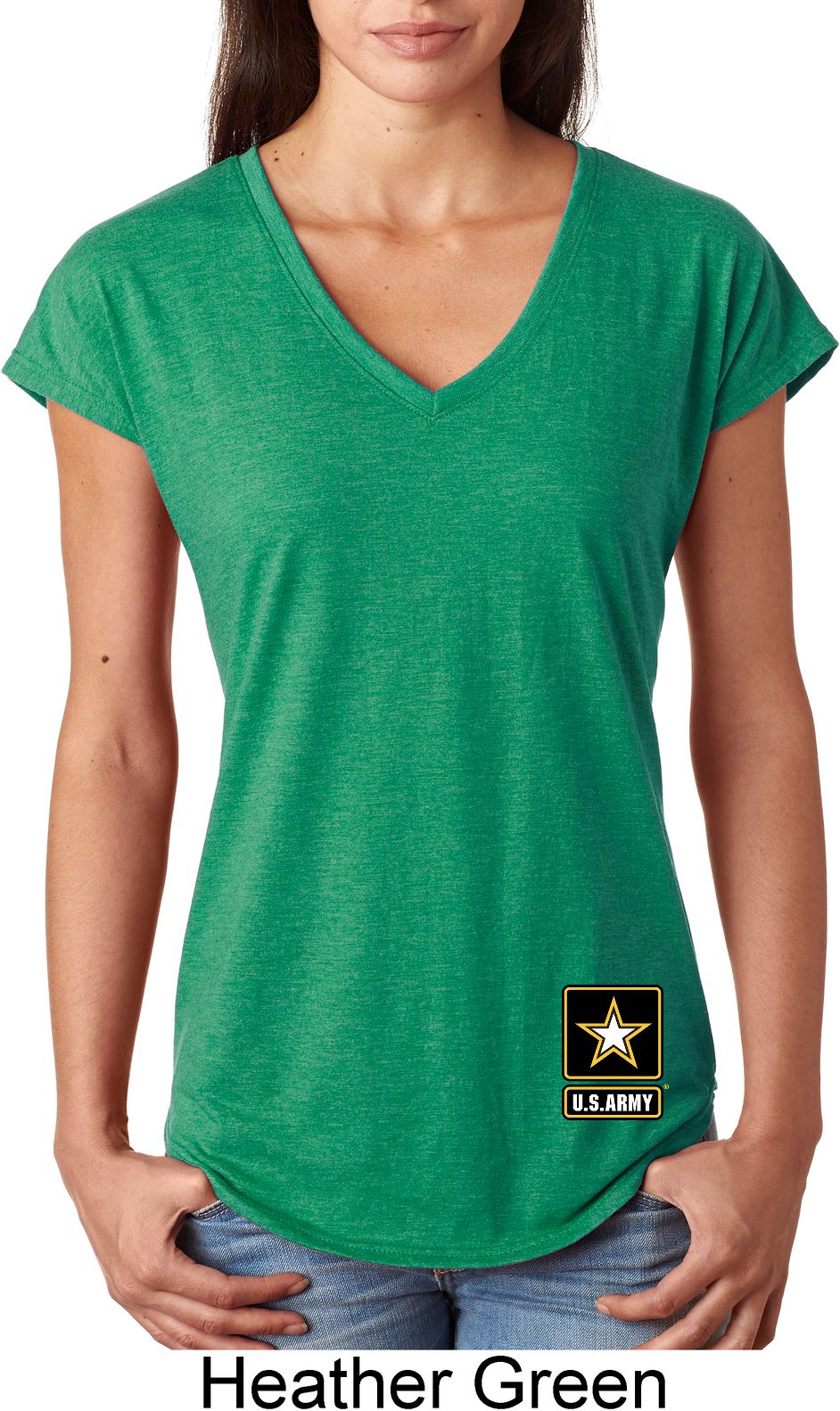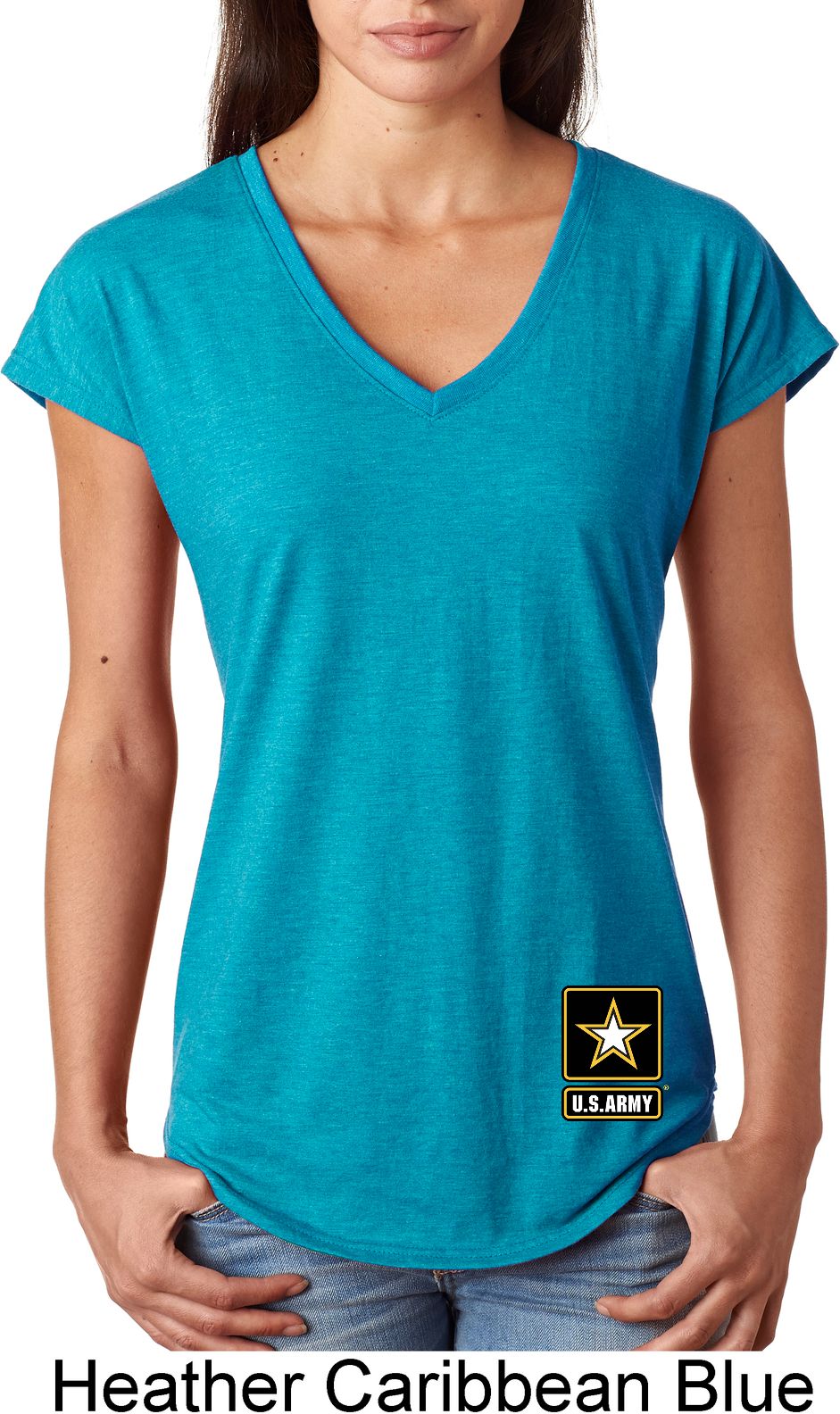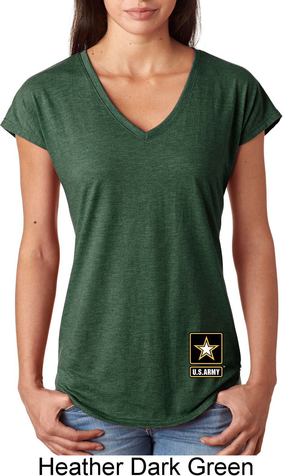 | | Ladies US Army Bottom Print Tri Blend V-neckA ladies tri blend v-neck featuring the U.S. Army logo at the bottom. Our ladies shirt is made with a blend of poly/cotton/rayon. Available in sizes Small through 2XL. Machine wash cold with like colors; dry low heat. ![]() |
