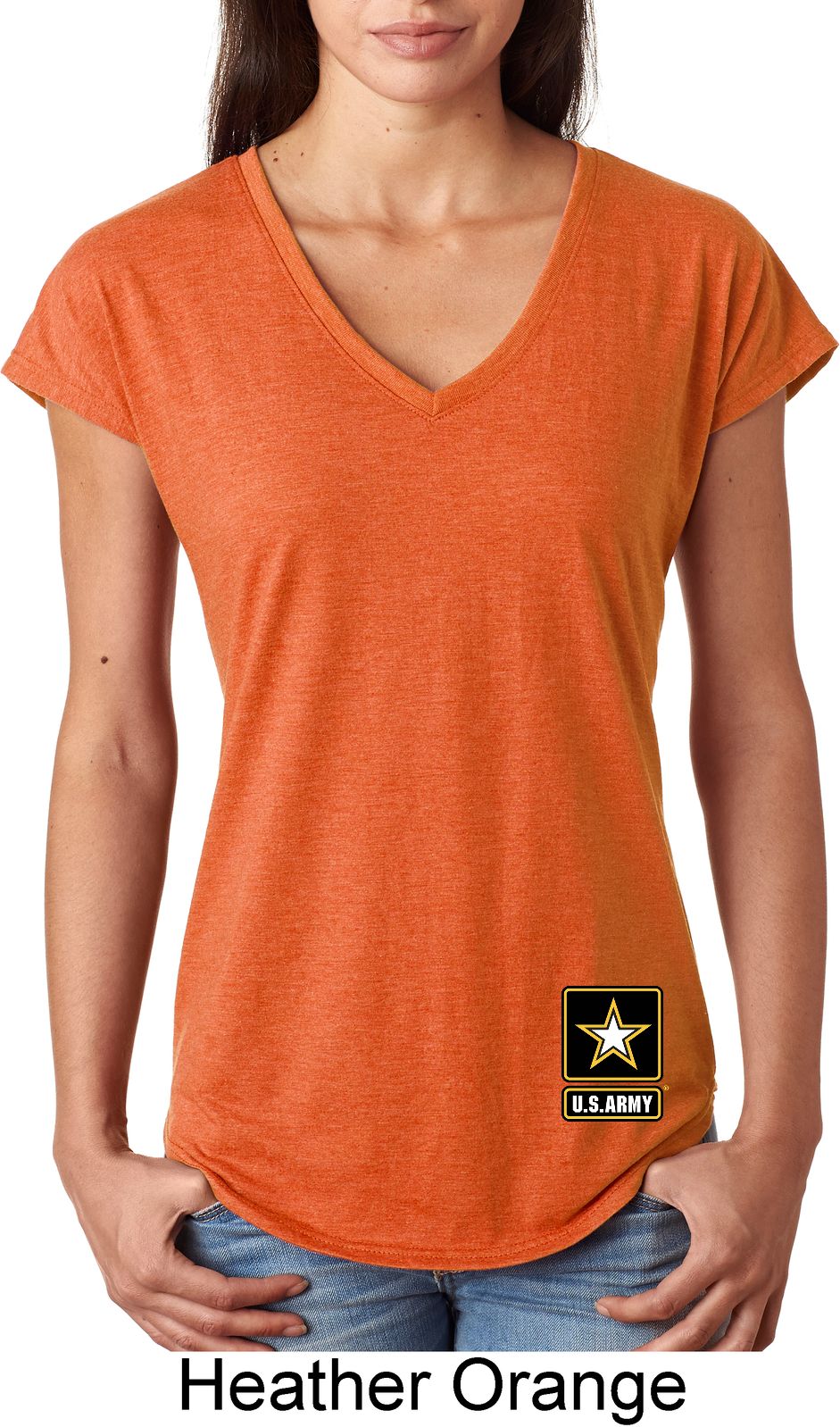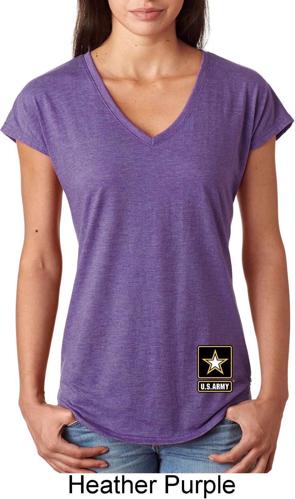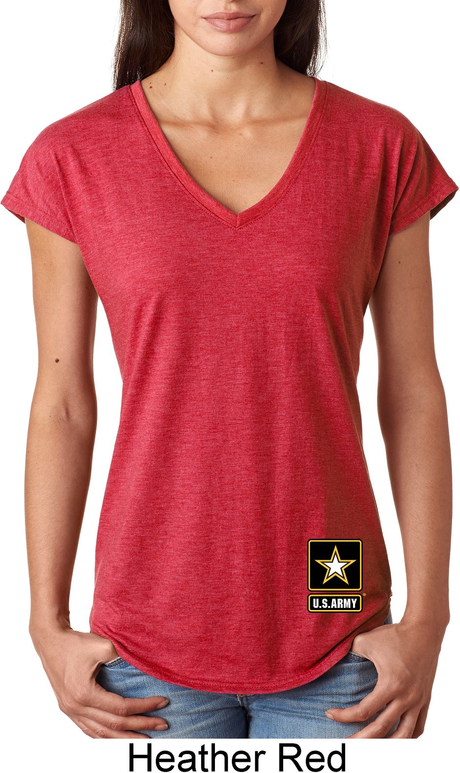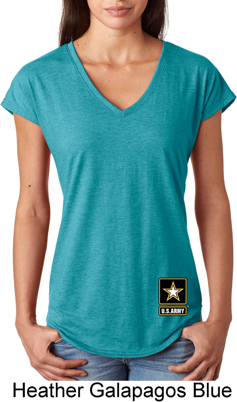 | | Ladies US Army Bottom Print Tri Blend V-neckA ladies tri blend v-neck featuring the U.S. Army logo at the bottom. Our ladies shirt is made with a blend of poly/cotton/rayon. Available in sizes Small through 2XL. Machine wash cold with like colors; dry low heat. ![]() |