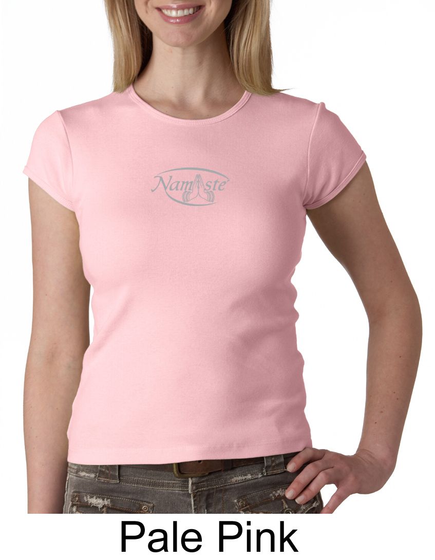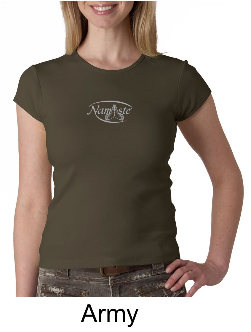 | | Ladies Yoga T-shirt Namaste Small Print Crew Neck ShirtThis Ladies Yoga T-shirt Namaste Small Print Crew Neck Shirt features graceful image of Namaste symbolizing traditionally preferred non-contact greeting and valediction upon parting in India where slight bow is made with hands pressed together in front of chest representing belief in our Divine Spark located in heart chakra respectful acknowledgement of one soul to another I bow to you. Our shirt gently captures Namaste while its 100% combed ringspun cotton, super soft 1x1 baby rib knit fabric, sideseamed, set-in cap sleeves and contoured fit makes an incredible choice for every woman in an array of classic shades to choose complementing every wear. Available in Ladies Small, Ladies Medium, Ladies Large, Ladies XL & Ladies 2XL |