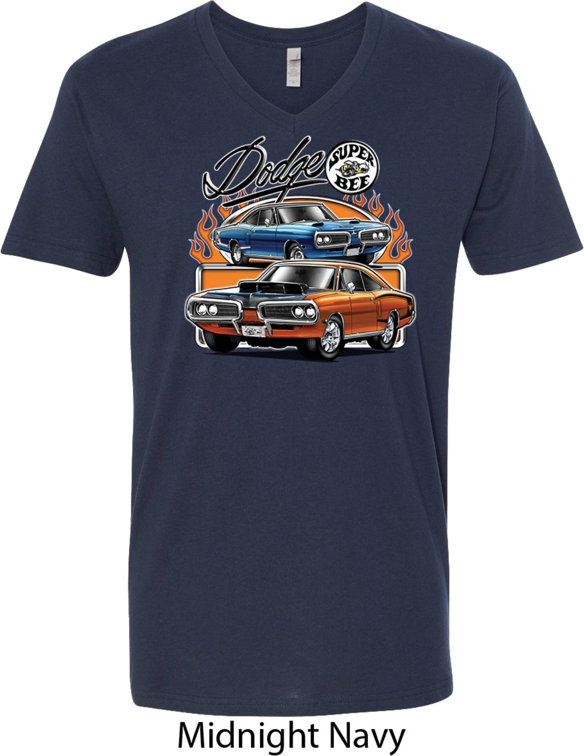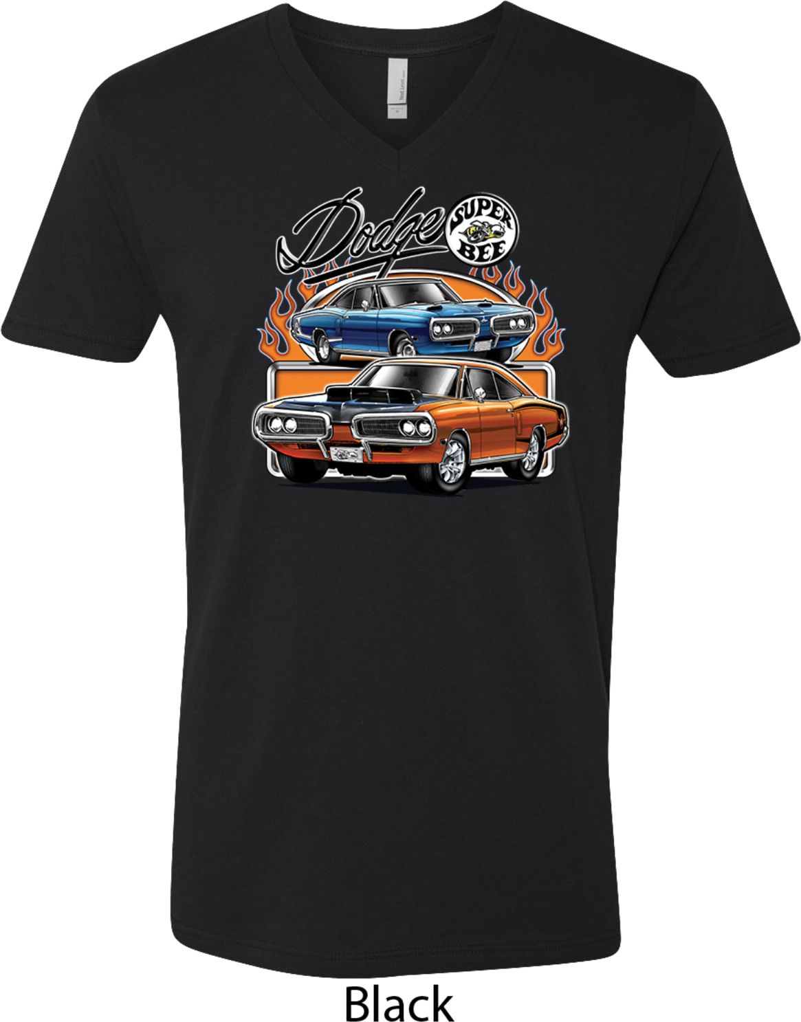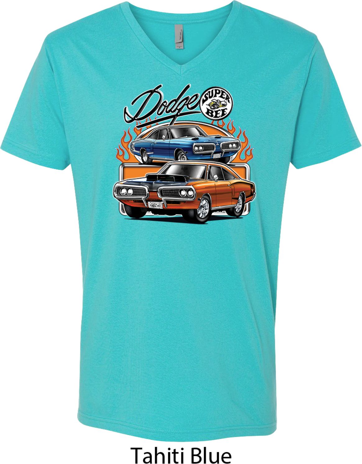 | | Mens Dodge Blue and Orange Super Bee V-neckA mens v-neck featuring a blue and orange Dodge Super Bee. Our mens tee is made of 100% cotton. (Heather Grey is made with a blend of cotton/poly) Available in sizes Small through 2XL. Machine wash cold with like colors; dry low heat. ![]() |
