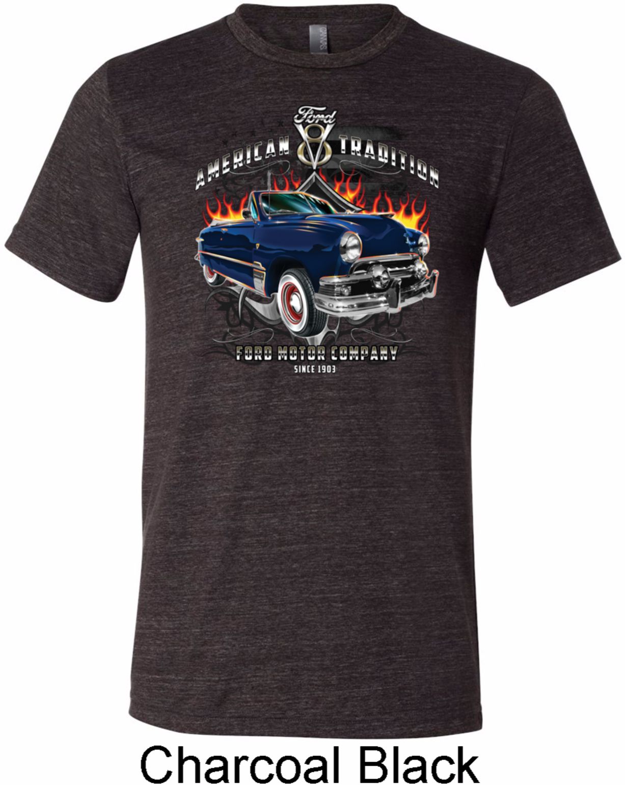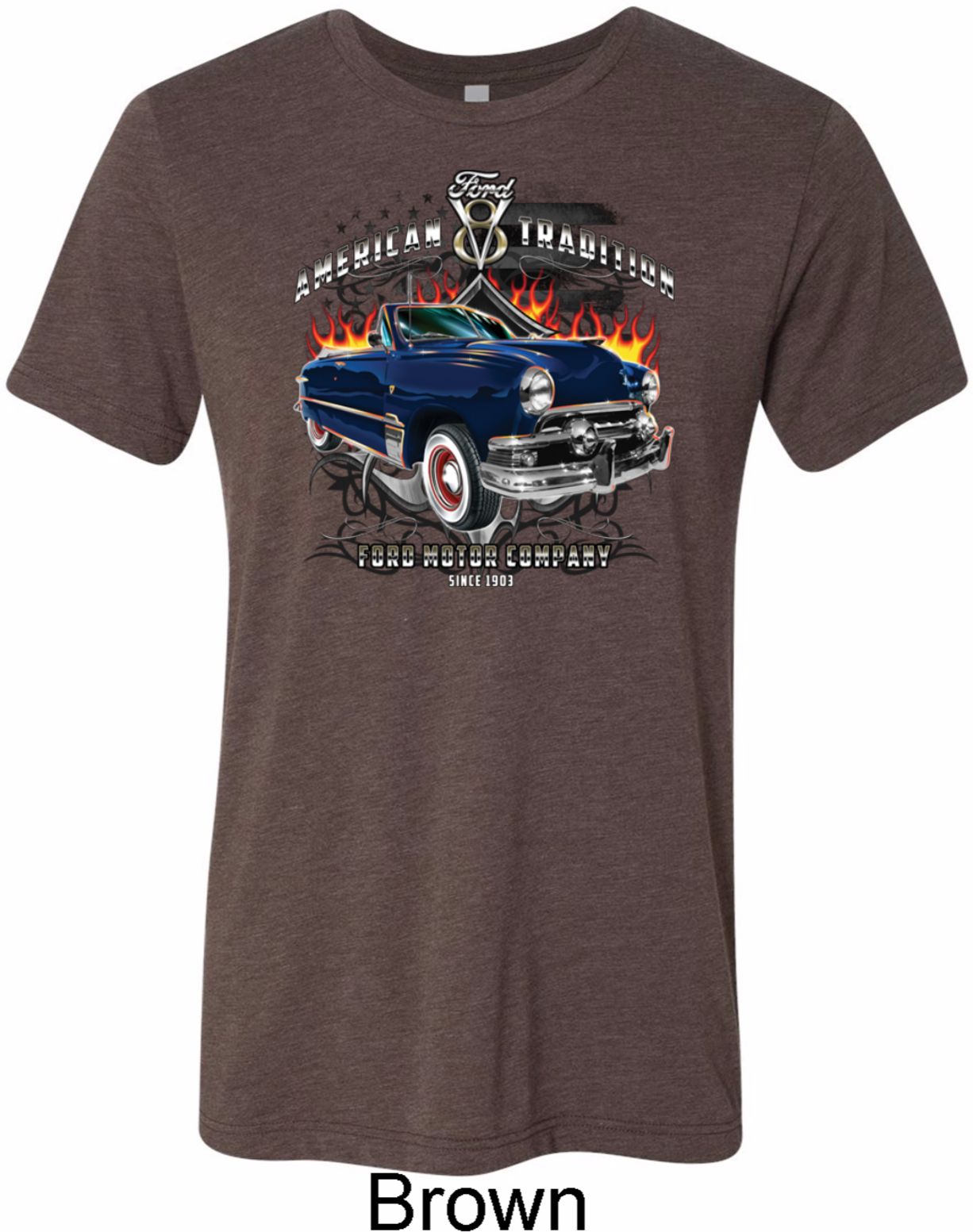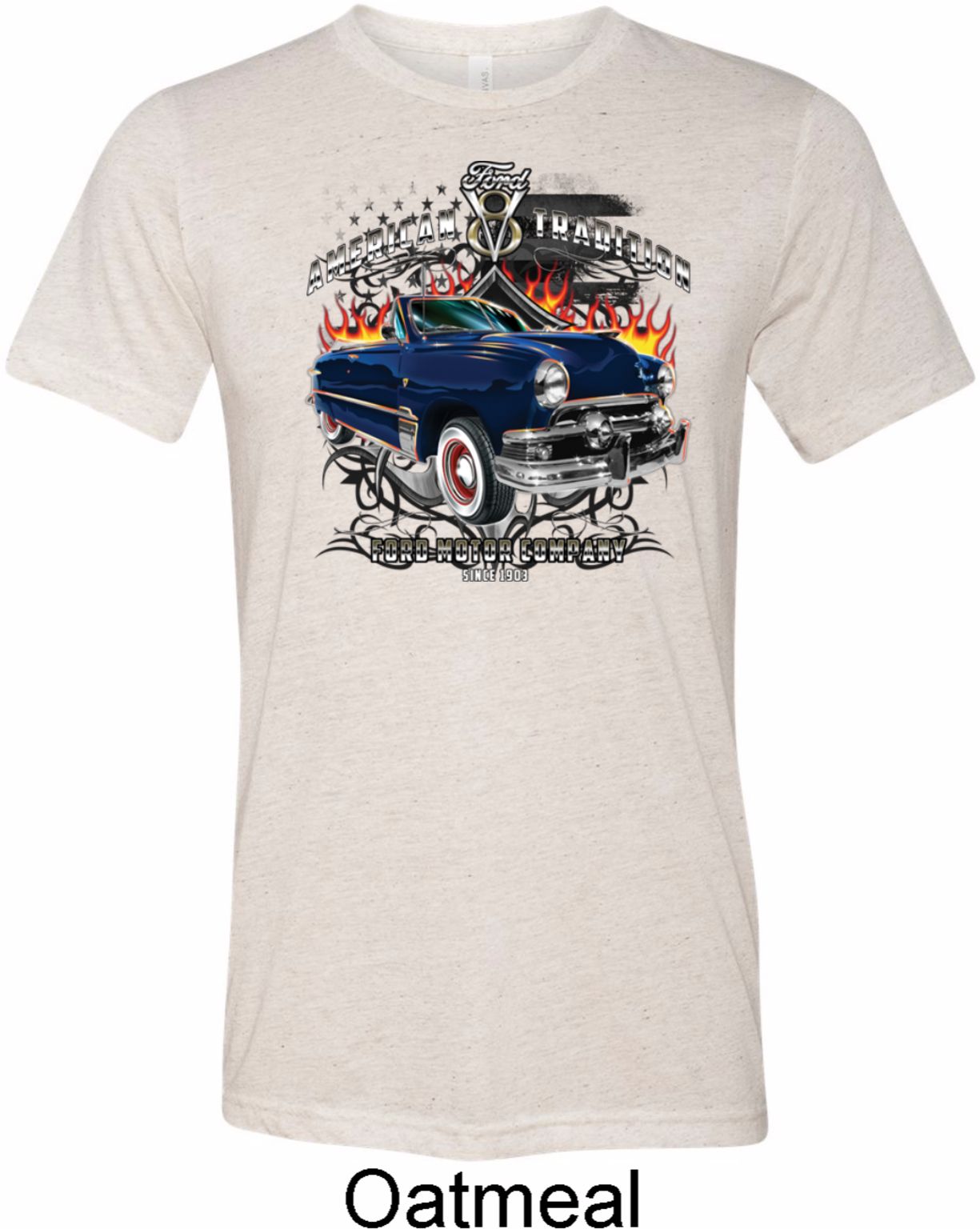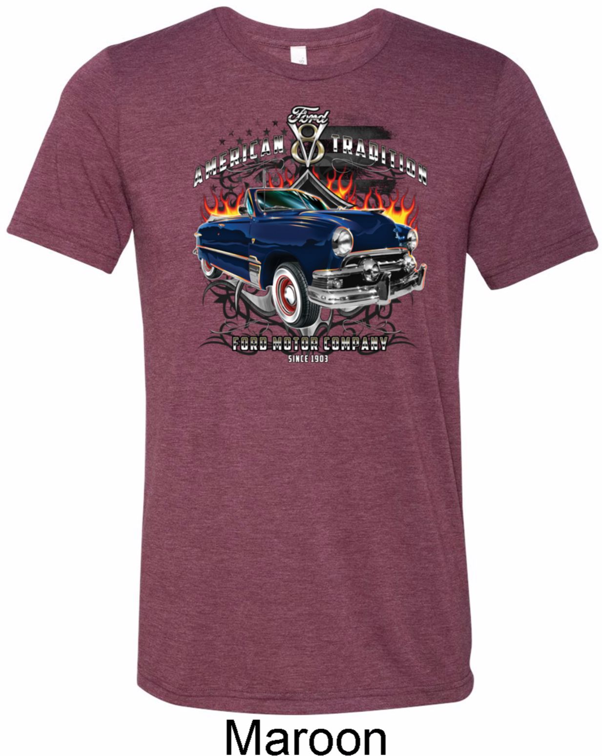 | | Mens Ford Shirt American Tradition Tri Blend Crewneck ShirtMens Ford Shirt American Tradition Tri Blend Crewneck Shirt A cool shirt to wear to a car show A cotton/poly/rayon blend Available in Small, Medium, Large, XL & 2XL Also available in colors Aqua, Athletic Grey, Berry, Blue, Brown, Charcoal Black, Clay, Emerald, Green, Grey, Maroon, Navy, Oatmeal, Orange, Purple, Red, Solid Black, Teal, Royal, and White |