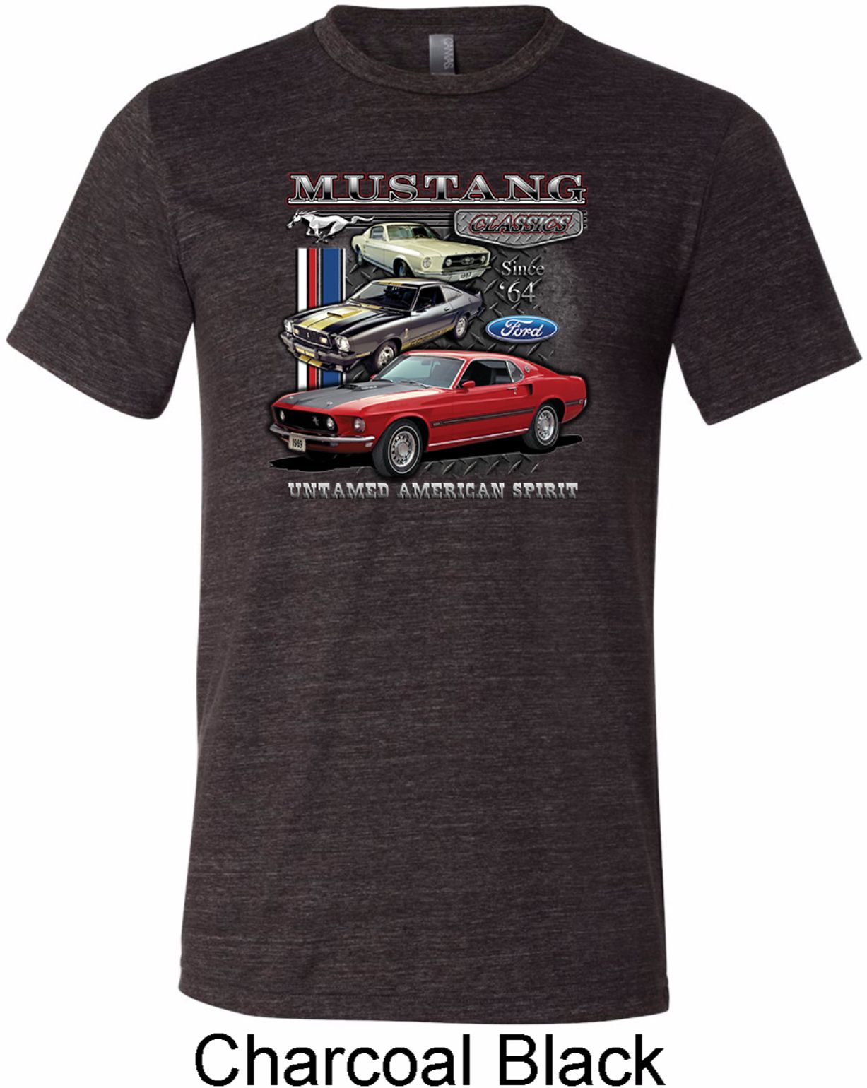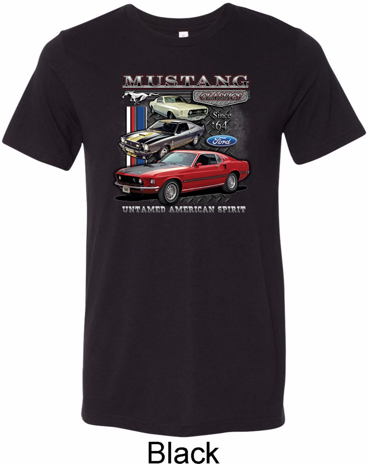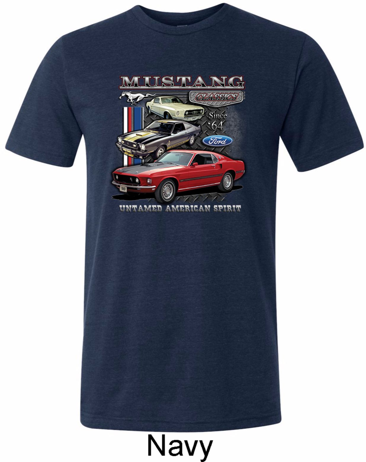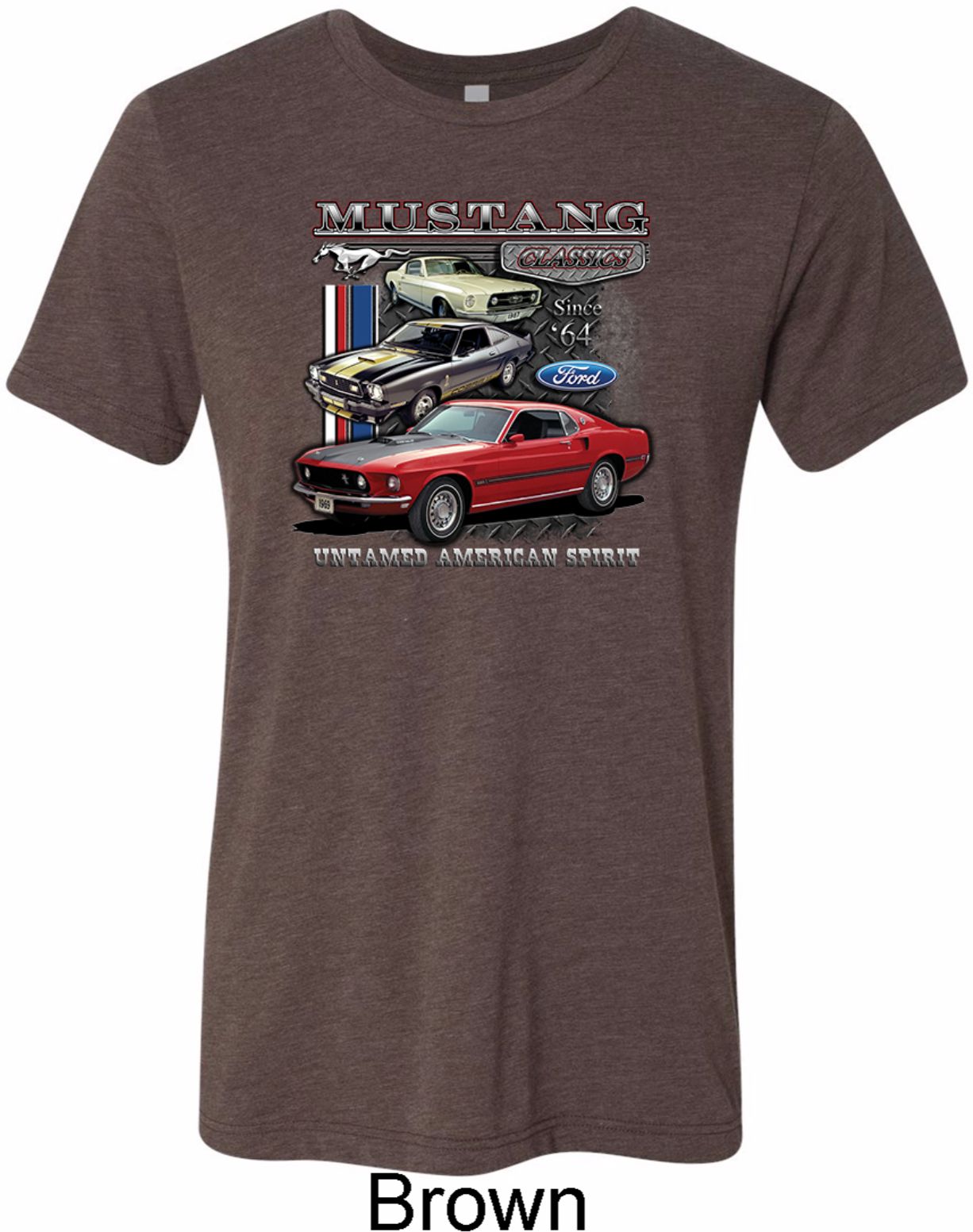 | | Mens Ford Tee Classic Mustangs Untamed Tri Blend TeeA mens tri blend t-shirt featuring Ford Mustang Classics since 1964, Untamed American Spirit. Our mens shirt is made with a blend of poly/cotton/rayon. Available in sizes Small through 3XL. Machine wash cold with like colors; dry low heat. ![]() |
