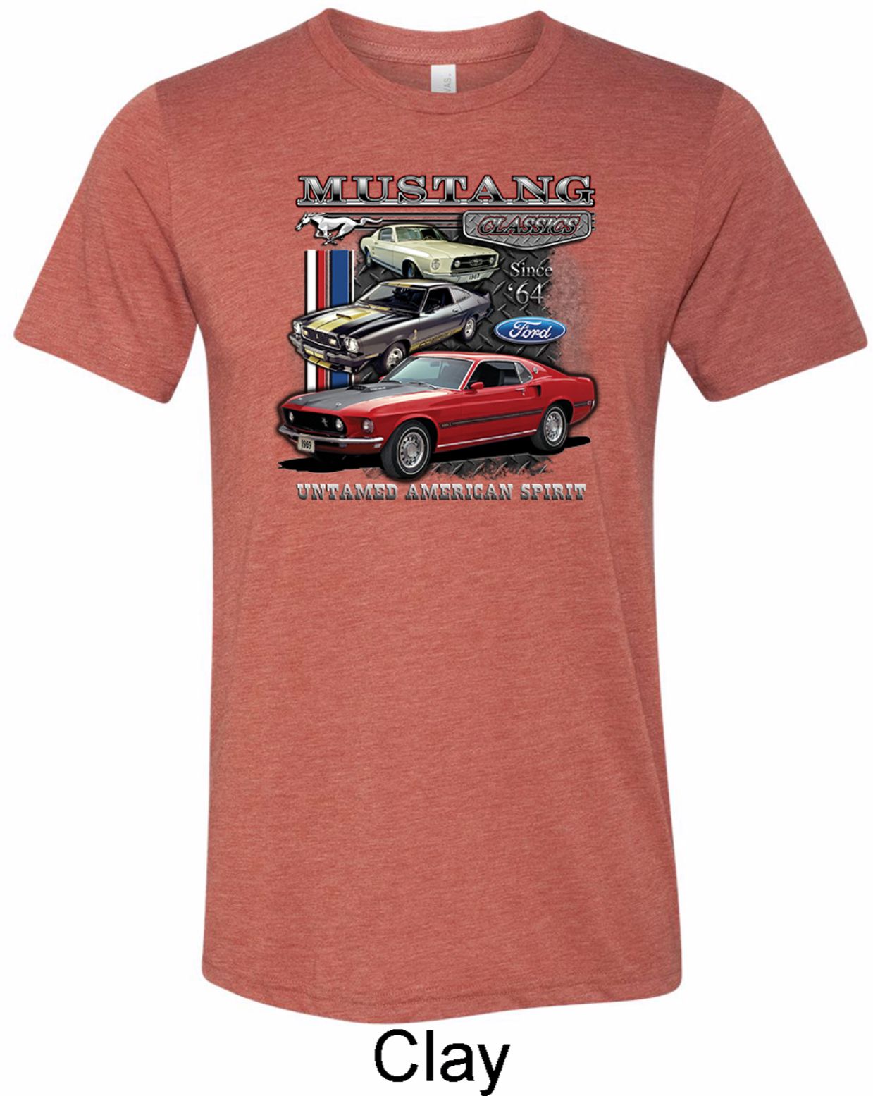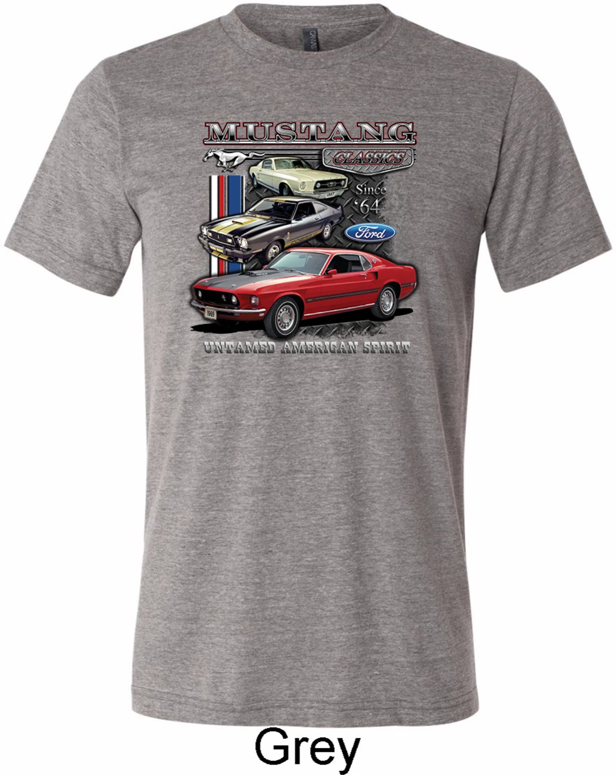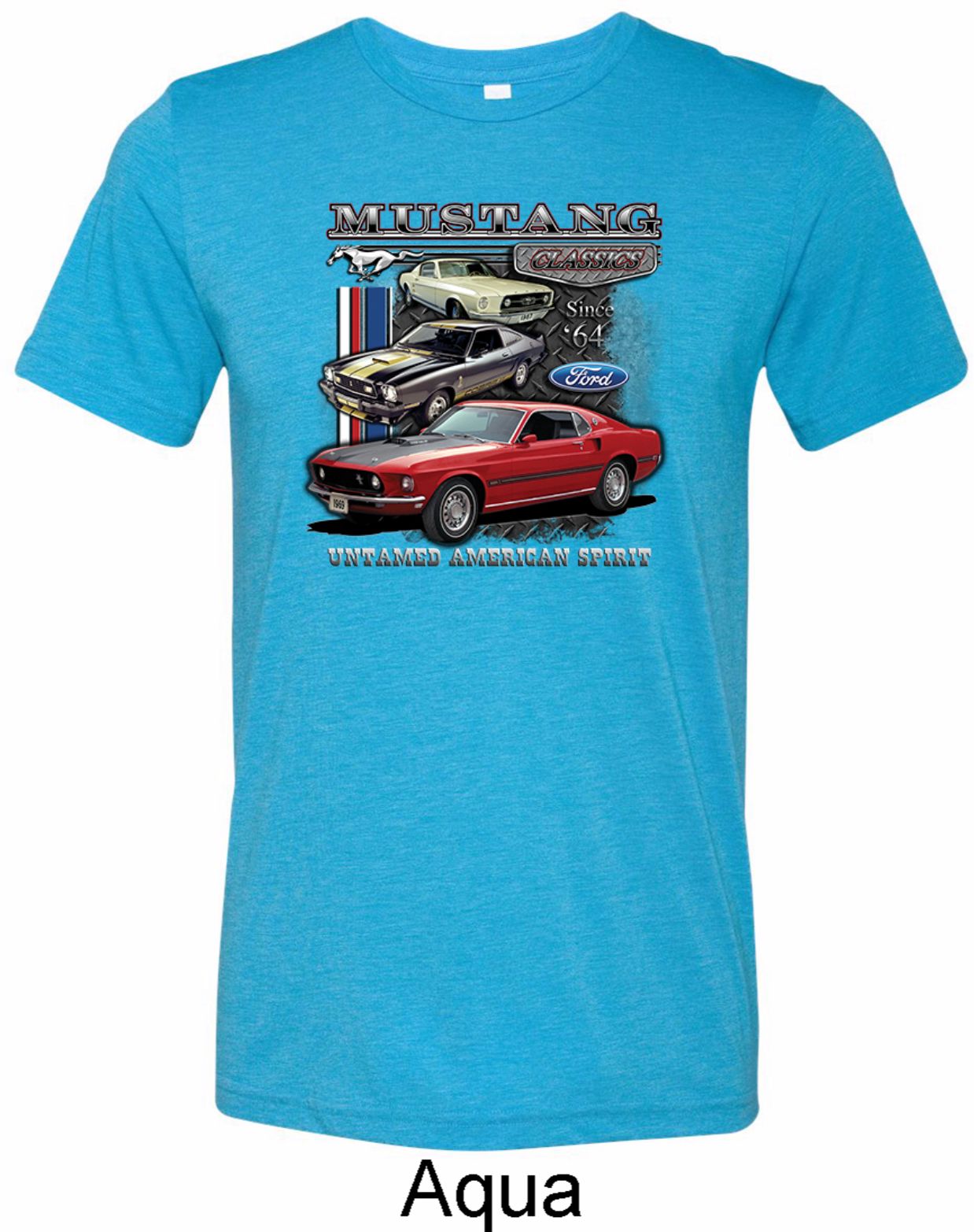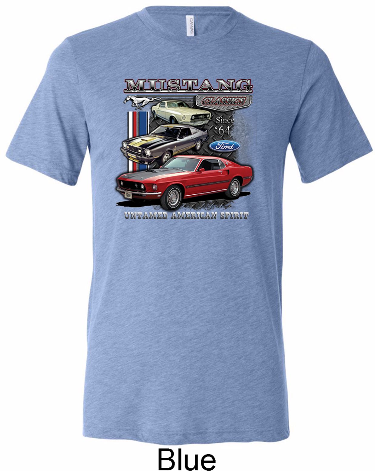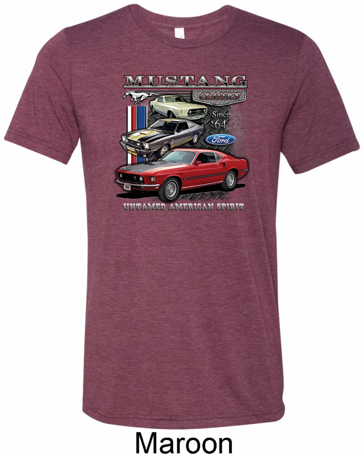 | | Mens Ford Tee Classic Mustangs Untamed Tri Blend TeeA mens tri blend t-shirt featuring Ford Mustang Classics since 1964, Untamed American Spirit. Our mens shirt is made with a blend of poly/cotton/rayon. Available in sizes Small through 3XL. Machine wash cold with like colors; dry low heat. ![]() |