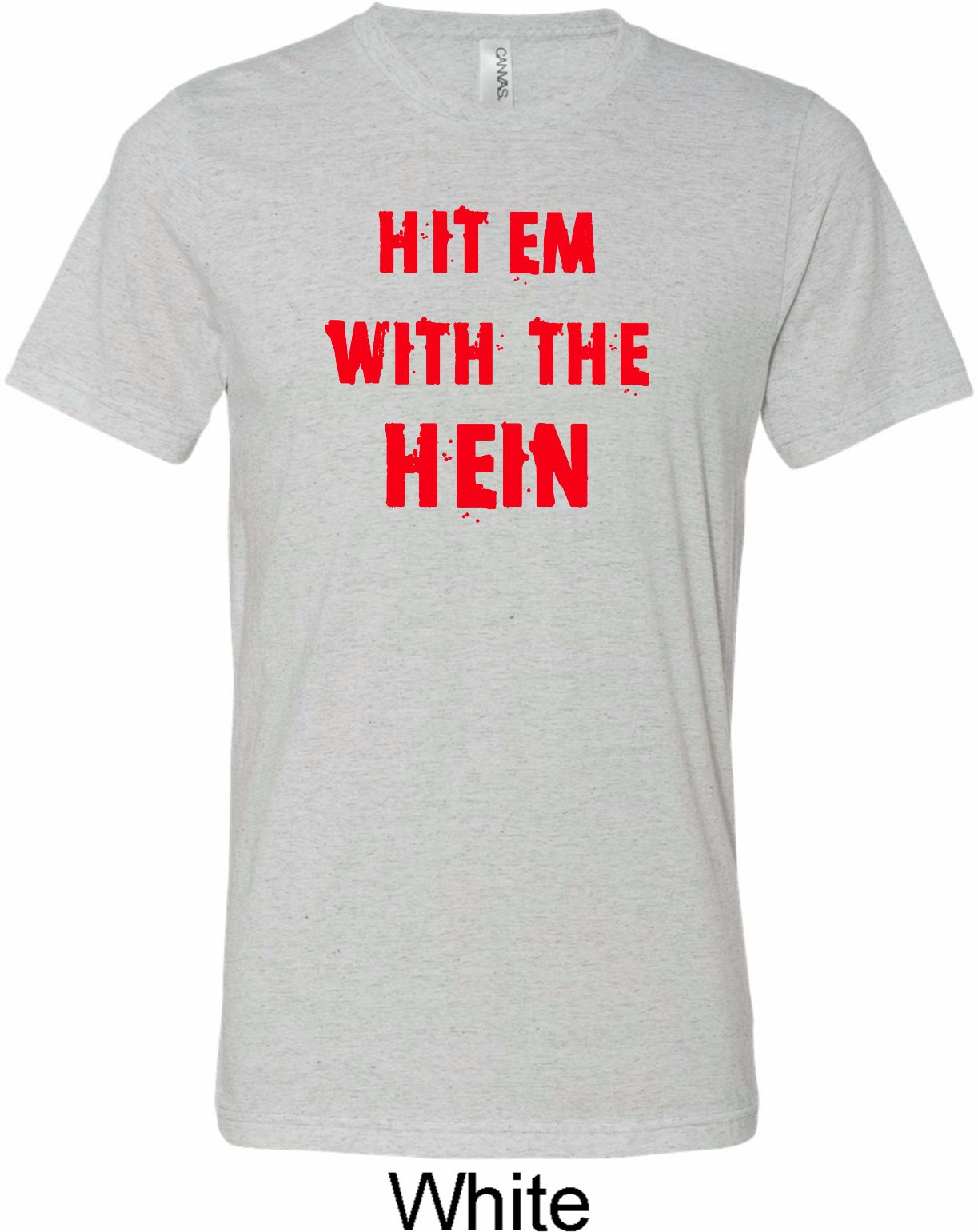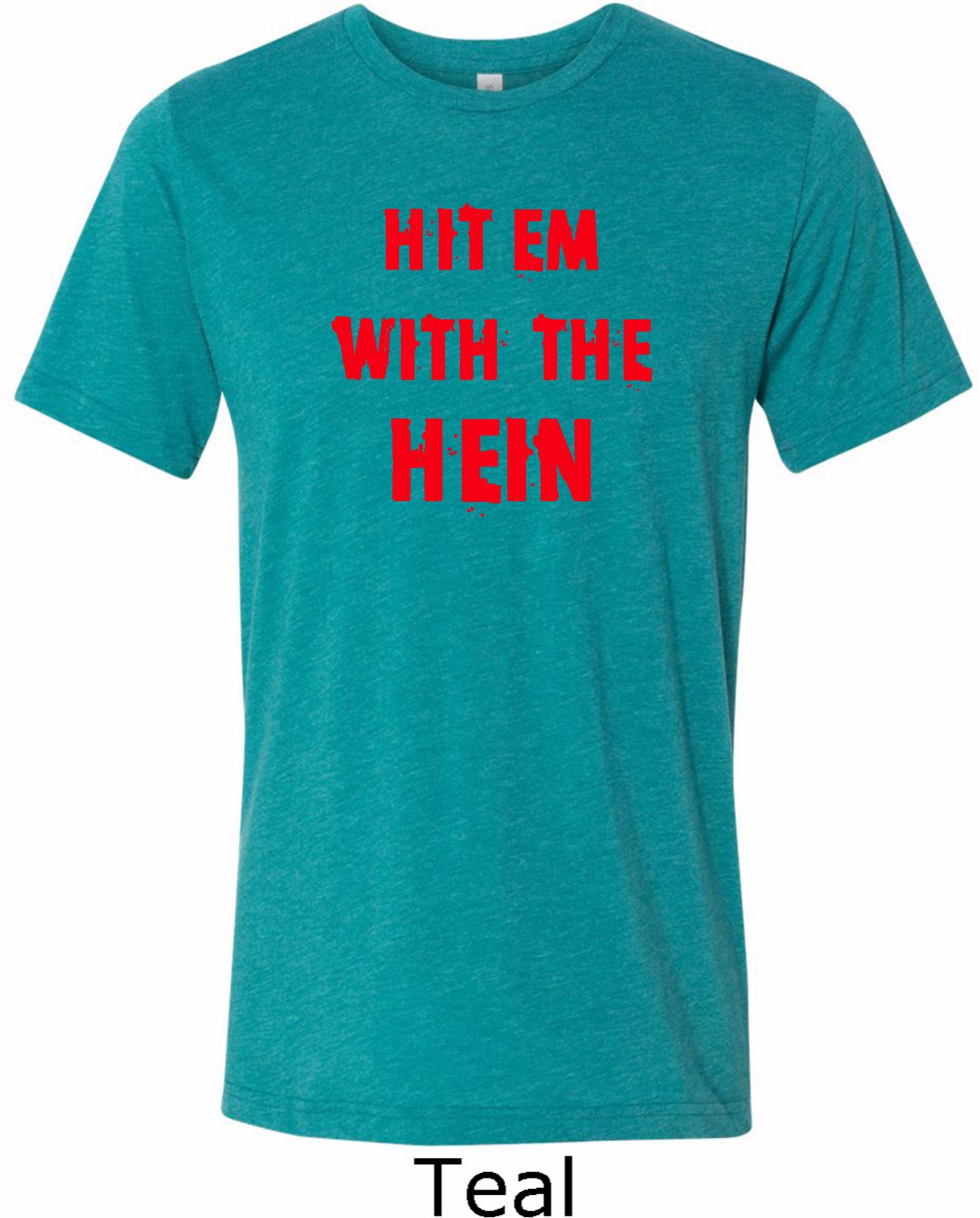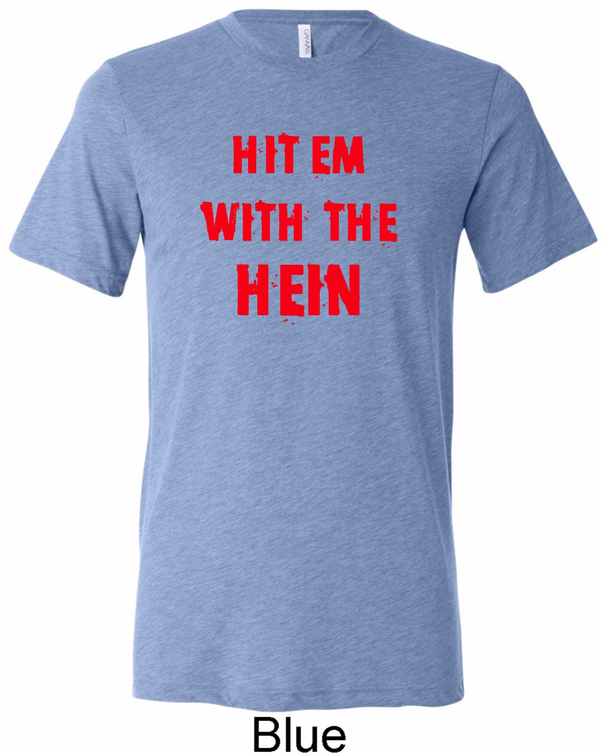 | | Mens Funny Tee Hit em with the Hein Tri Blend TeeA mens tri blend shirt featuring the funny saying Hit 'em with the Hein in red lettering. Our mens shirt is made with a blend of cotton/poly/rayon. Available in sizes Small through 3XL. Machine wash cold with like colors; dry low heat. ![]() |