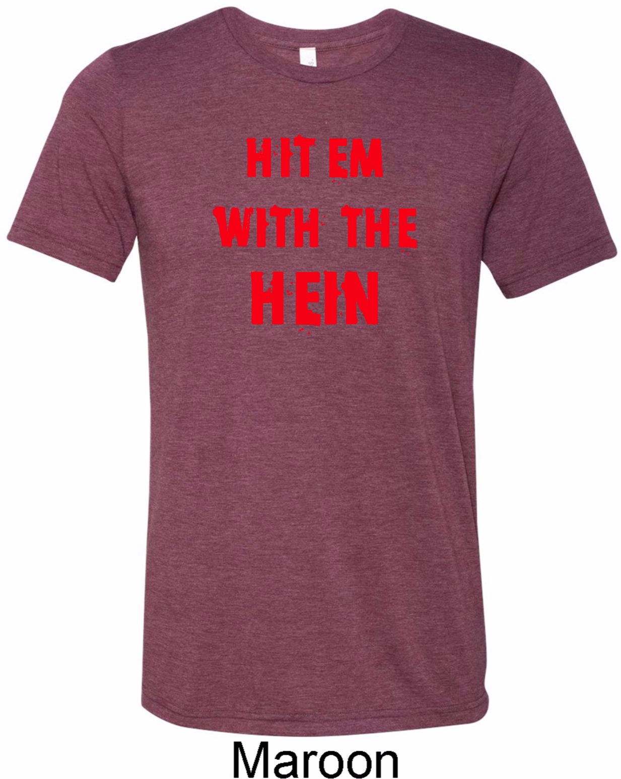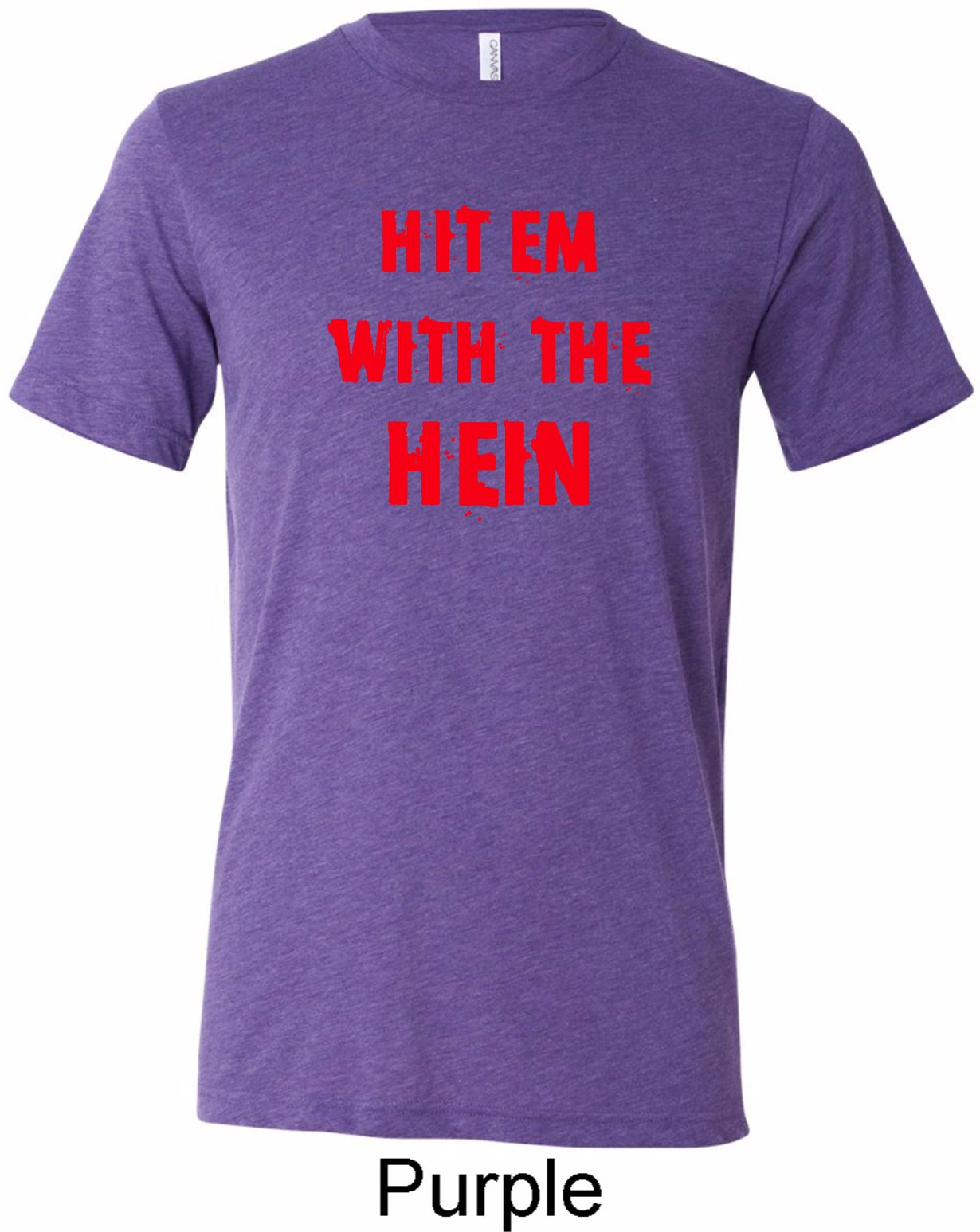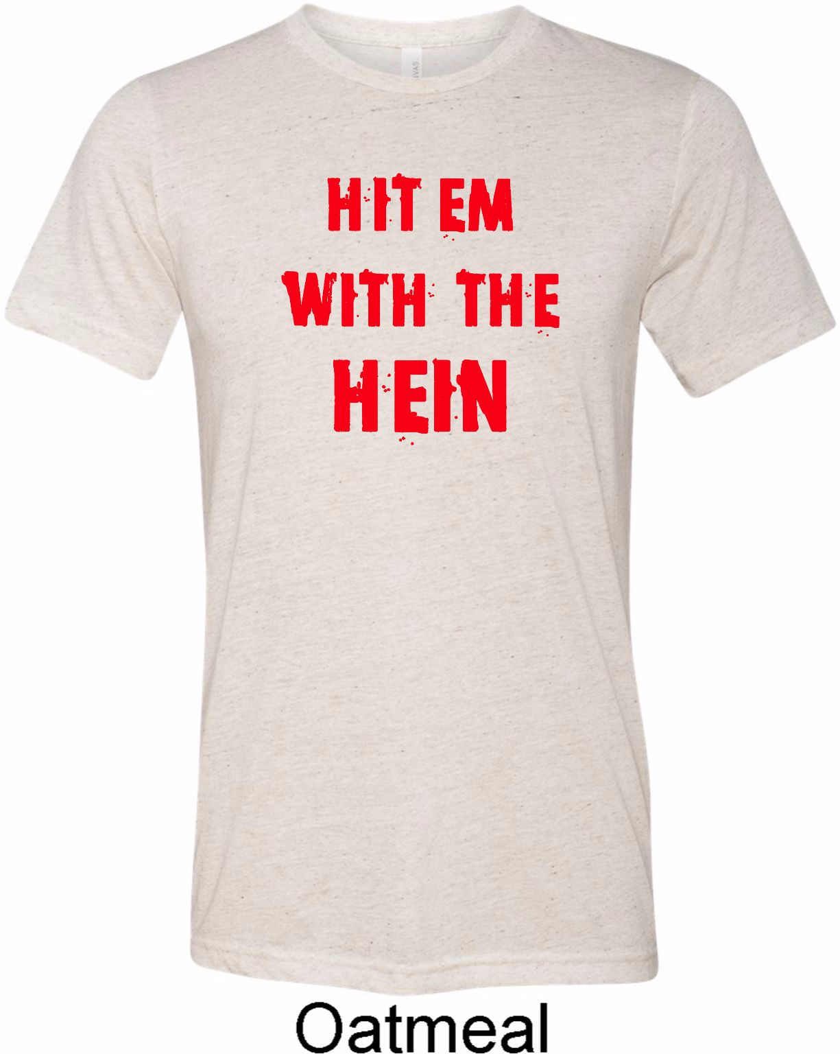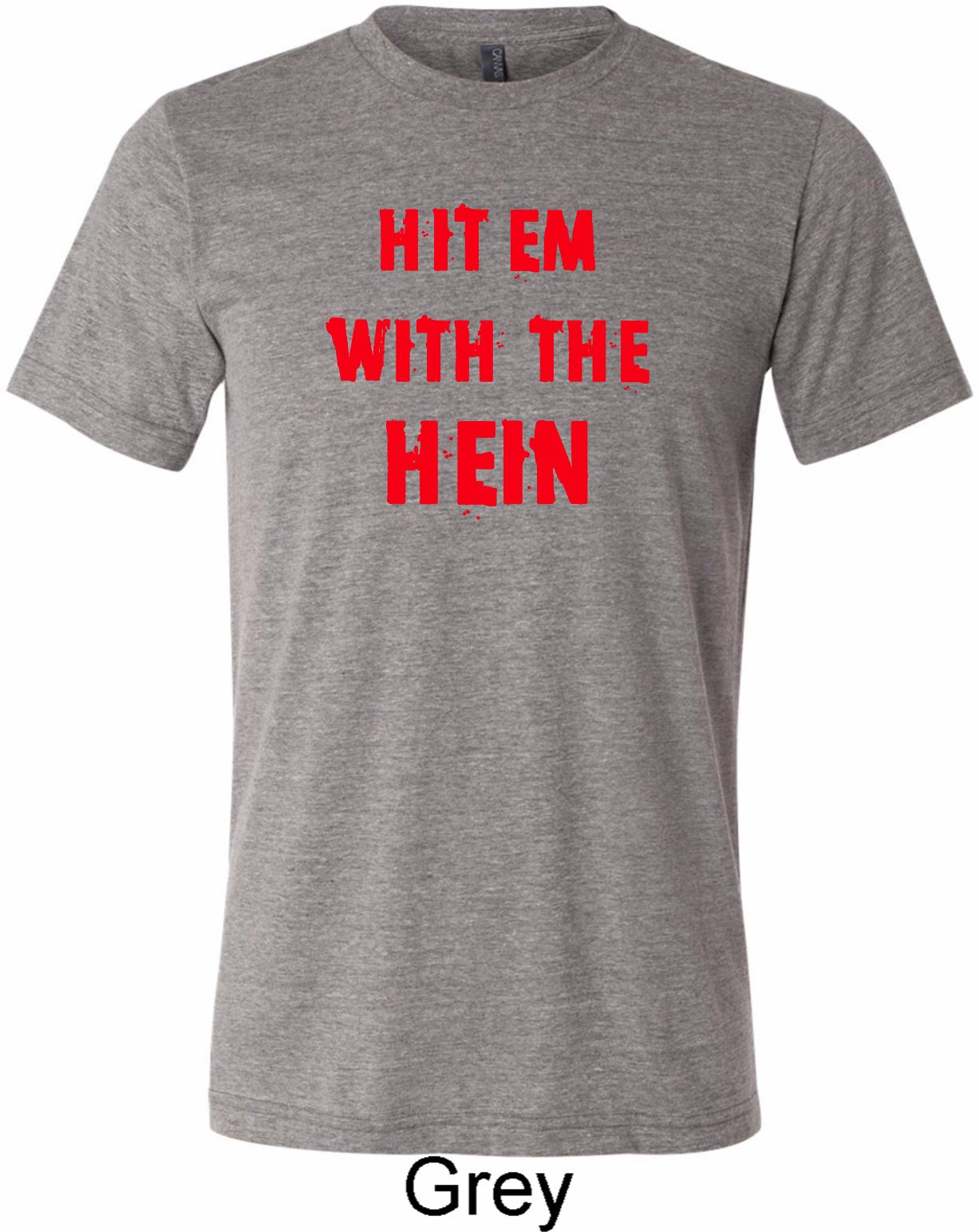 | | Mens Funny Tee Hit em with the Hein Tri Blend TeeA mens tri blend shirt featuring the funny saying Hit 'em with the Hein in red lettering. Our mens shirt is made with a blend of cotton/poly/rayon. Available in sizes Small through 3XL. Machine wash cold with like colors; dry low heat. ![]() |