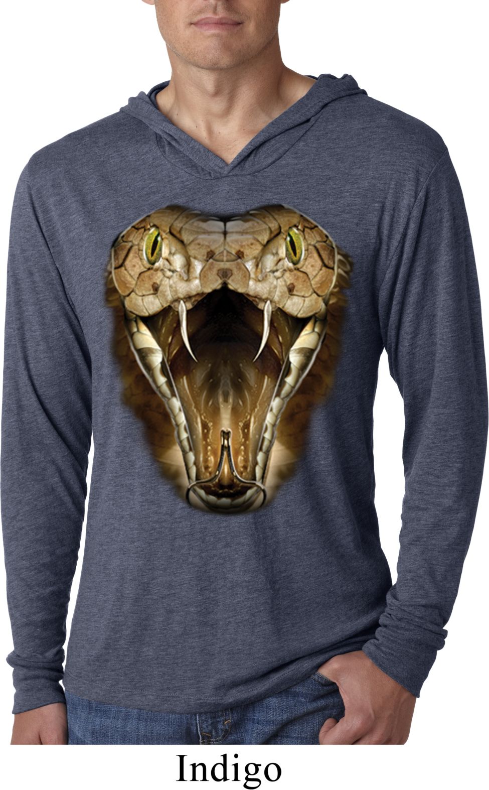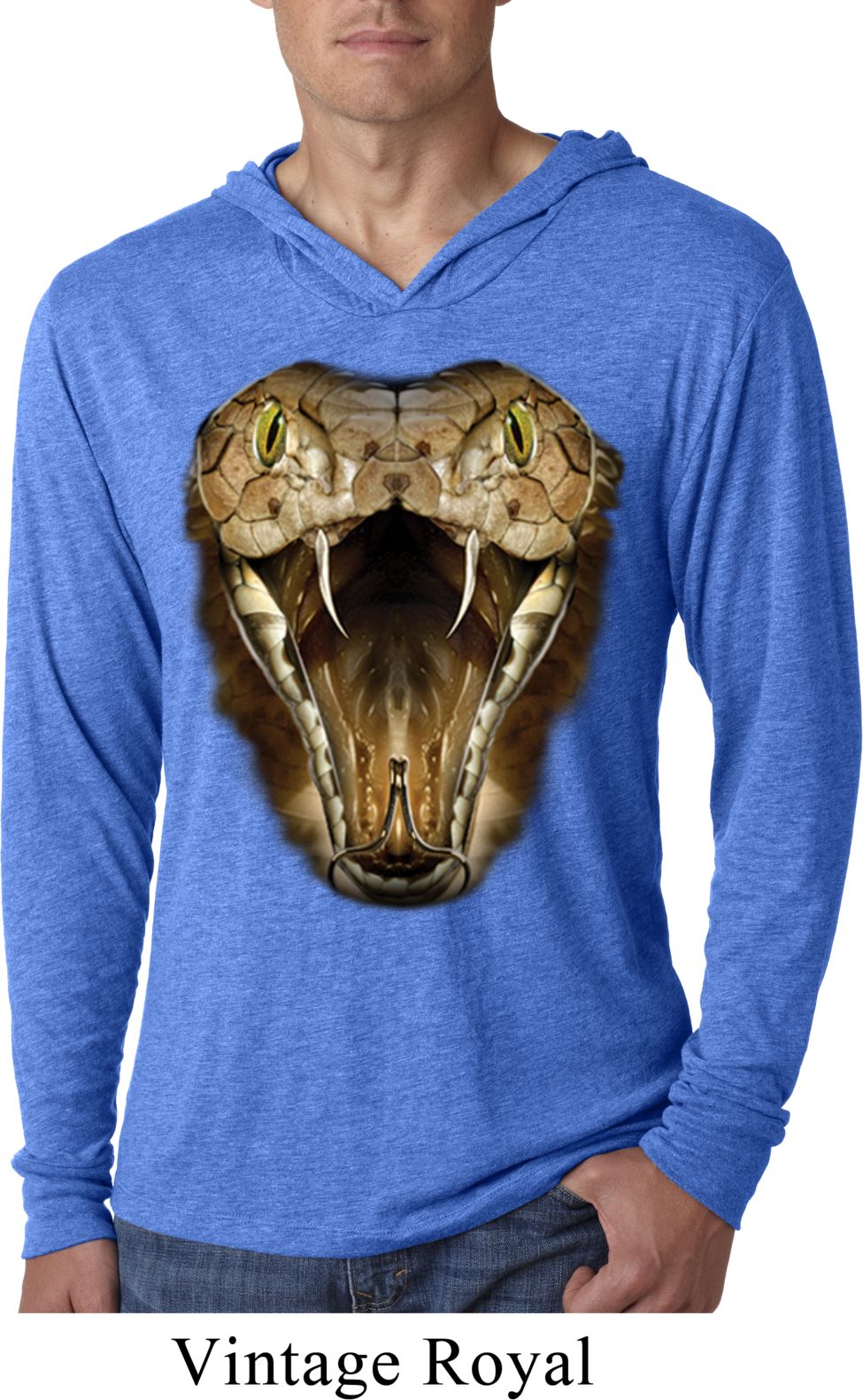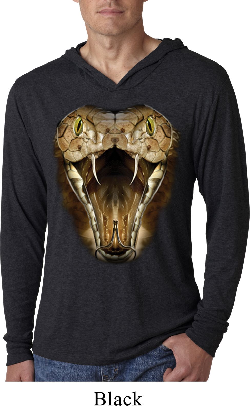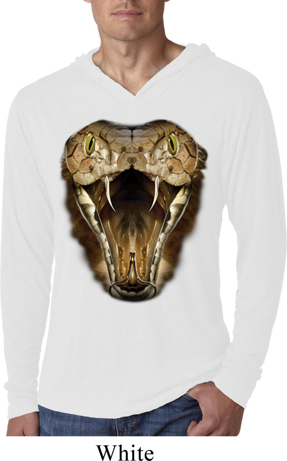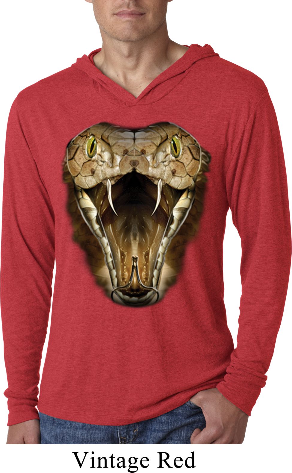 | | Mens Shirt Big Cobra Snake Face Lightweight Hoodie Tee T-ShirtMens Shirt Big Cobra Snake Face Lightweight Hoodie Tee T-Shirt A cotton/poly/rayon blend Available in Small, Medium, Large, XL & 2XL Also available in colors Indigo, Macchiato, Premium Heather, Venetian Grey, Vintage Black, Vintage Navy, Vintage Purple, Vintage Red, Vintage Royal, and White |