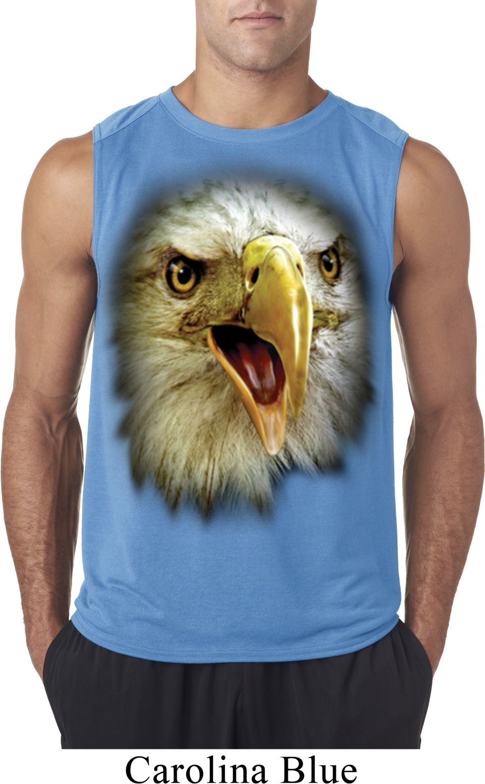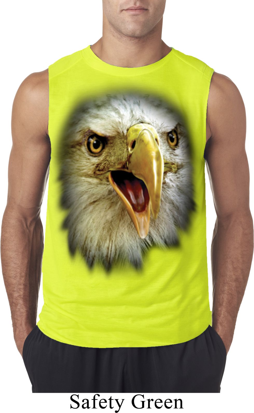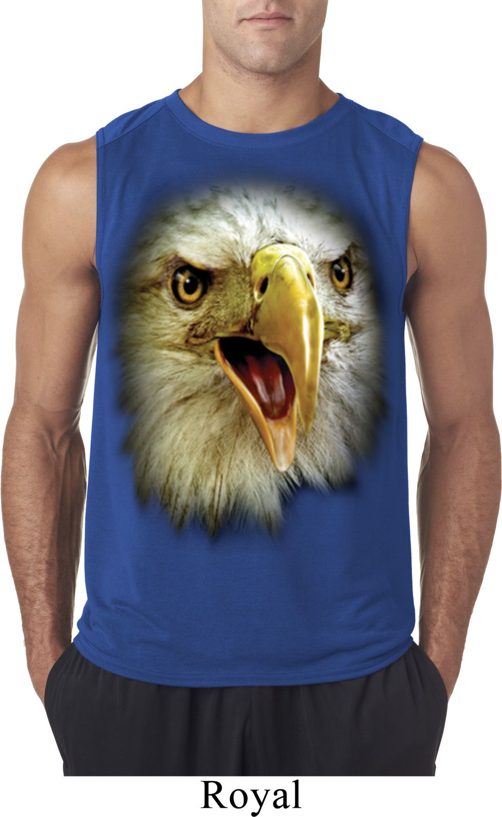 | | Mens Shirt Big Eagle Face Sleeveless Tee T-ShirtMens Shirt Big Eagle Face Sleeveless Tee T-Shirt 100% polyester Athletic heather is a cotton/poly blend Available in Small, Medium, Large, XL & 2XL Also available in colors Black, Carolina Blue, Charcoal, Navy, Red, Royal, Safety Green, and White |