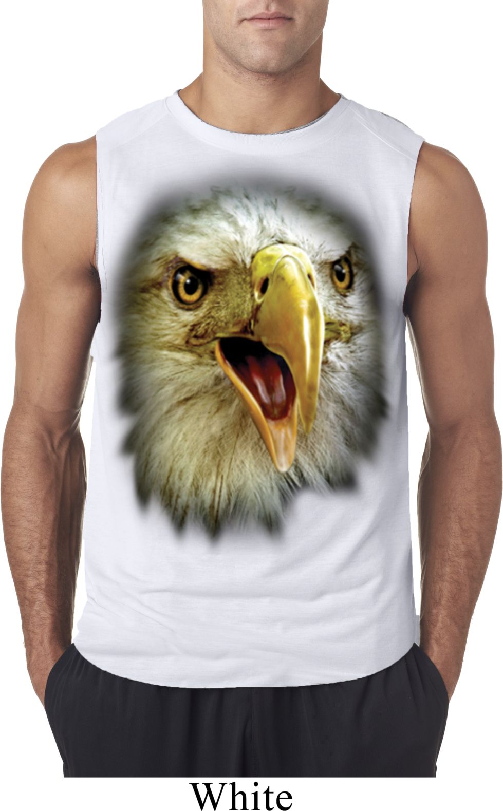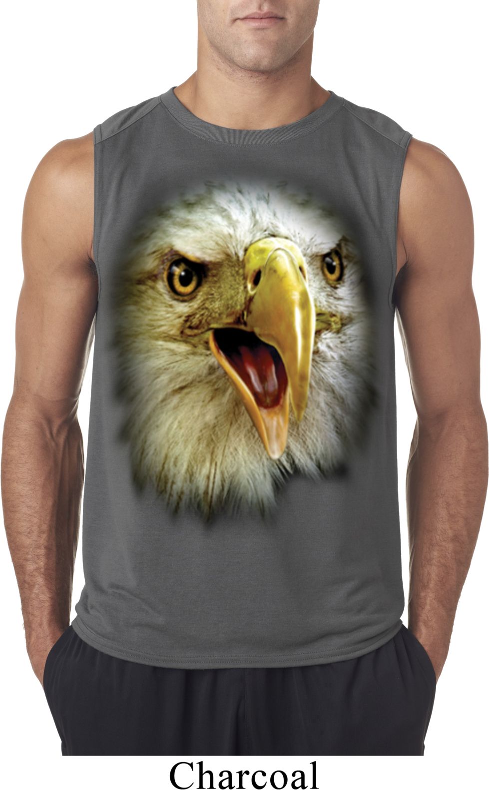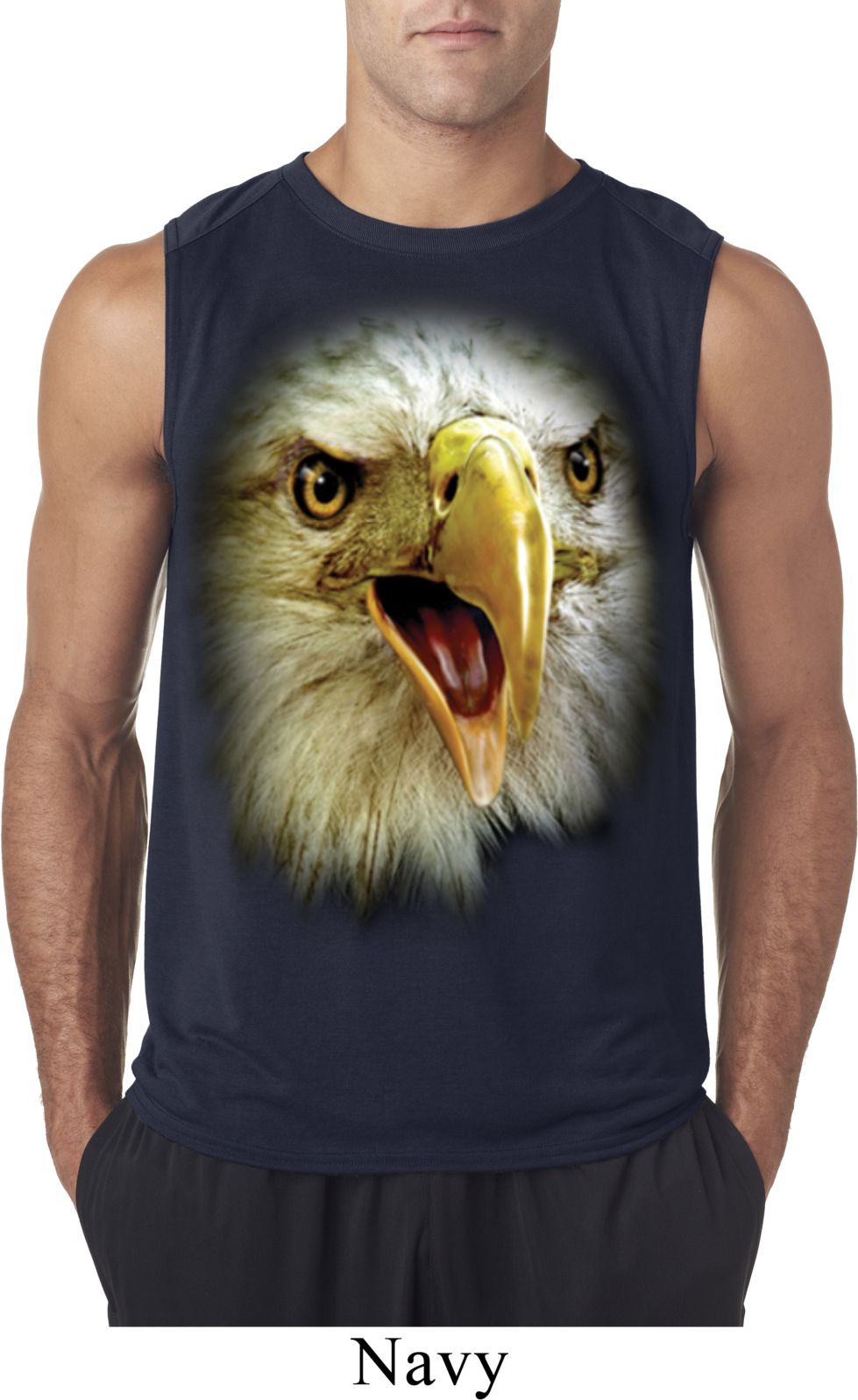 | | Mens Shirt Big Eagle Face Sleeveless Tee T-ShirtMens Shirt Big Eagle Face Sleeveless Tee T-Shirt 100% polyester Athletic heather is a cotton/poly blend Available in Small, Medium, Large, XL & 2XL Also available in colors Black, Carolina Blue, Charcoal, Navy, Red, Royal, Safety Green, and White |