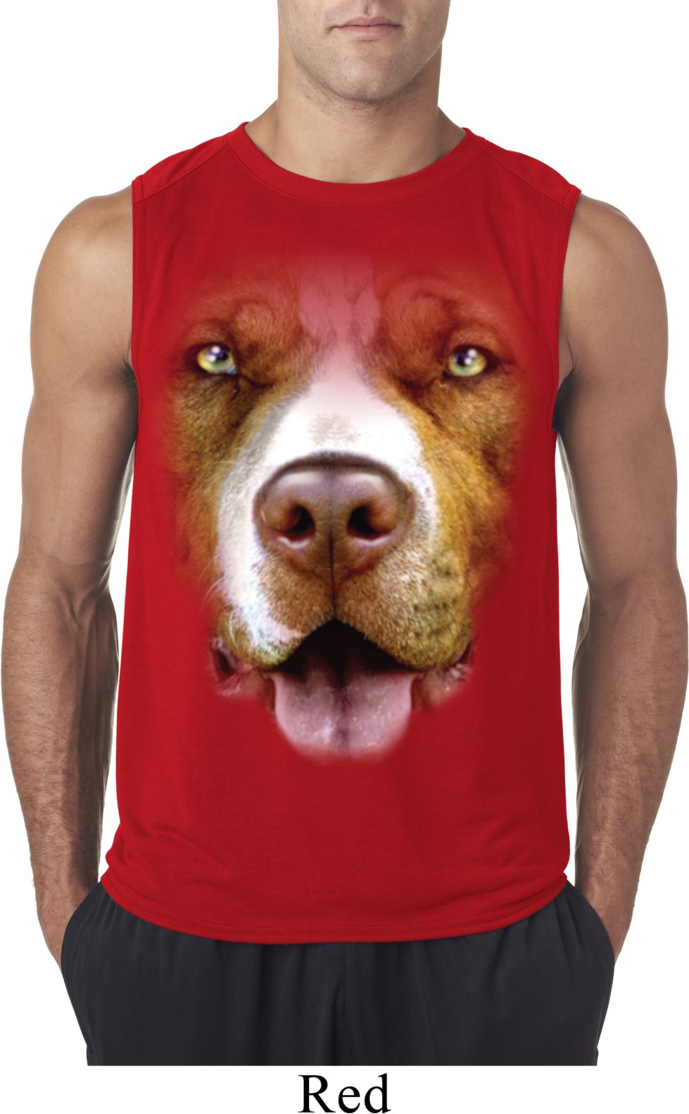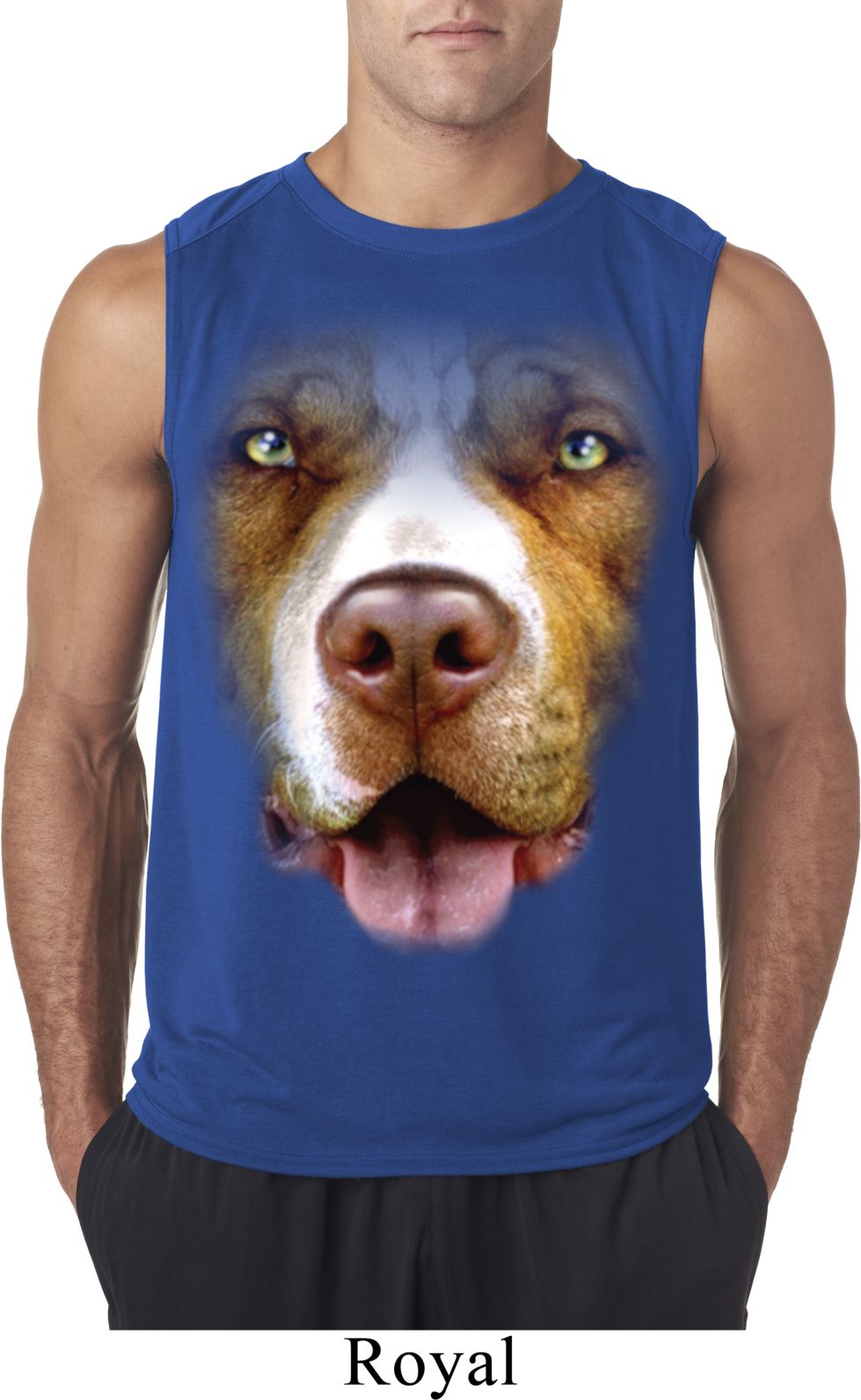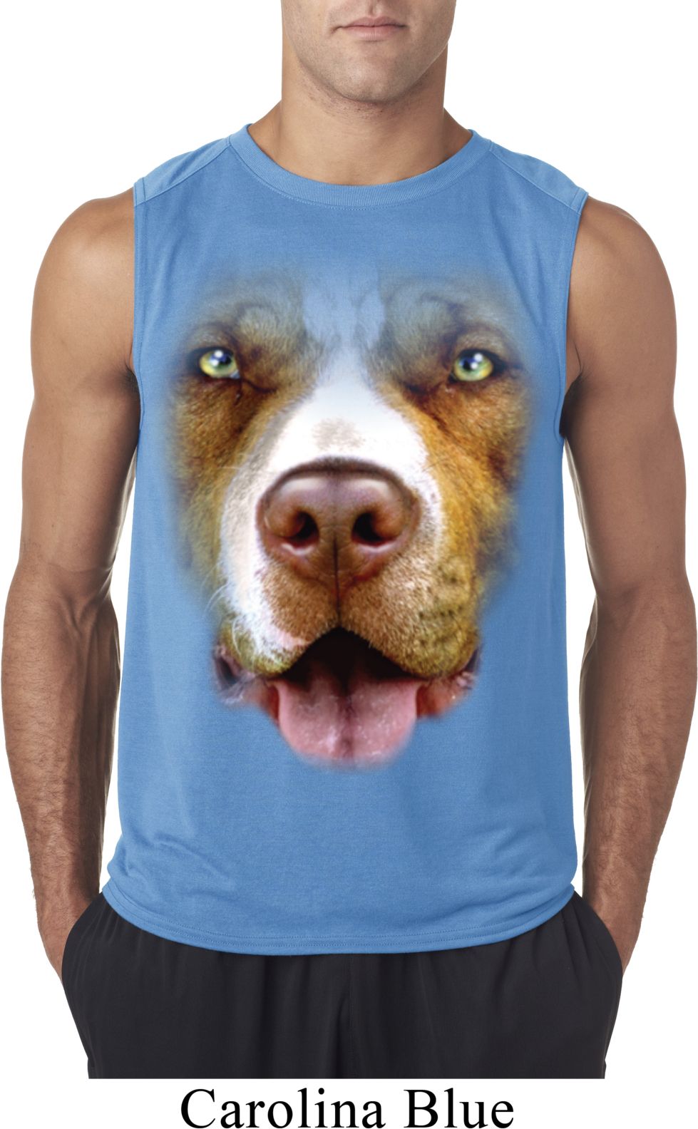 | | Mens Shirt Big Pit Bull Face Sleeveless Tee T-ShirtMens Shirt Big Pit Bull Face Sleeveless Tee T-Shirt 100% polyester Athletic heather is a cotton/poly blend Available in Small, Medium, Large, XL & 2XL Also available in colors Black, Carolina Blue, Charcoal, Navy, Red, Royal, Safety Green, and White |