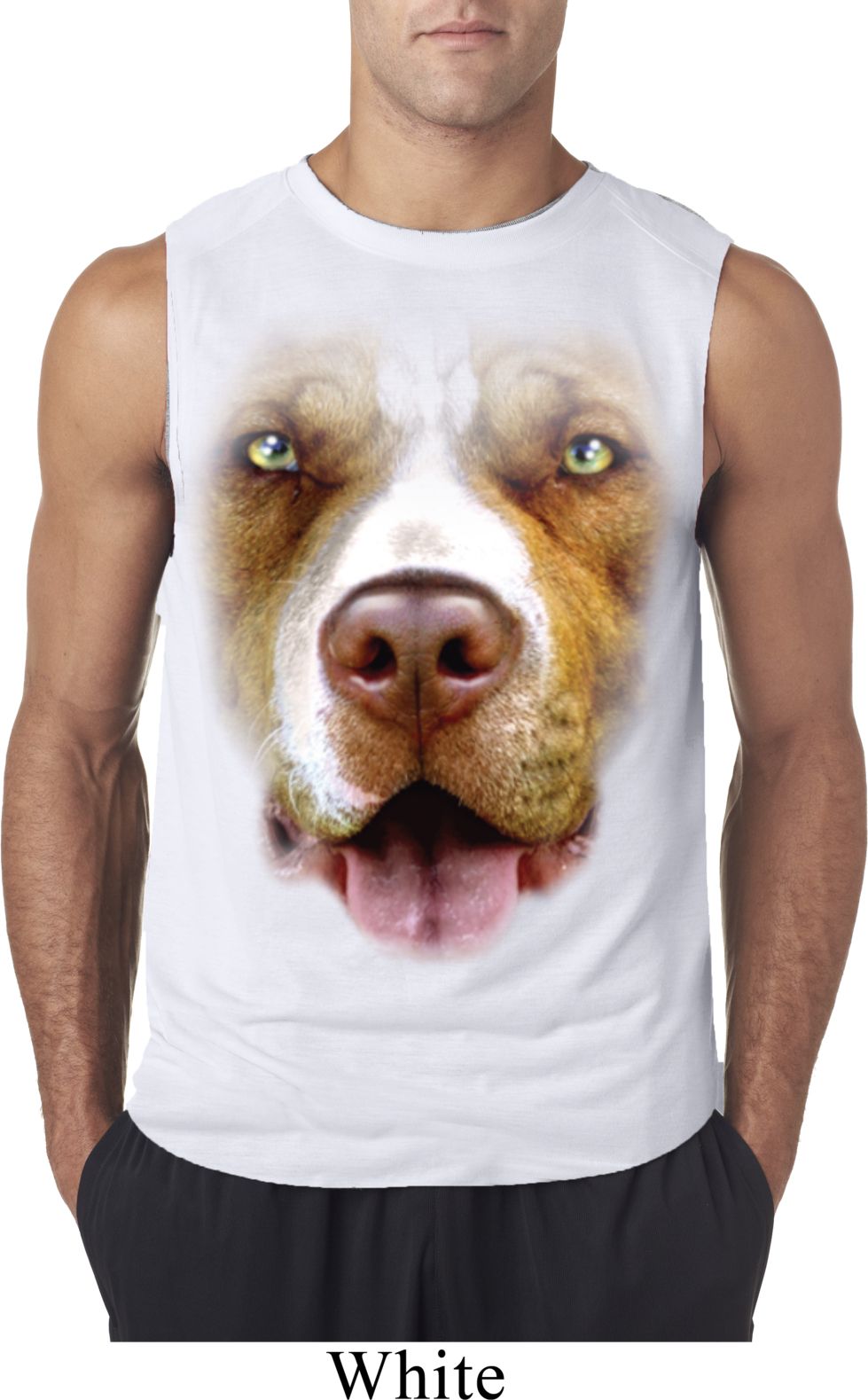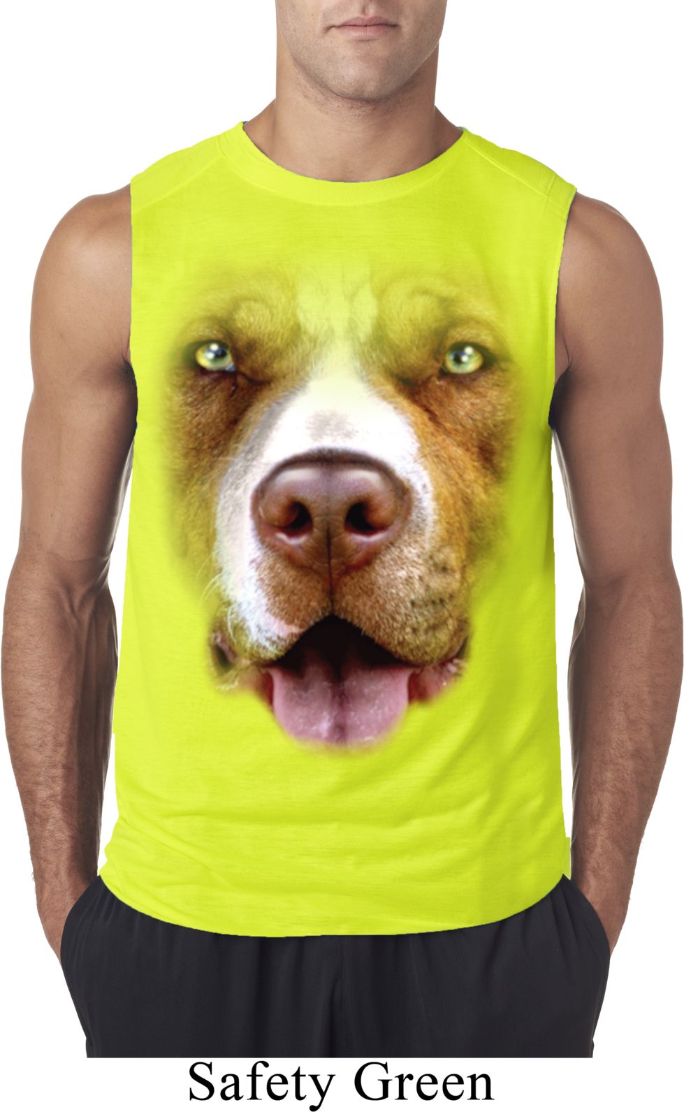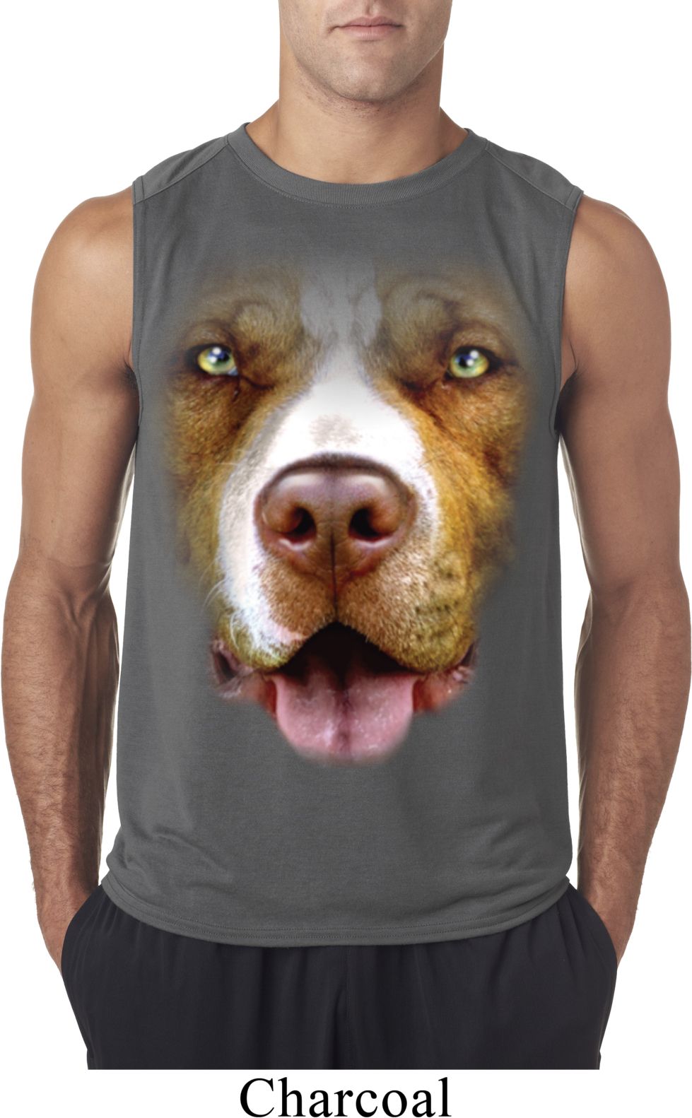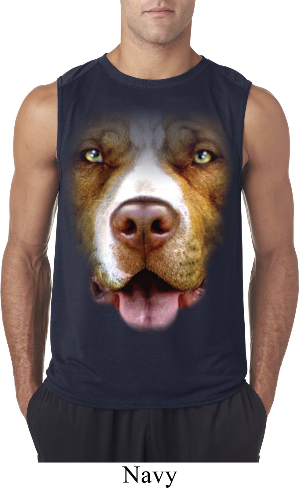 | | Mens Shirt Big Pit Bull Face Sleeveless Tee T-ShirtMens Shirt Big Pit Bull Face Sleeveless Tee T-Shirt 100% polyester Athletic heather is a cotton/poly blend Available in Small, Medium, Large, XL & 2XL Also available in colors Black, Carolina Blue, Charcoal, Navy, Red, Royal, Safety Green, and White |
