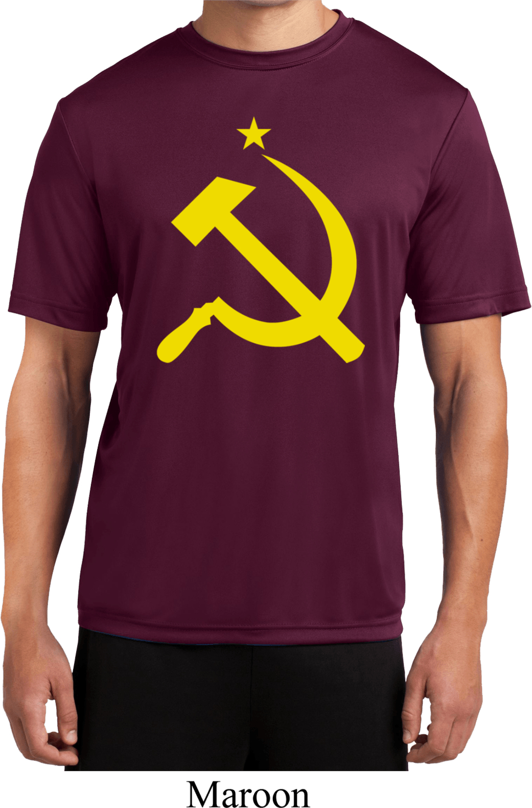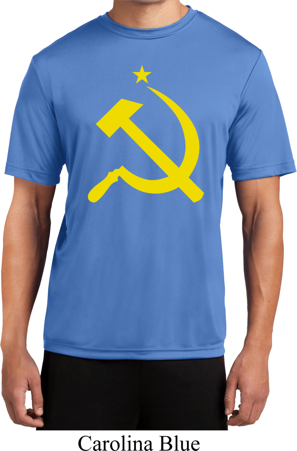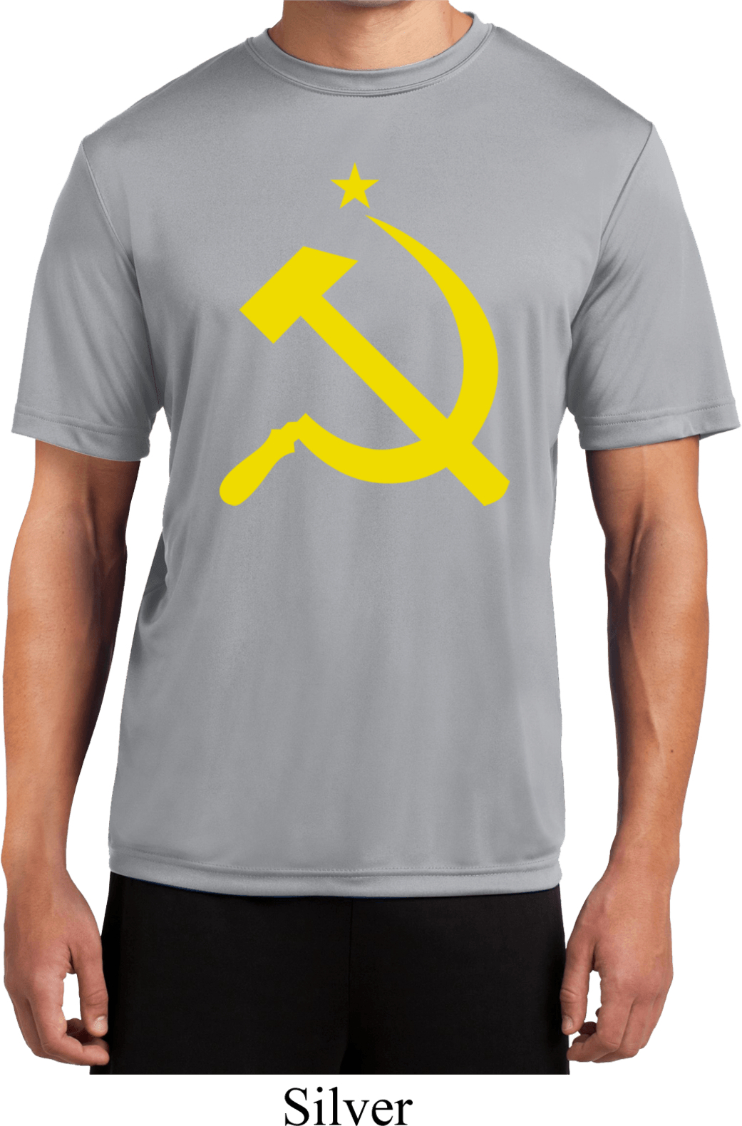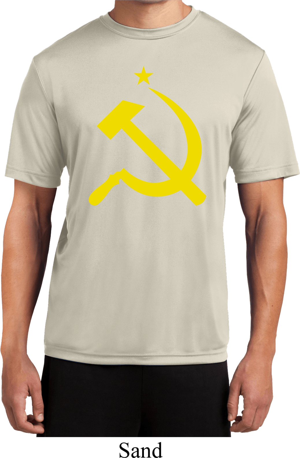 | | Mens Soviet Shirt Yellow Hammer And Sickle Moisture Wicking TeeMens Soviet Shirt Yellow Hammer And Sickle Moisture Wicking Tee 100% polyester Available in Small, Medium, Large, XL, 2XL, 3XL & 4XL Also available in colors Black, Cardinal, Carolina Blue, Deep Orange, Forest, Kelly, Maroon, Navy, Purple, Red, Royal, Sand, Silver, Tropic Blue, and White |